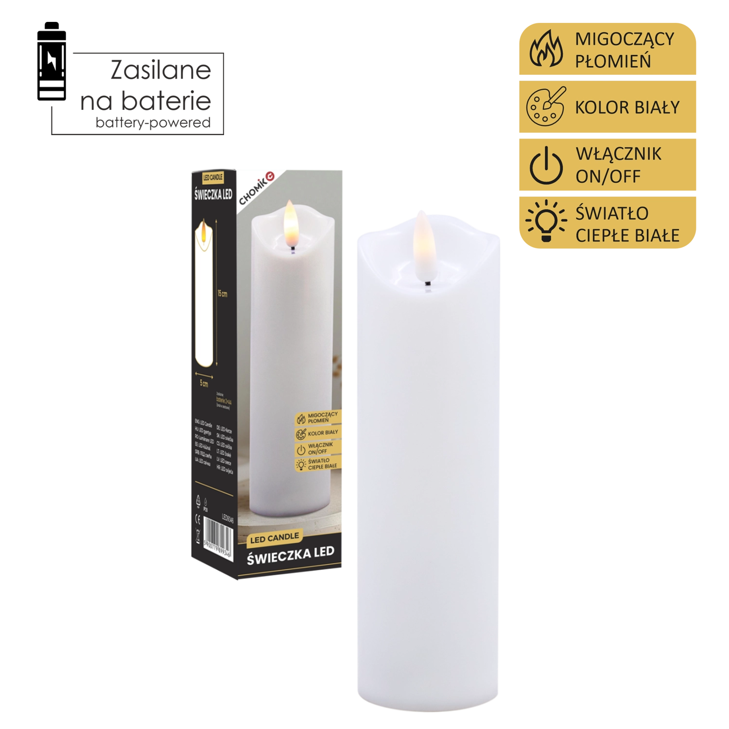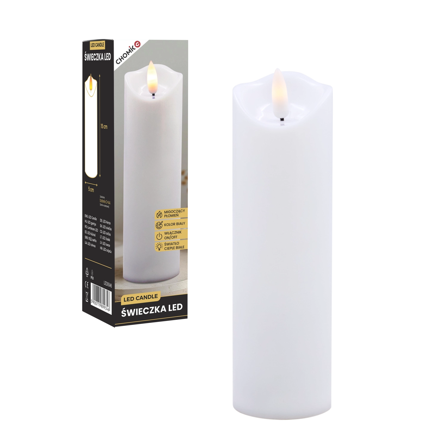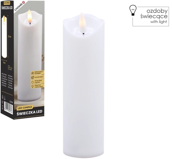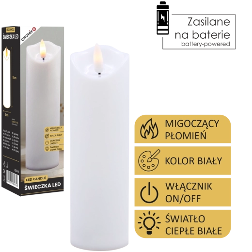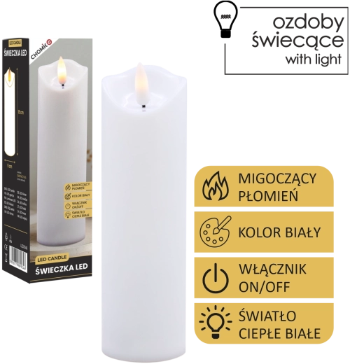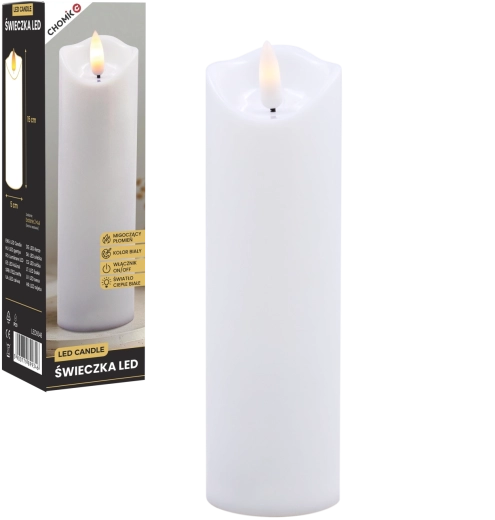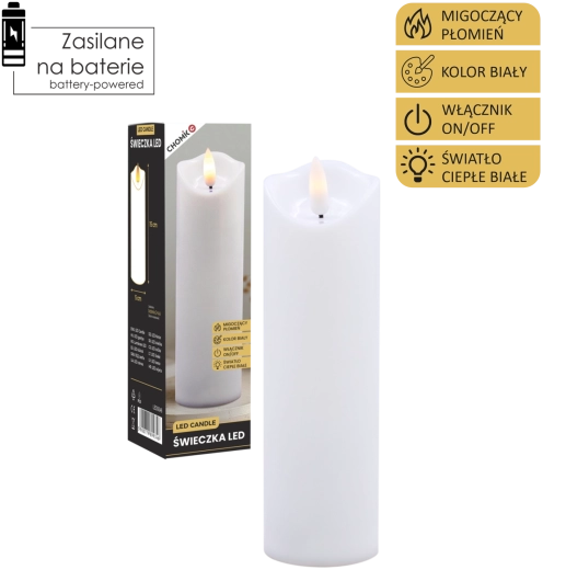 Ta realistyczna biała świeca LED oferuje efekt delikatnie migoczącego ciepłego światła, które wiernie naśladuje płomień bez ryzyka otwartego ognia. Idealna do dekoracji domu, odświętnego stołu, wieczorów relaksu oraz jako bezpieczna alternatywa w domach z dziećmi i zwierzętami.