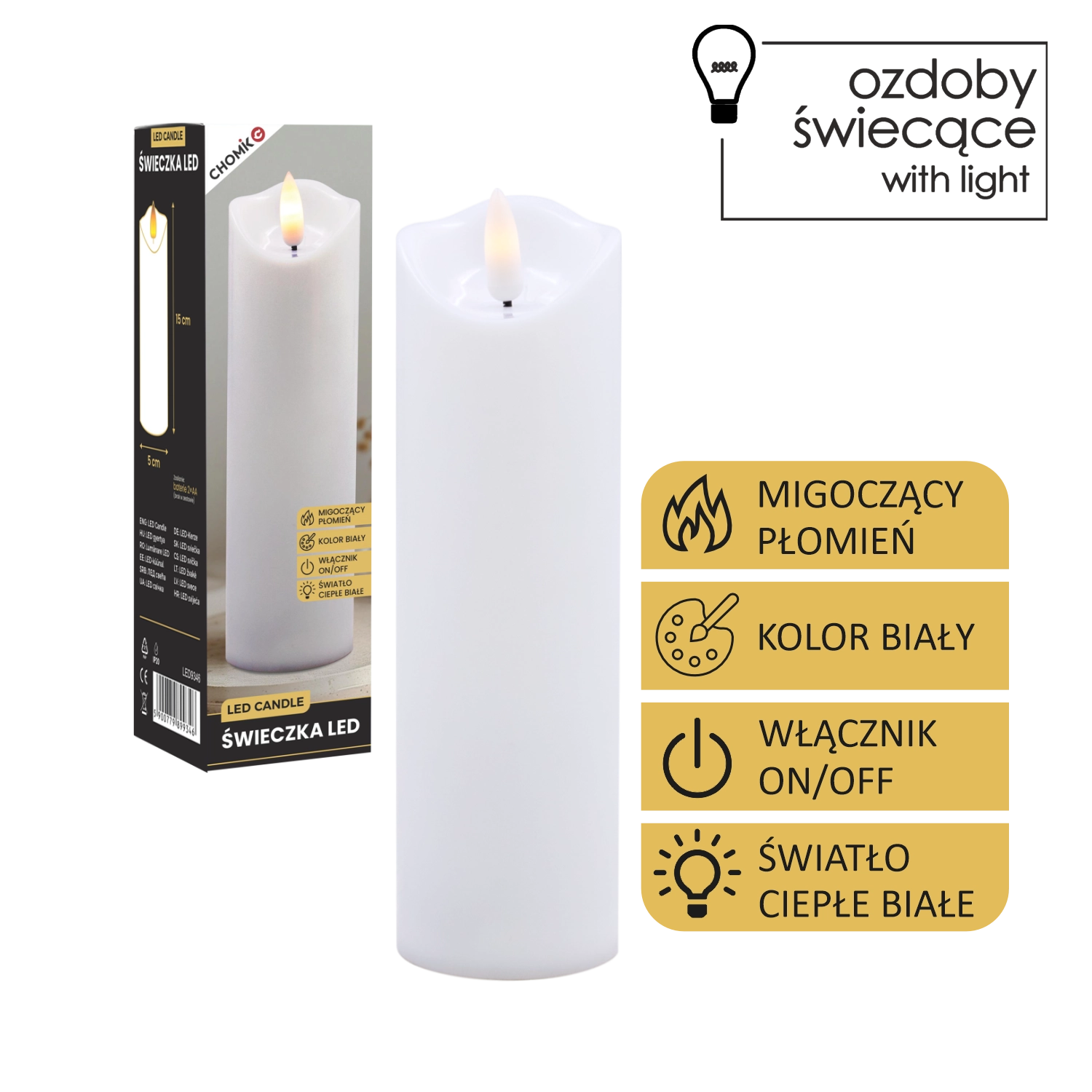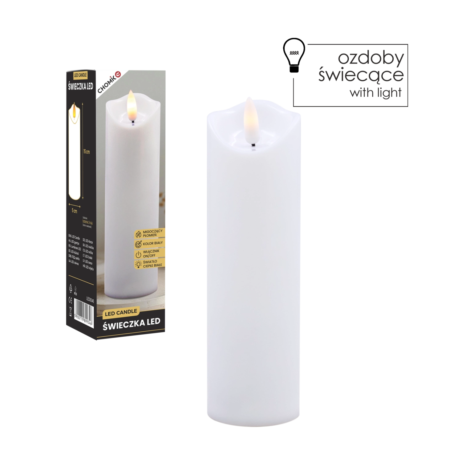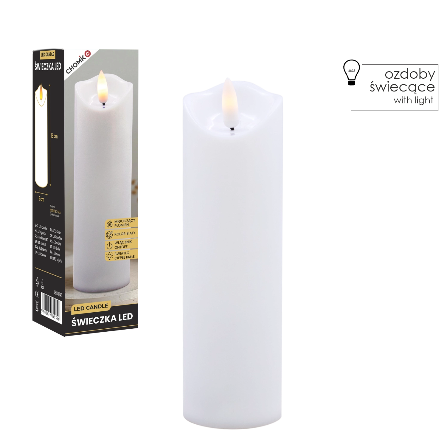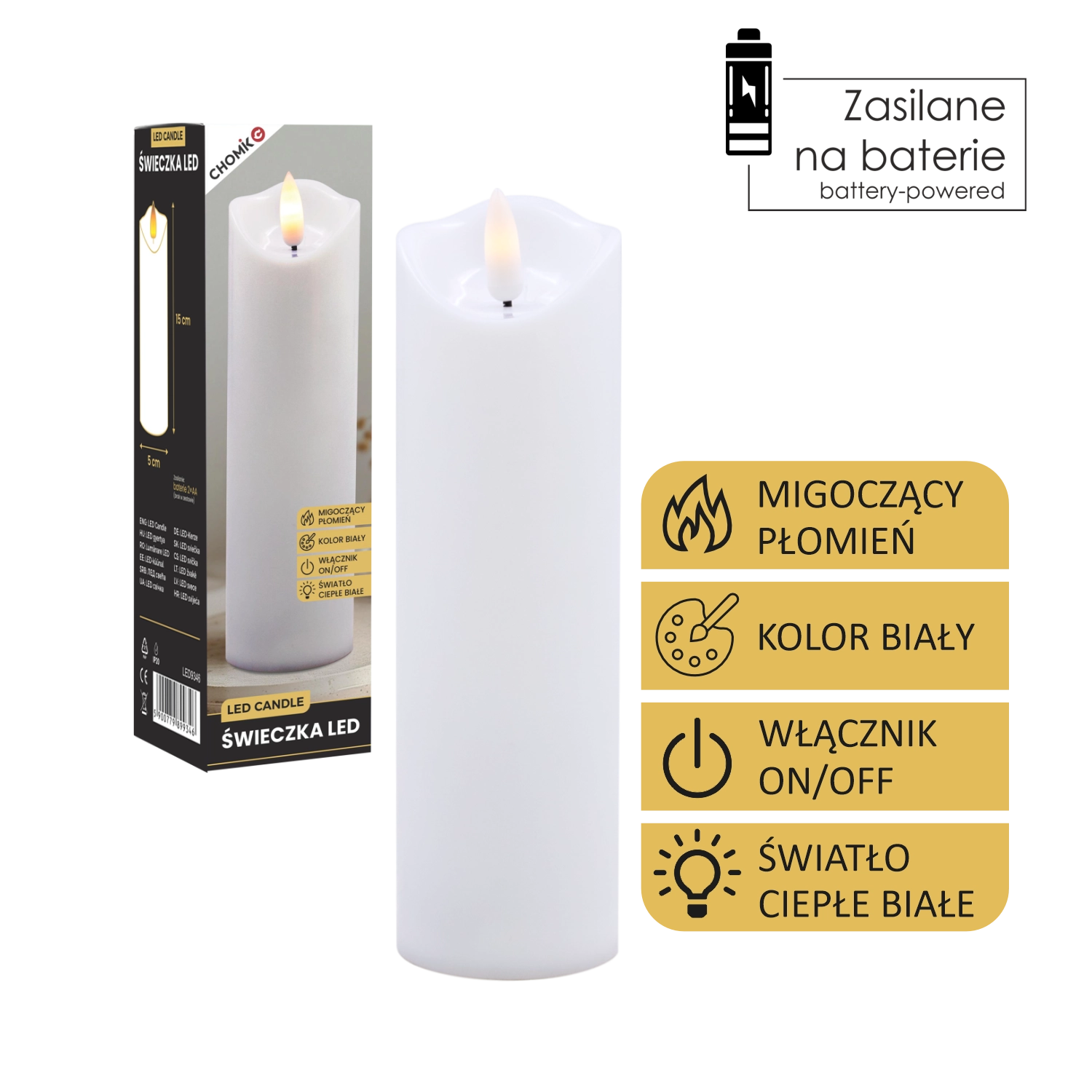Ta realistyczna biała świeca LED oferuje efekt delikatnie migoczącego ciepłego światła, które wiernie naśladuje płomień bez ryzyka otwartego ognia. Idealna do dekoracji domu, odświętnego stołu, wieczorów relaksu oraz jako bezpieczna alternatywa w domach z dziećmi i zwierzętami.