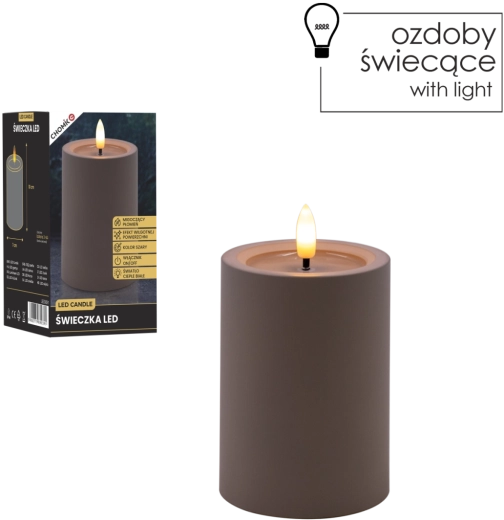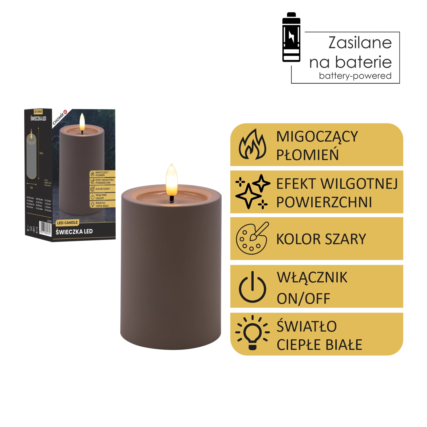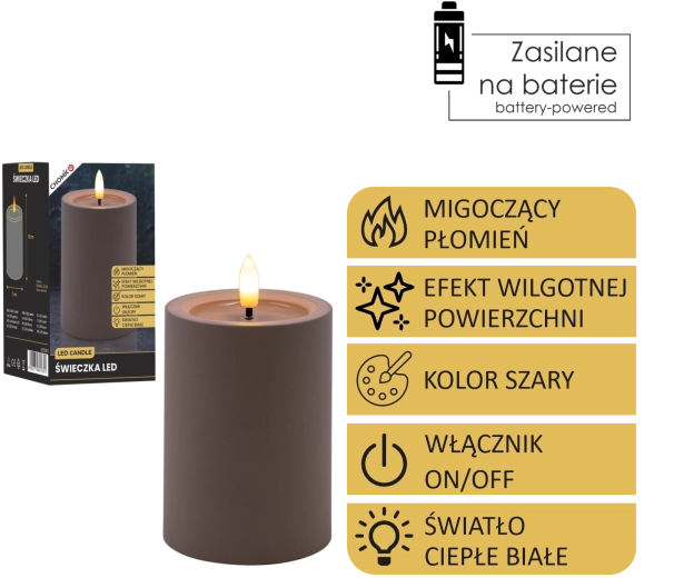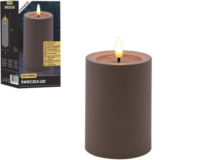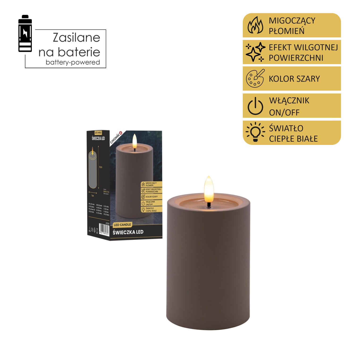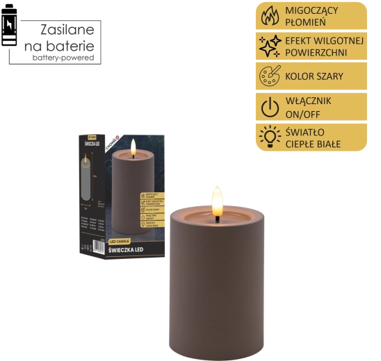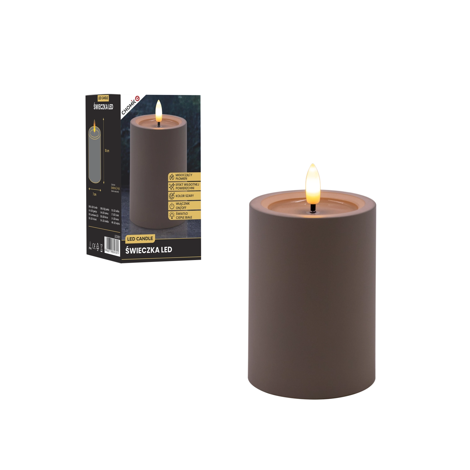 Stylowa szara świeca LED o wymiarach 7 × 10 cm tworzy przytulny nastrój dzięki ciepłemu migoczącemu płomyczkowi oraz realistycznemu efektowi wilgotnej górnej warstwy. Doskonale pasuje do salonu, sypialni oraz na odświętny stół. Bezpieczna i bezdymna, zasilana 2× AA (baterie nie są dołączone) z prostą funkcją On/Off.