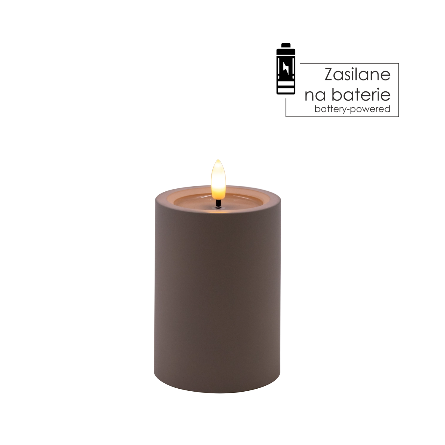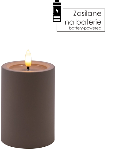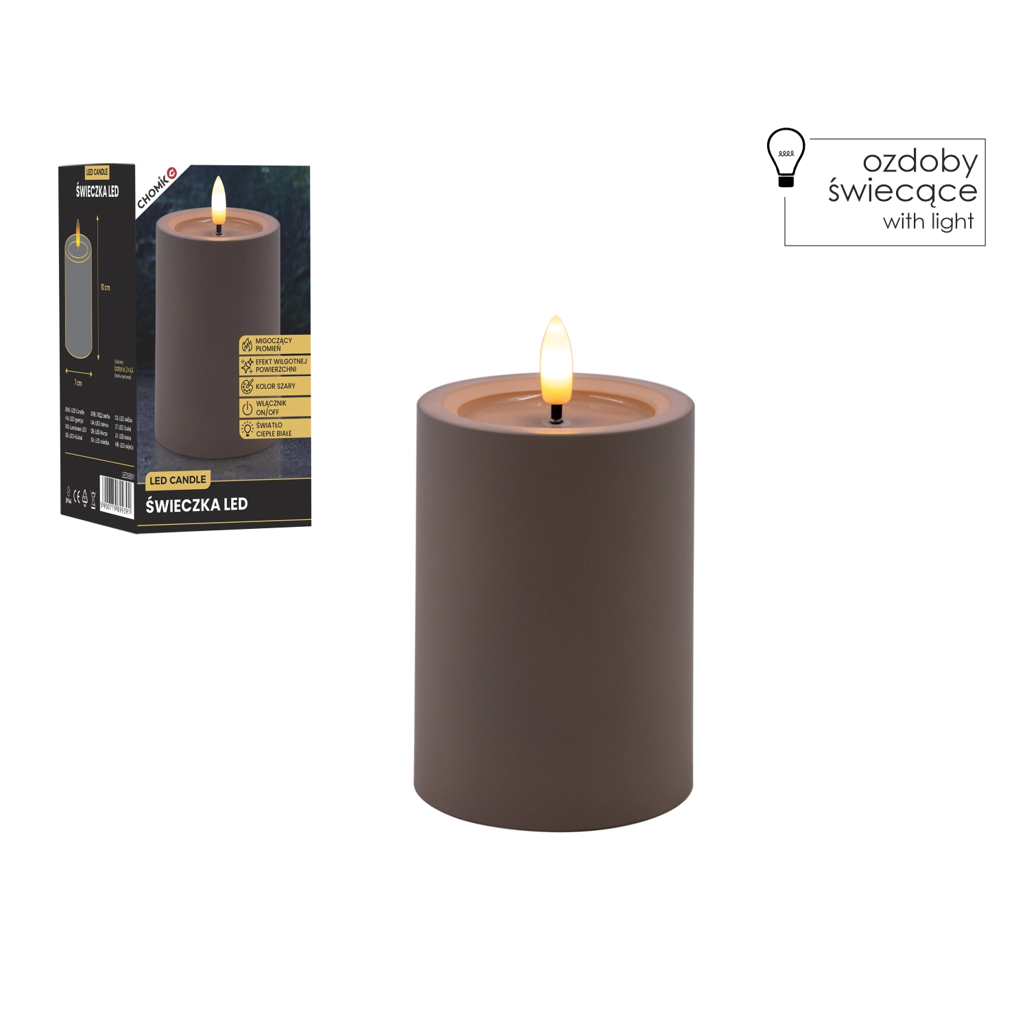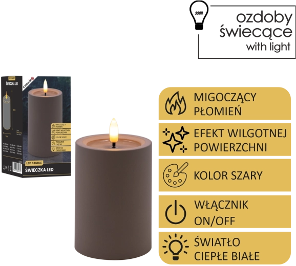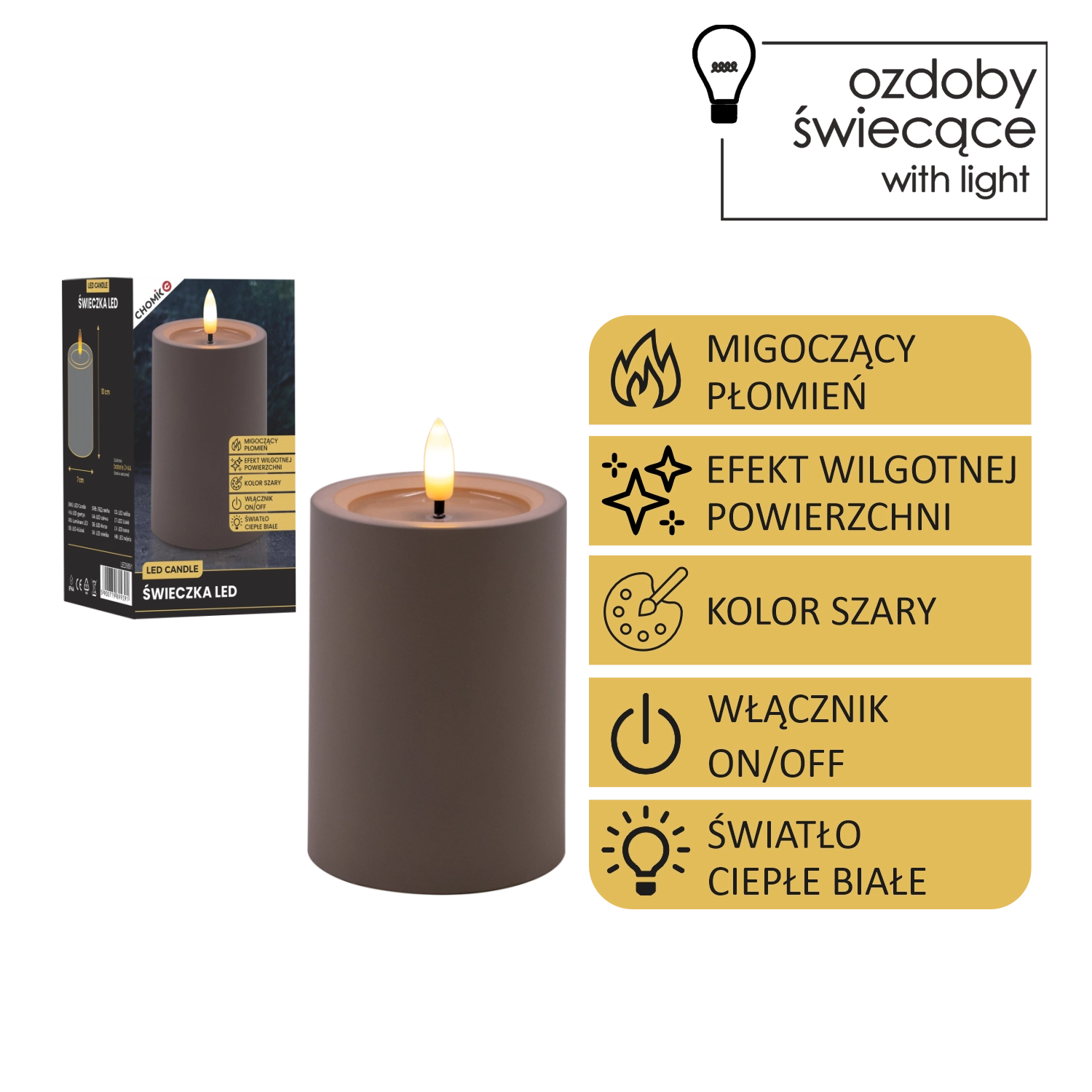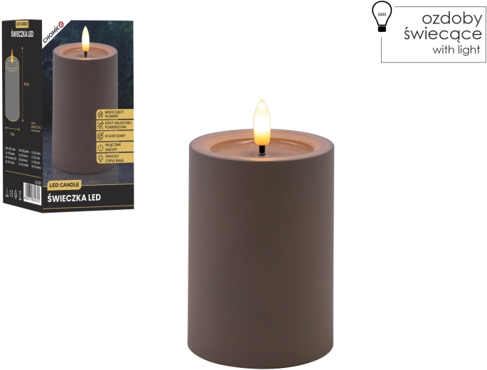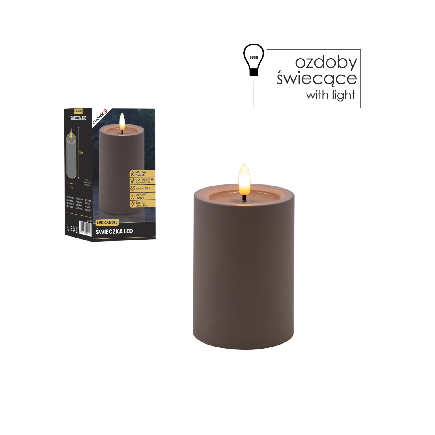 Stylowa szara świeca LED o wymiarach 7 × 10 cm tworzy przytulny nastrój dzięki ciepłemu migoczącemu płomyczkowi oraz realistycznemu efektowi wilgotnej górnej warstwy. Doskonale pasuje do salonu, sypialni oraz na odświętny stół. Bezpieczna i bezdymna, zasilana 2× AA (baterie nie są dołączone) z prostą funkcją On/Off.