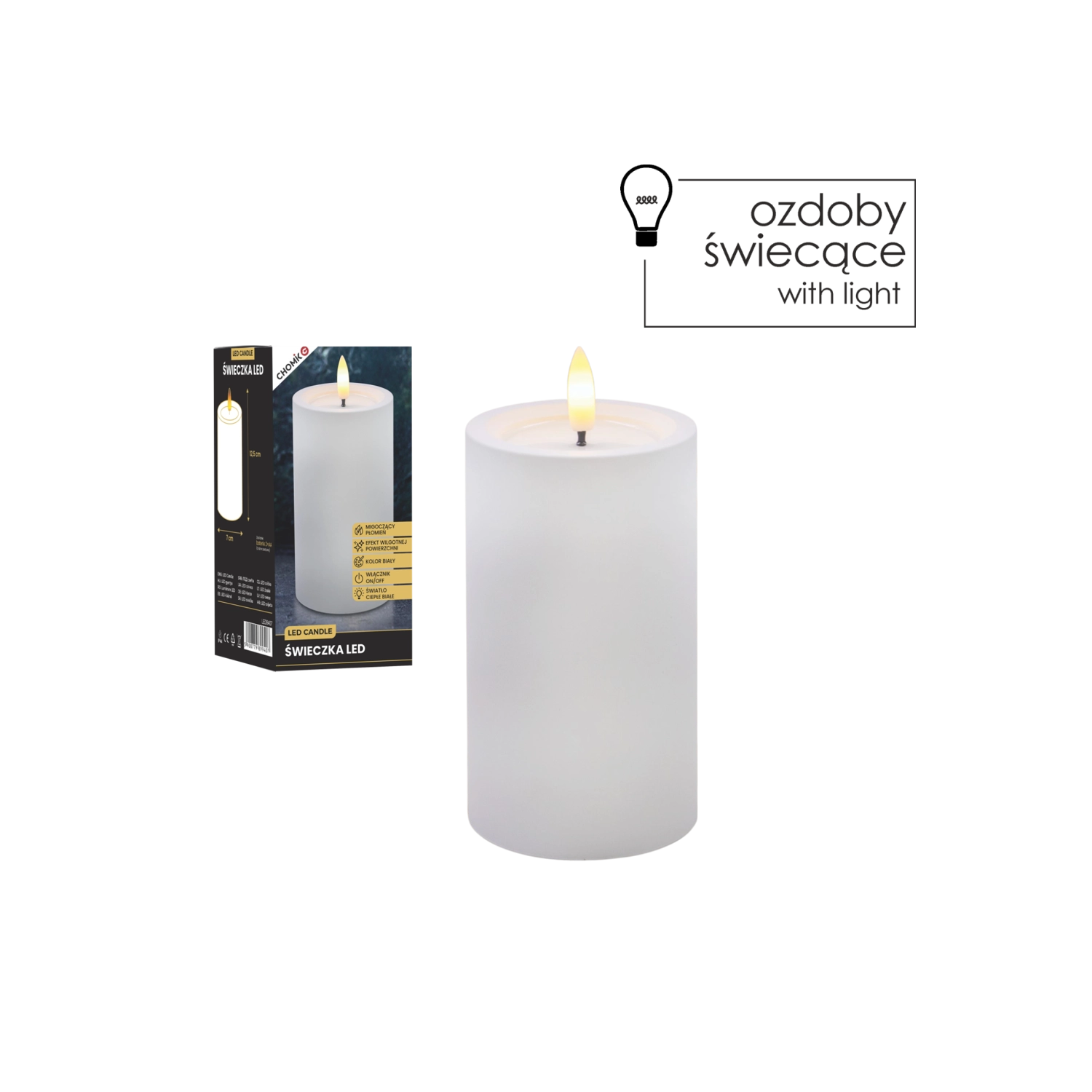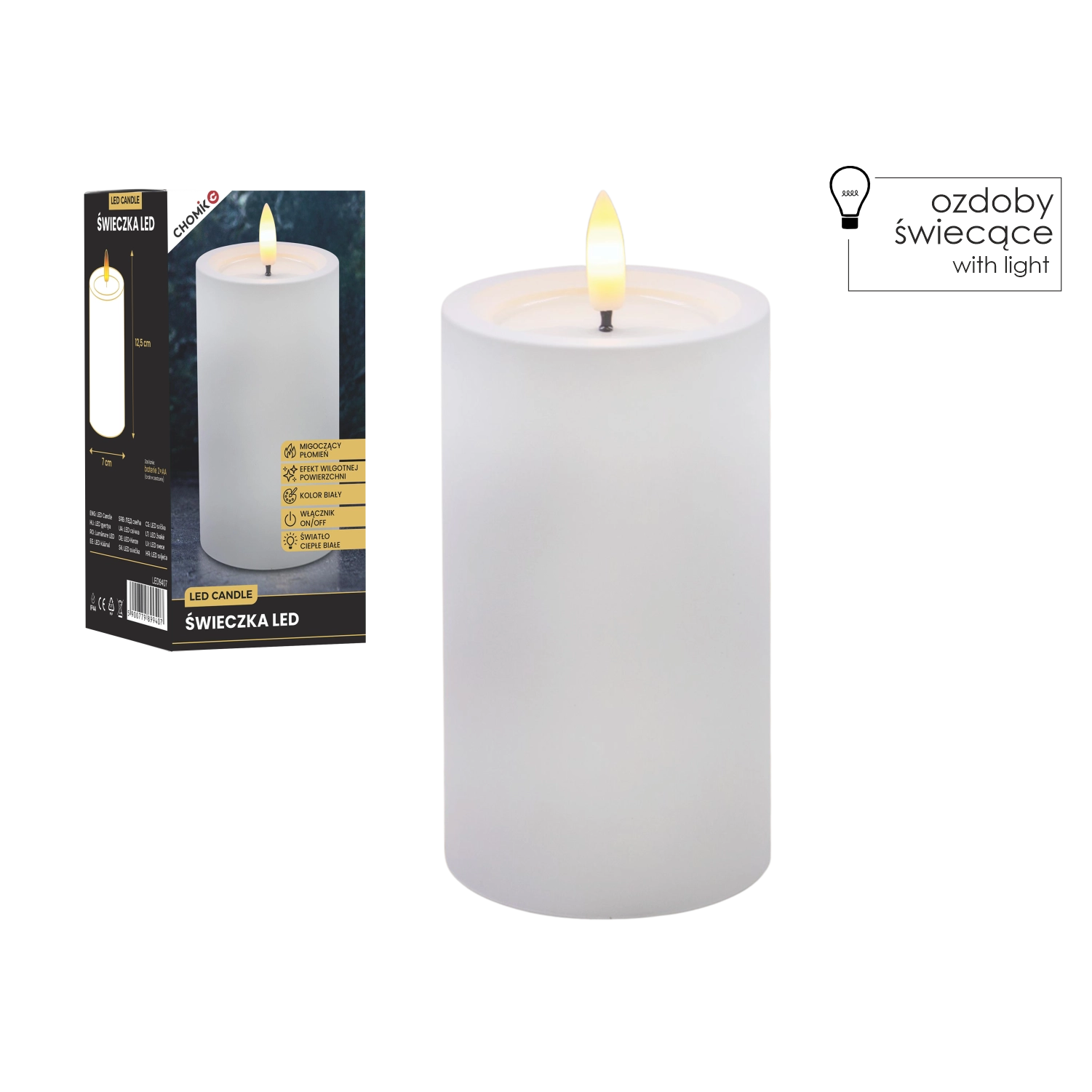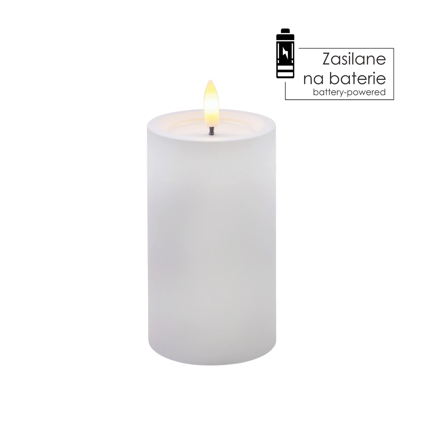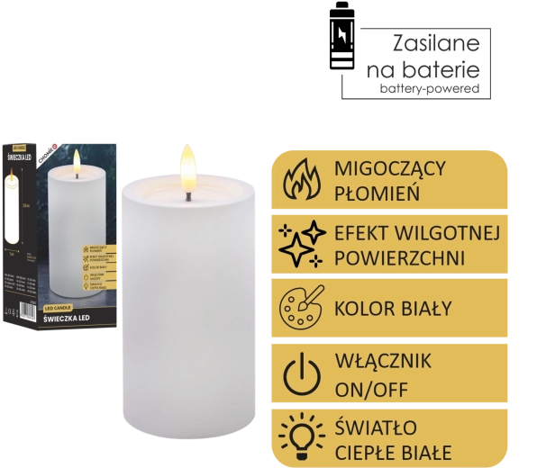 Ta realistycznie wykonana świeca LED w białym kolorze zapewnia przytulne światło ciepłej bieli z wiernym efektem migoczącego płomyka. Dzięki specjalnej powierzchni z efektem wilgotnej górnej krawędzi wygląda jak prawdziwy wosk, ale bez kapania, dymu i ryzyka otwartego ognia.