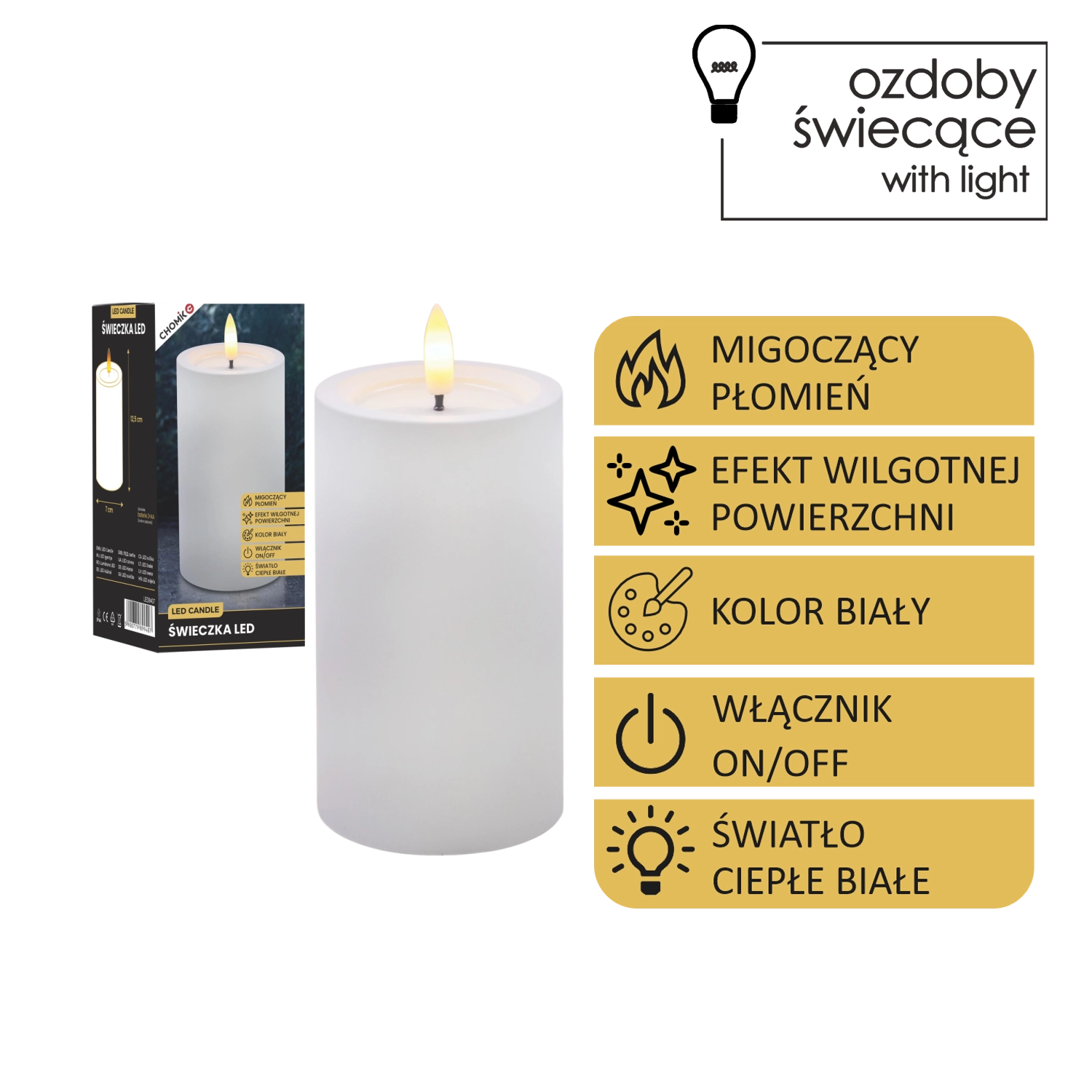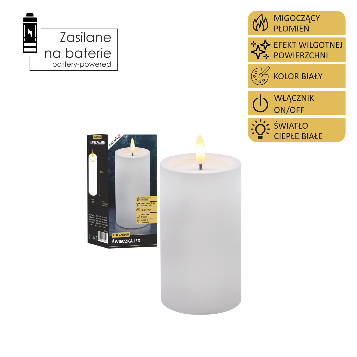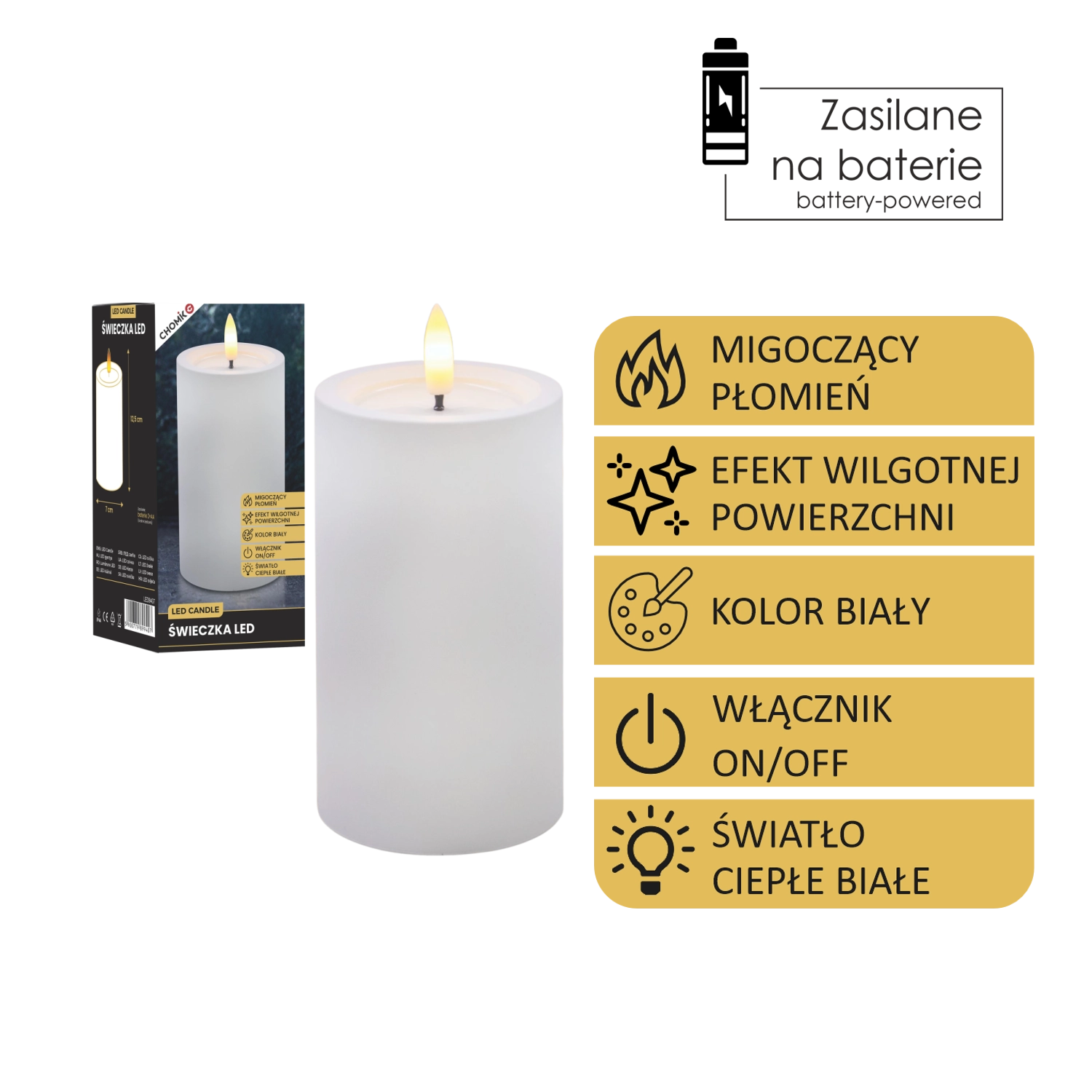 Ta realistycznie wykonana świeca LED w białym kolorze zapewnia przytulne światło ciepłej bieli z wiernym efektem migoczącego płomyka. Dzięki specjalnej powierzchni z efektem wilgotnej górnej krawędzi wygląda jak prawdziwy wosk, ale bez kapania, dymu i ryzyka otwartego ognia.