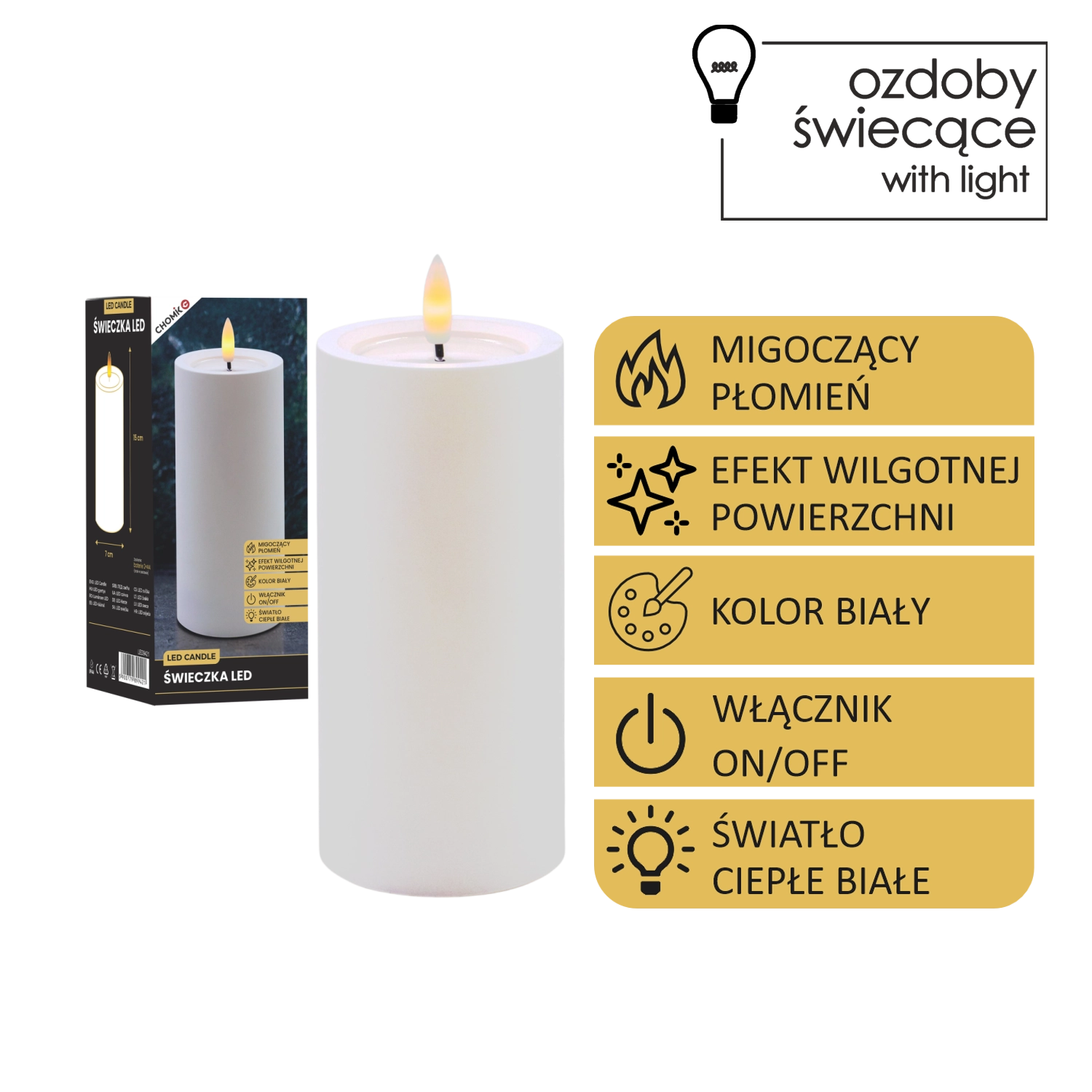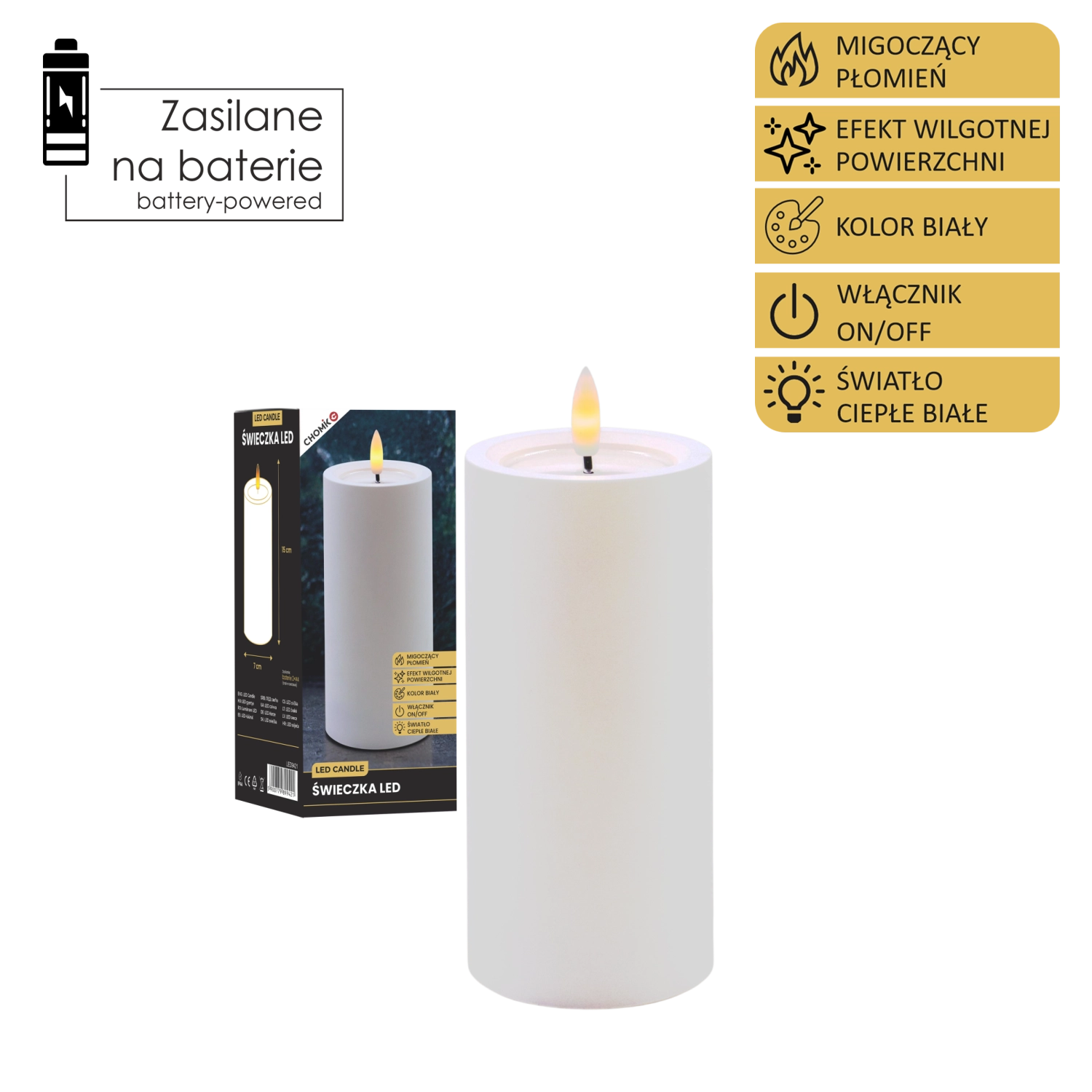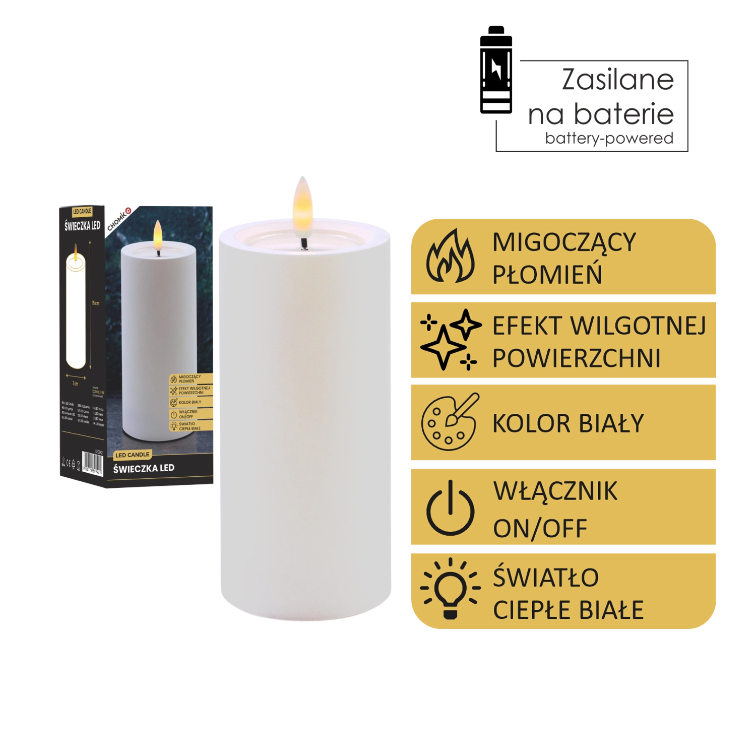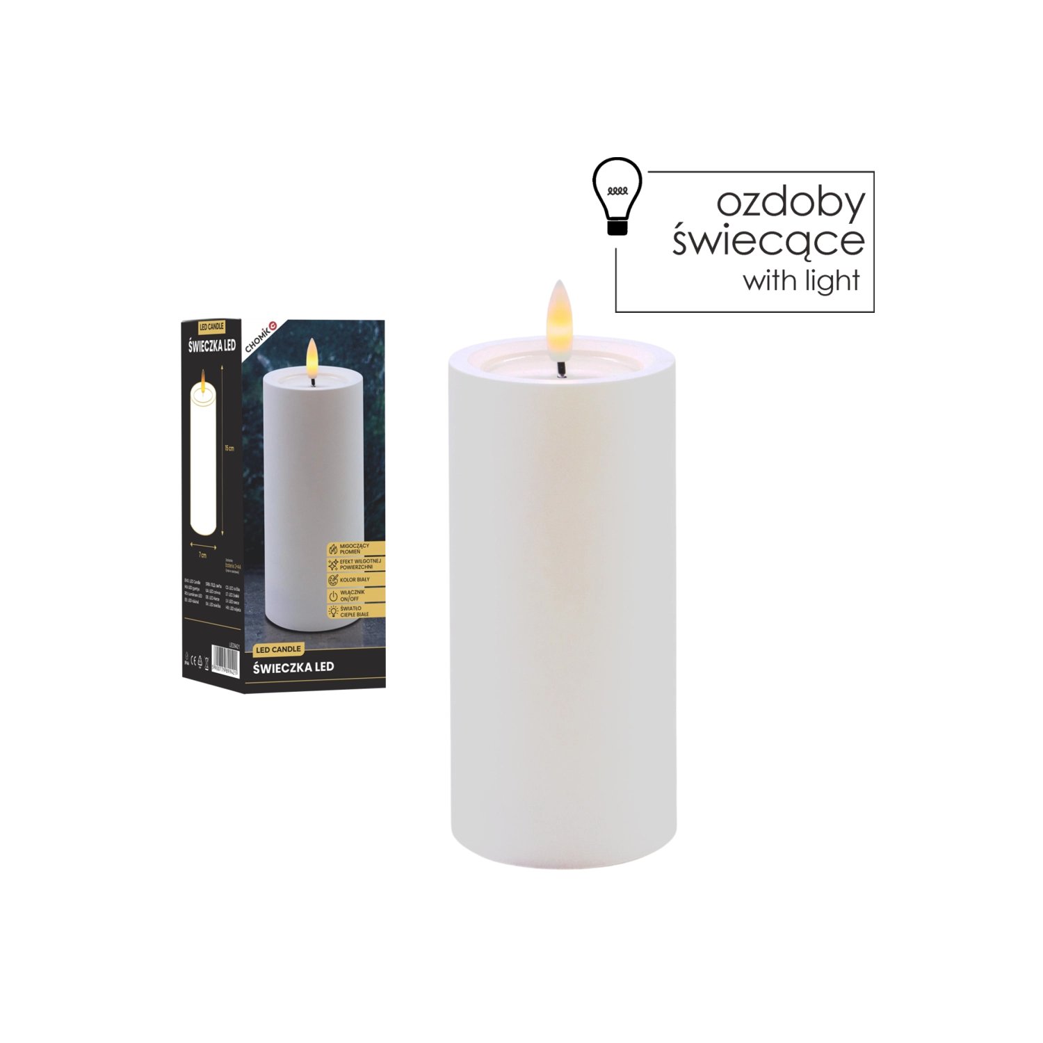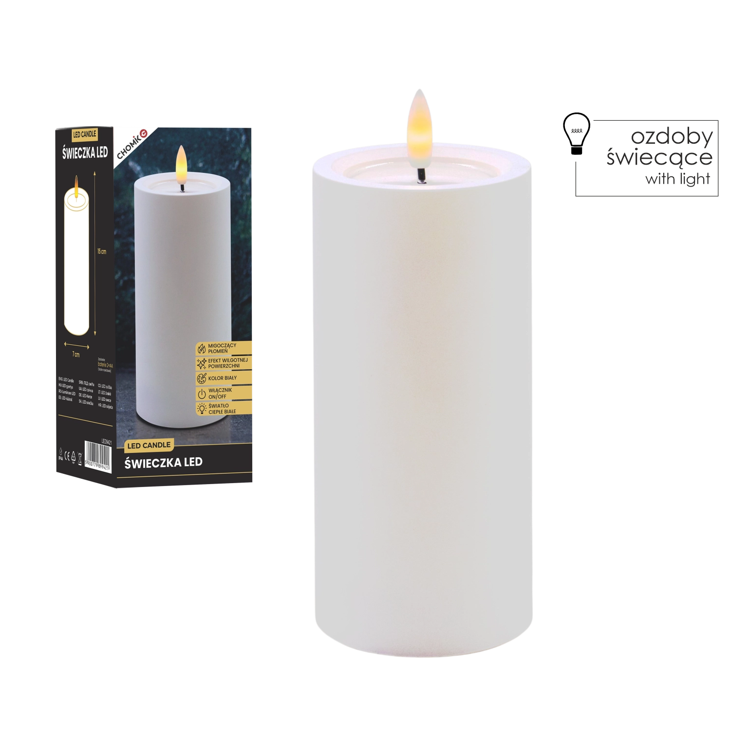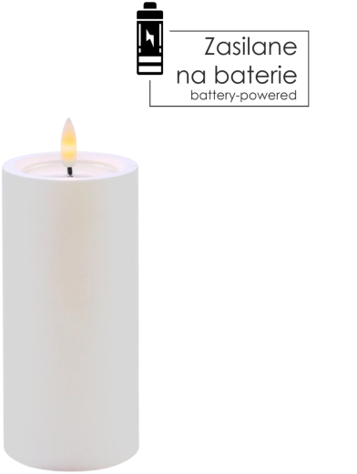 Elegancka biała świeca LED o wymiarach 7 × 15 cm oferuje realistyczny, migoczący płomień w ciepłej bieli oraz efektowny efekt wilgotnej górnej krawędzi. Doskonale uzupełni dekoracje wnętrz bez dymu i bałaganu.