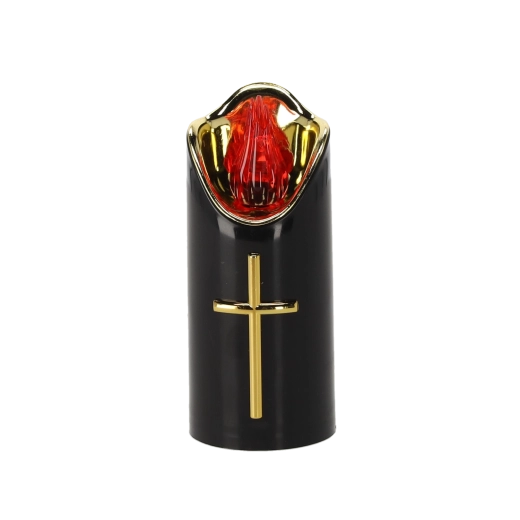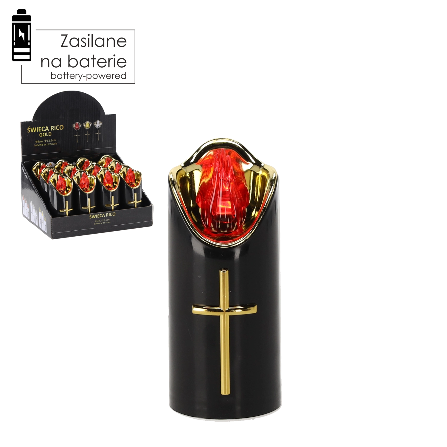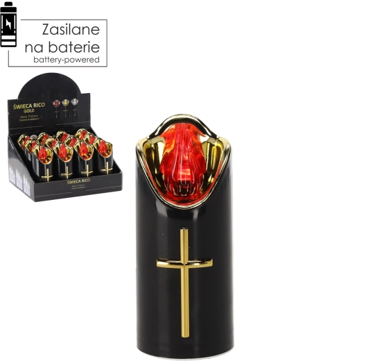 Elegancka świeczka LED RICO o wysokości 12,5 cm w połączeniu czerni i złota z efektem czerwonego płomienia. Jest bezpieczna, długotrwała i zasilana bateriami (w zestawie), dzięki czemu idealnie sprawdzi się jako dekoracja na groby i do wnętrz bez ryzyka otwartego ognia.