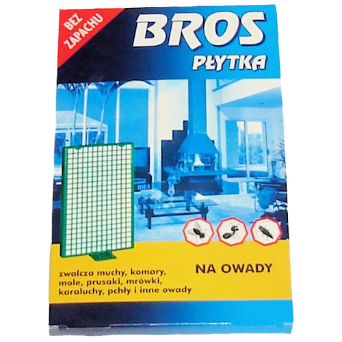 Skuteczna płytka BROS z substancją czynną praletryna chroni wnętrza przed owadami latającymi i biegającymi, takimi jak muchy, komary, mole, mrówki, karaluchy i rybiki. Zapewnia długotrwałą ochronę do 4 miesięcy i działa w pomieszczeniach do 20 m². Pełną skuteczność osiąga w ciągu 4 godzin wobec owadów latających i 8 godzin wobec owadów biegających.