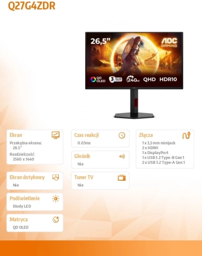 Monitor zaprojektowano dla graczy, którzy chcą kompaktowej przekątnej 26,5" bez kompromisów w szybkości i jakości obrazu. Dzięki wejściom HDMI i DisplayPort bez trudu podłączysz PC i konsole, a wąskie ramki ułatwią konfiguracje wielomonitorowe i zapewnią czysty, nowoczesny wygląd.