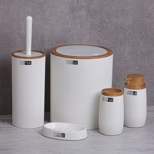 Stylowy, pięcioczęściowy zestaw łazienkowy w białym kolorze z eleganckimi akcentami imitacji drewna, wykonany z wytrzymałego plastiku do codziennego użytku. Zawiera wszystko, czego potrzebujesz do zorganizowanej i higienicznej łazienki: kosz na śmieci, szczotkę toaletową, dozownik mydła, kubek na szczoteczki oraz mydelniczkę.