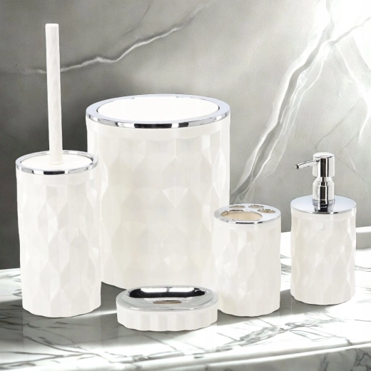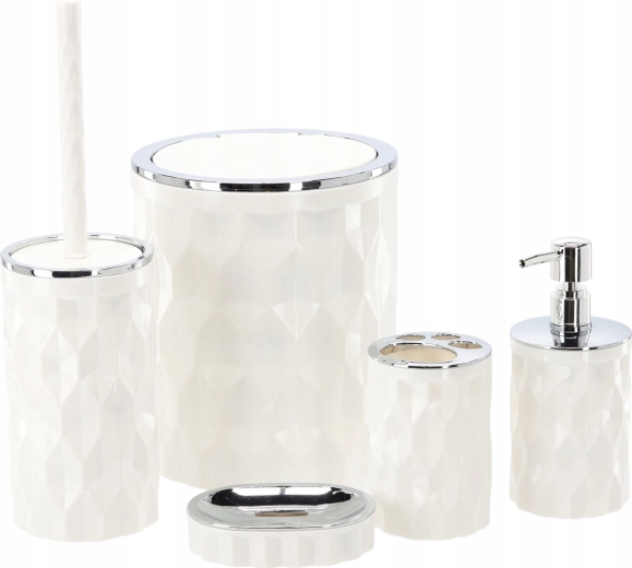 Stylowy, pięcioczęściowy zestaw akcesoriów łazienkowych w eleganckim białym kolorze zawiera wszystko, czego potrzebujesz do codziennej higieny i porządku. Dzięki spójnemu wzornictwu z nowoczesnymi detalami oraz praktycznemu układowi elementów zyskasz czysty, harmonijny wygląd łazienki i łatwą pielęgnację. Zestaw obejmuje kosz na śmieci, zestaw z szczotką do WC, dozownik do mydła w płynie, stojak na szczoteczki do zębów oraz mydelniczkę.