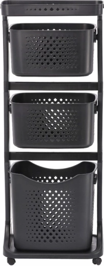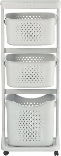 Trzy perforowane kosze uzupełnione górną tacką odkładczą pozwalają trzymać najczęściej używane rzeczy zawsze pod ręką – od kosmetyków po kuchenne drobiazgi.