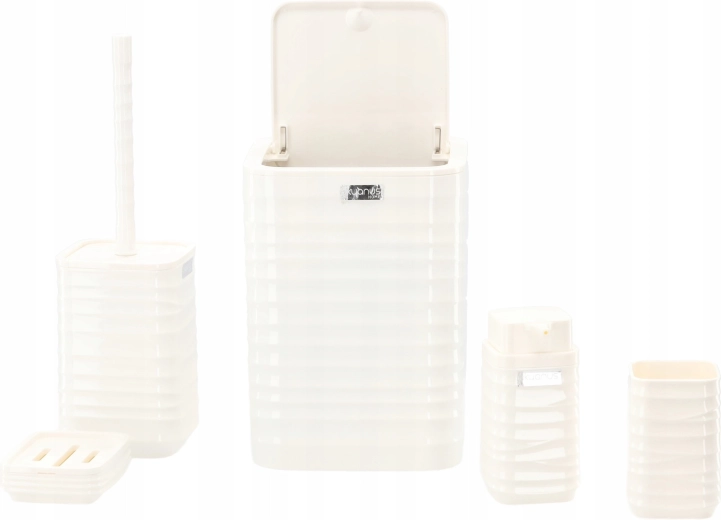 Zestaw zawiera wszystko, czego potrzebujesz do zorganizowanej i higienicznej łazienki: kosz na śmieci z pokrywą dla schludnego wyglądu, szczotkę do WC z osłoną, dozownik mydła w płynie dla wygodnego dozowania, kubek na szczoteczki do zębów oraz mydelniczkę o praktycznym kształcie.