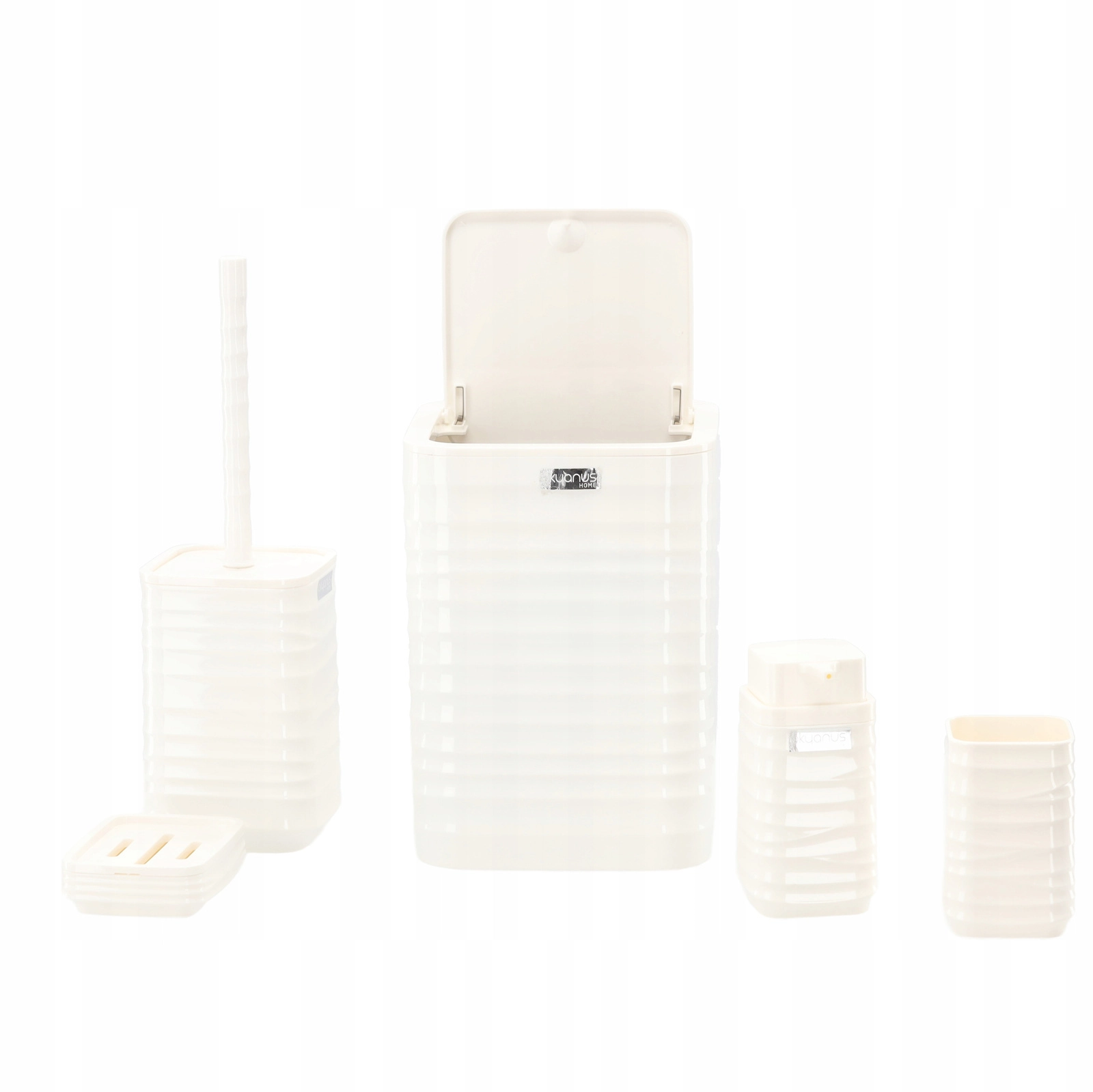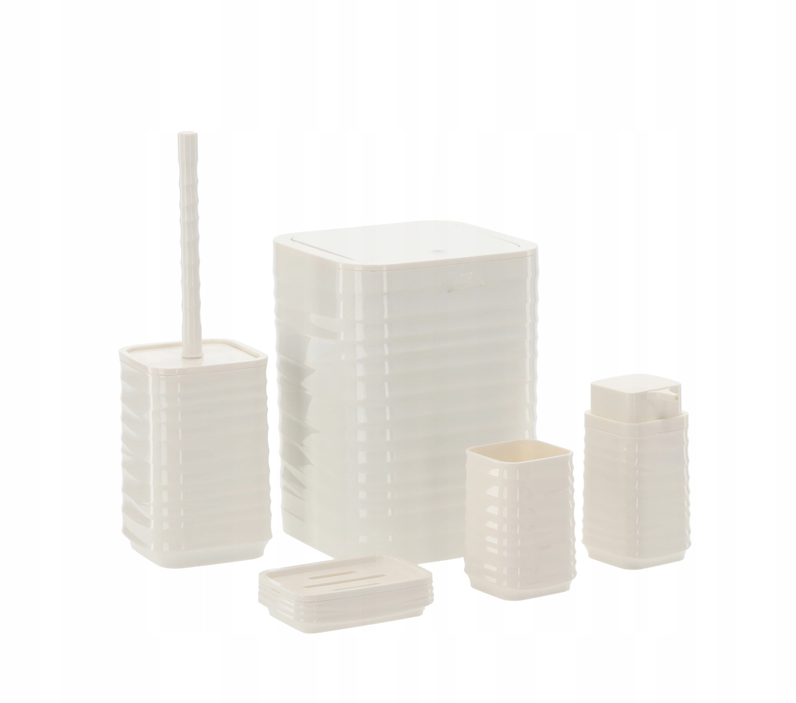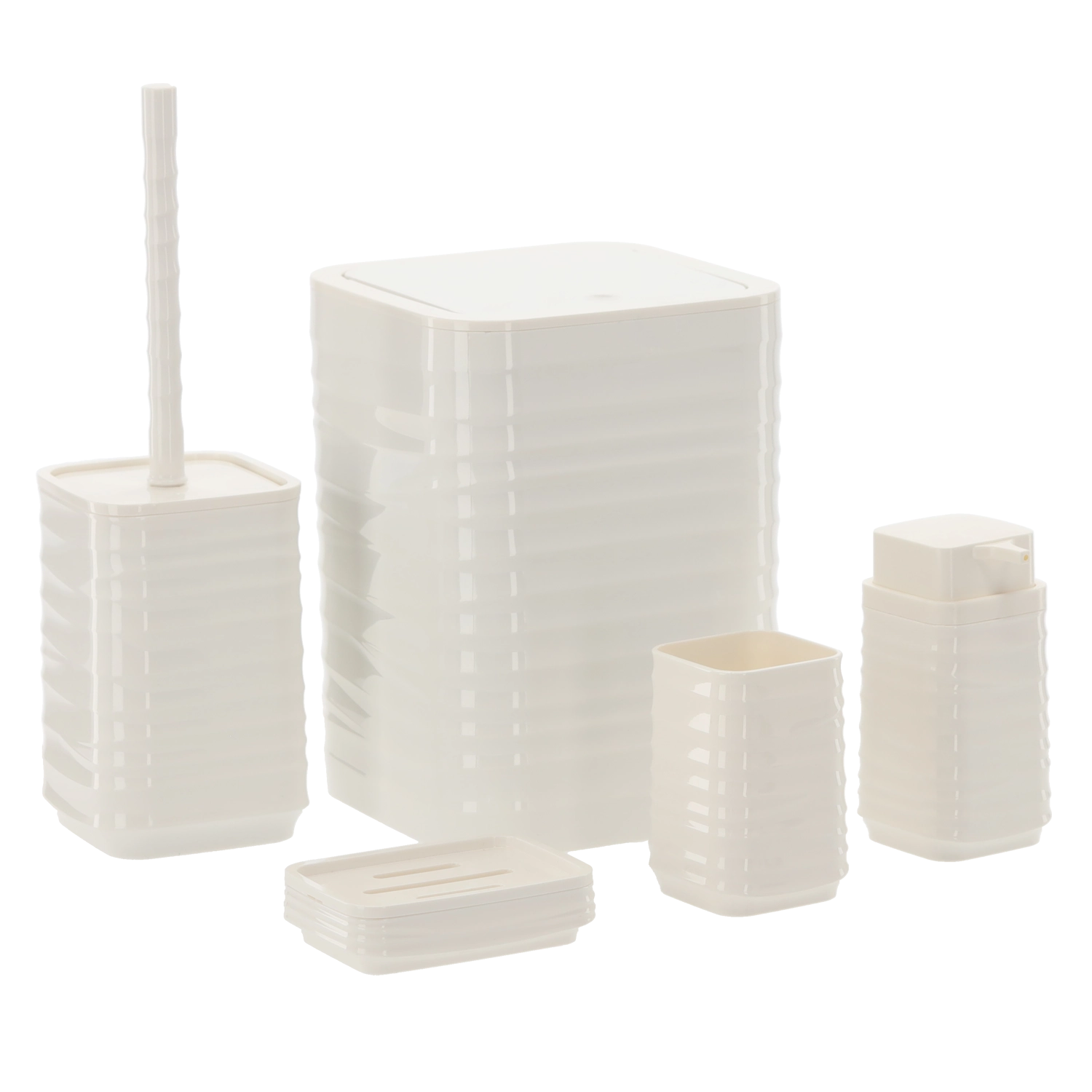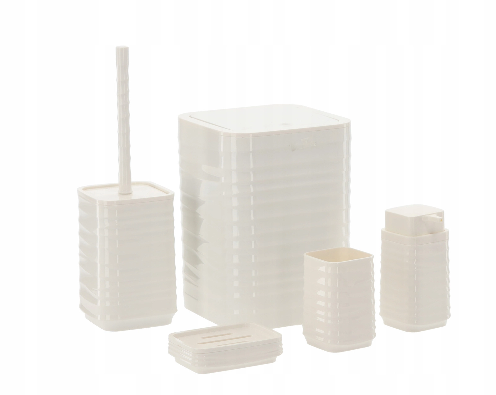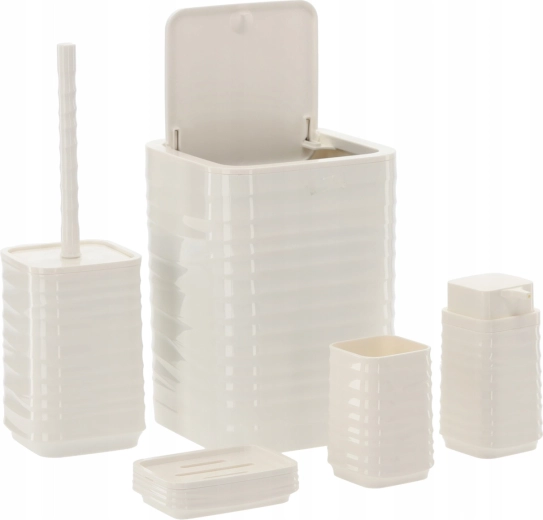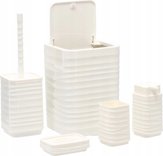 Ten pięcioelementowy zestaw łazienkowy w uniwersalnym białym kolorze oferuje funkcjonalne i stylowe rozwiązanie dla każdego domu. Żebrowana powierzchnia i kwadratowe linie prezentują się czysto i nowocześnie, a wytrzymały plastik zapewnia łatwe czyszczenie i długą żywotność.
