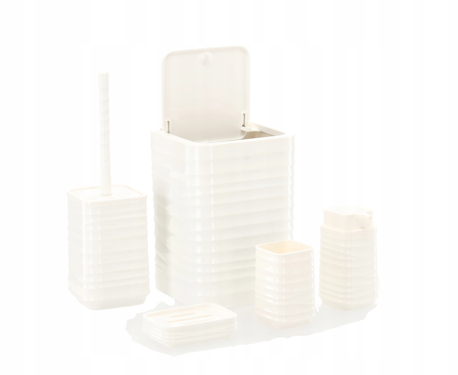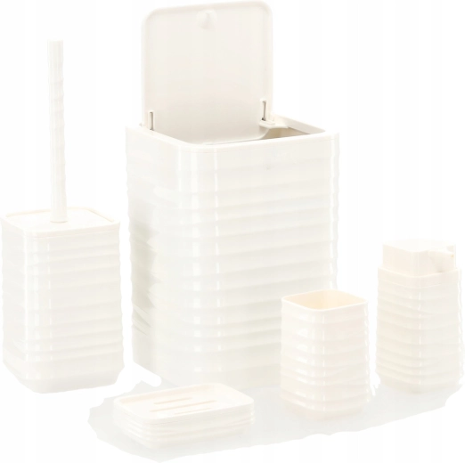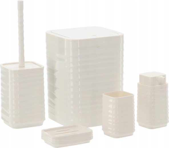 Elegancki, 5‑częściowy zestaw łazienkowy w białym kolorze ujednolici wygląd Twojej łazienki i ułatwi codzienną higienę. Dzięki nowoczesnemu, żebrowanemu, kwadratowemu wzornictwu i łatwemu w czyszczeniu plastikowi otrzymujesz praktyczne wyposażenie: kosz na śmieci, szczotkę toaletową, dozownik mydła, kubek na szczoteczki oraz mydelniczkę.