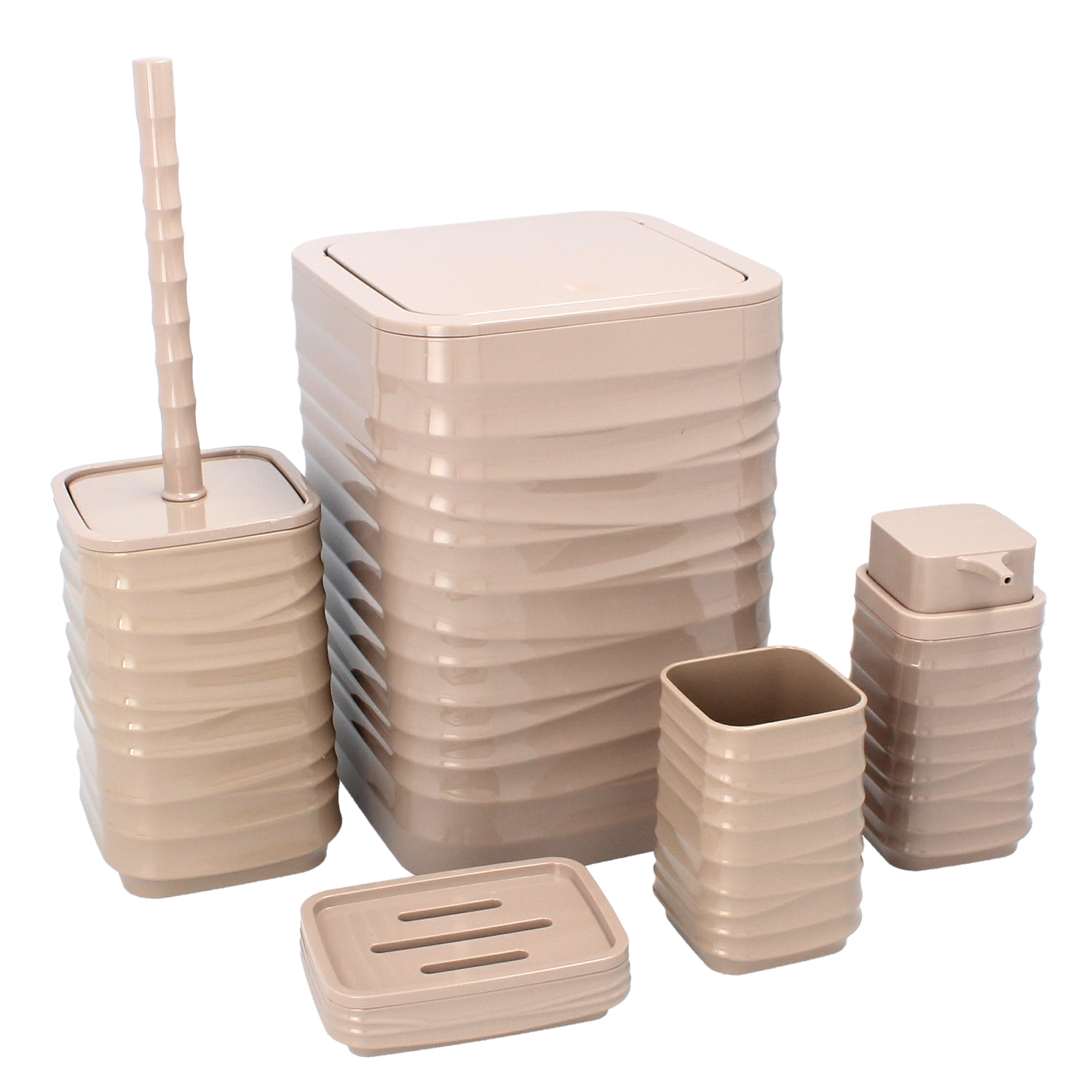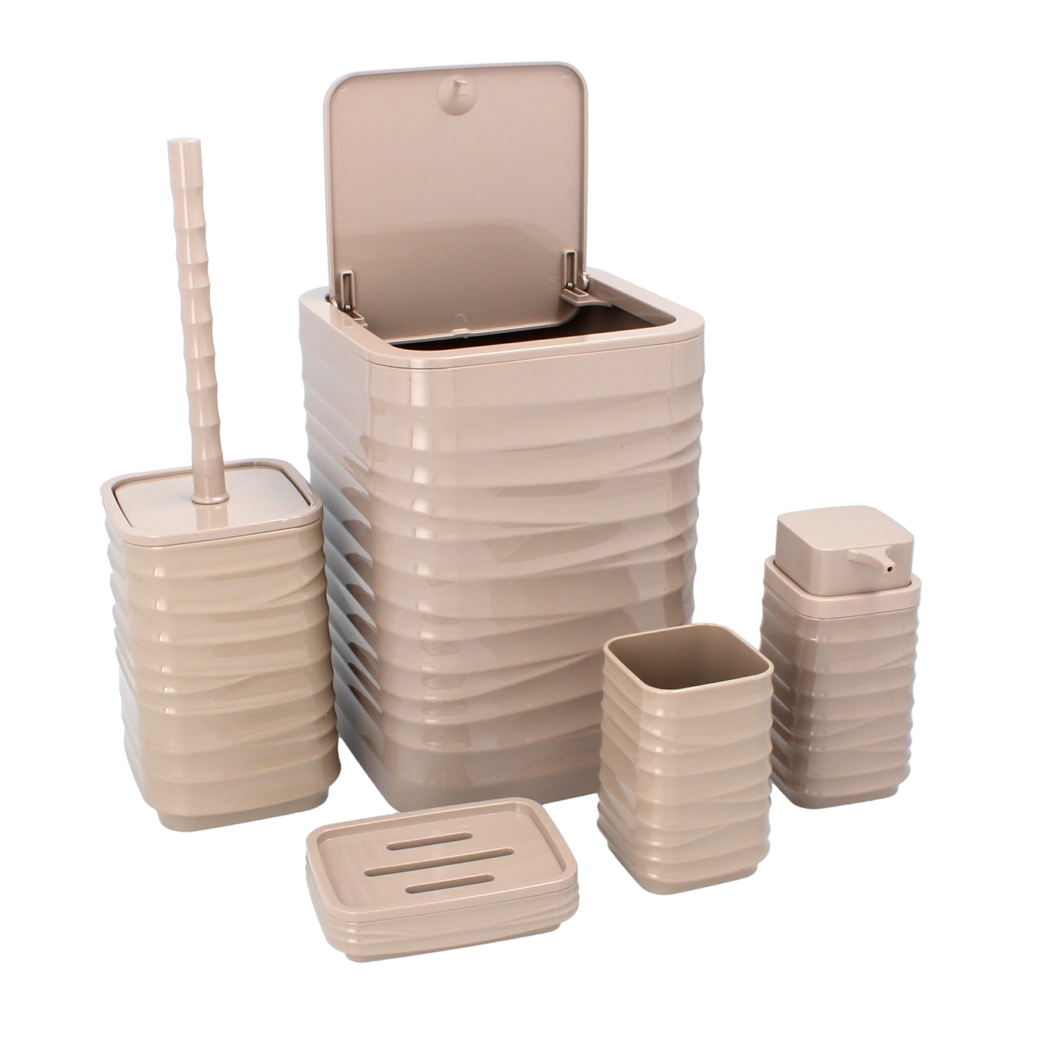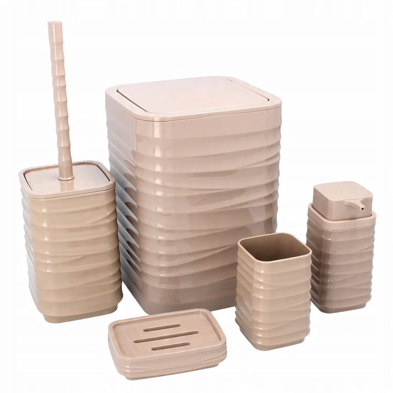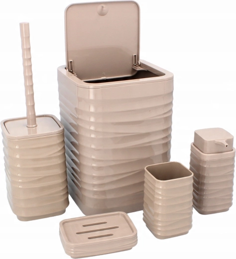 Stylowy zestaw łazienkowy z wytrzymałego plastiku w eleganckim brązowym kolorze ujednolici wygląd całej łazienki. Zawiera kosz na śmieci, szczotkę toaletową z uchwytem, dozownik do mydła, kubek na szczoteczki oraz mydelniczkę. Praktyczny kwadratowy design z rowkowaną strukturą oszczędza miejsce i jest łatwy w utrzymaniu czystości.