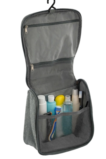 Wewnętrzny układ z wieloma kieszeniami i elastycznymi paskami stabilnie utrzymuje buteleczki, kosmetyki i drobiazgi na miejscu. Kompaktowa konstrukcja o wymiarach 22 × 20 × 12 cm oszczędza miejsce w bagażu, a jednocześnie oferuje wystarczająco dużo przestrzeni na codzienne niezbędniki. Doskonały wybór na podróże, biwakowanie, wyjazdy służbowe i wizyty w klubach fitness.