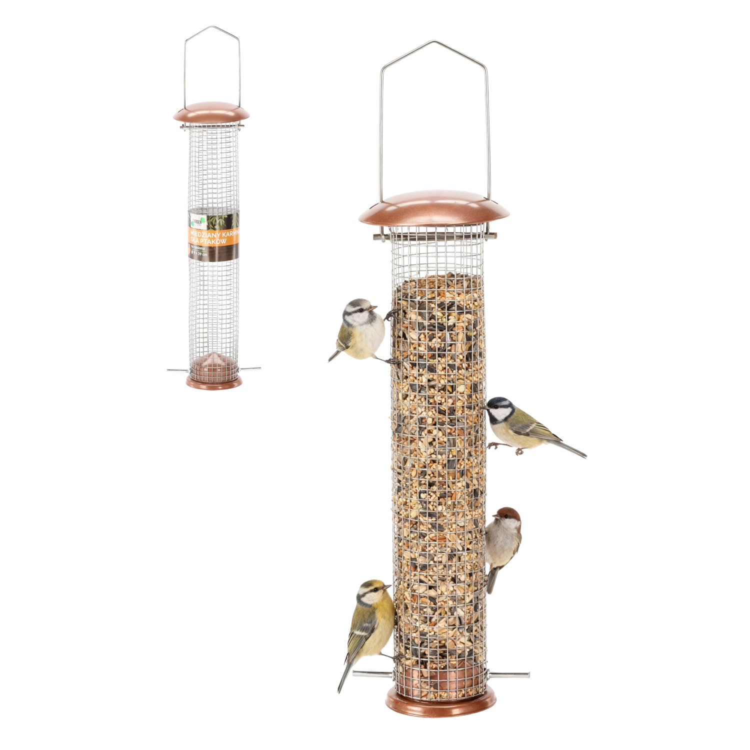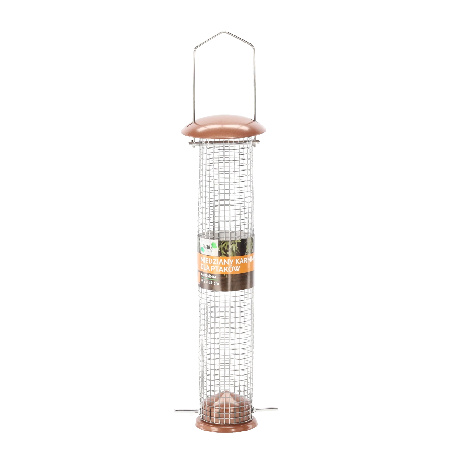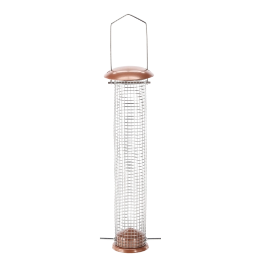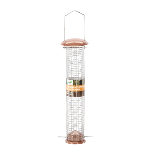 Stylowy i wytrzymały karmnik dla ptaków w formie tubusu z metalu i siatki drucianej w eleganckim miedzianym kolorze. Idealny do zawieszenia w ogrodzie lub na balkonie i regularnego uzupełniania nasion. Dzięki praktycznemu zawiesiu montaż jest prosty i szybki, a solidna metalowa konstrukcja oraz efektowne miedziane wykończenie zapewniają długą żywotność i atrakcyjny wygląd.