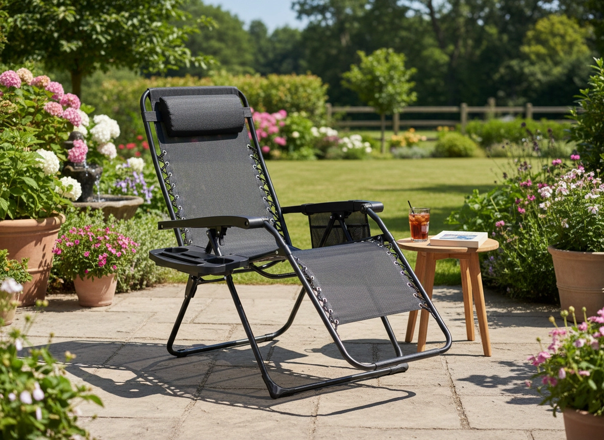 Odkryj nowy wymiar relaksu ze składanym leżakiem Zero Gravity, który oferuje uczucie nieważkości, ergonomicczne wsparcie kręgosłupa i płynną regulację pozycji. Dzięki regulowanemu zagłówkowi, podnóżkowi, praktycznej podstawce na napoje oraz bocznej kieszeni masz wszystko, czego potrzeba do komfortowego odpoczynku w ogrodzie, na tarasie i balkonie.
