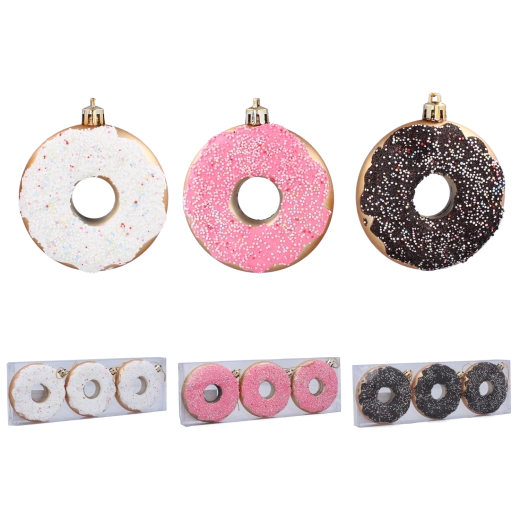 Ozdób swoją choinkę czymś naprawdę wyjątkowym. Ten zestaw 3 ozdób w kształcie donutów wprowadza świeży i zabawny design, który przyciąga wzrok od pierwszego spojrzenia. Dzięki wysokiej jakości wykonania i detalom dekoracje prezentują się elegancko, a jednocześnie z humorem.