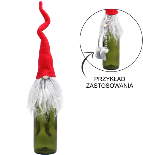 Uniwersalny rozmiar pasuje do większości standardowych butelek wina, dzięki czemu sprawdzi się jako świąteczny prezent oraz ozdoba stołu, półki czy kominka. Po świętach skrzat może dalej zdobić wnętrze i przedłużać odświętny nastrój.