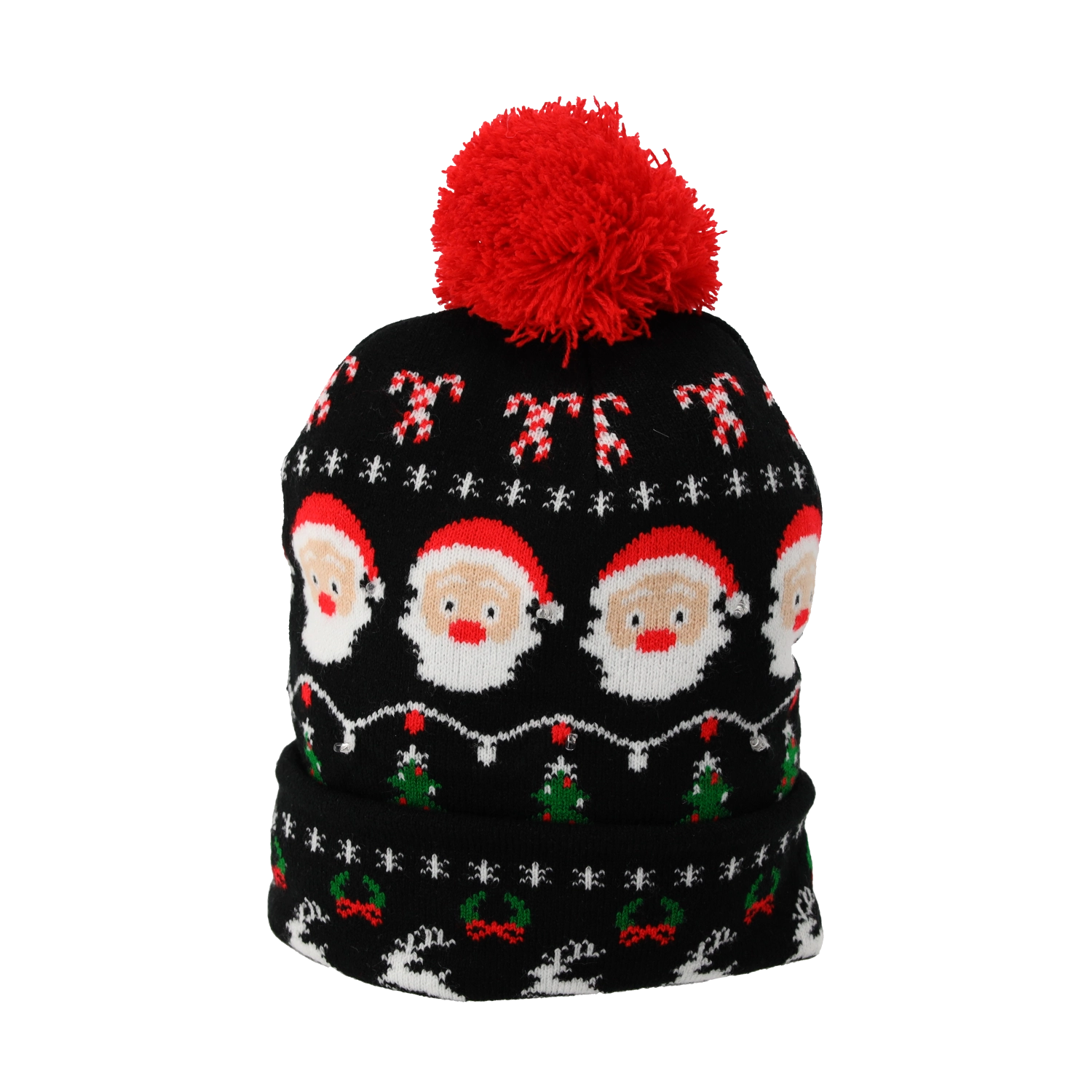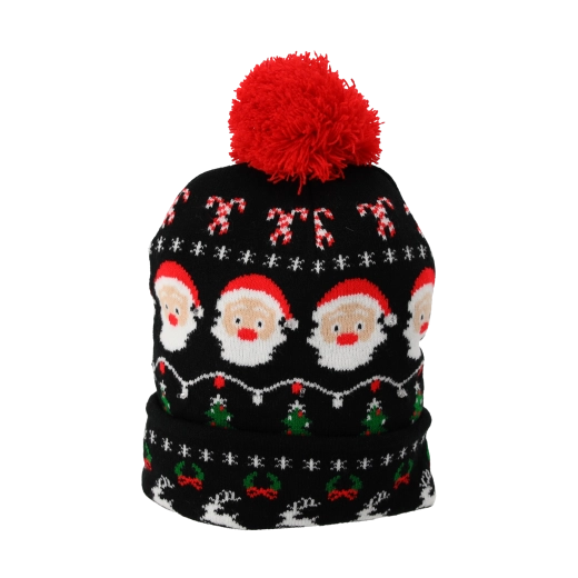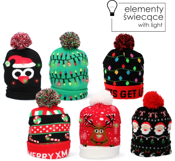 Od reniferów i Mikołaja po świetlne girlandy i napisy MERRY XMAS – zestaw ośmiu czapek oferuje różnorodne motywy na różne style i okazje.