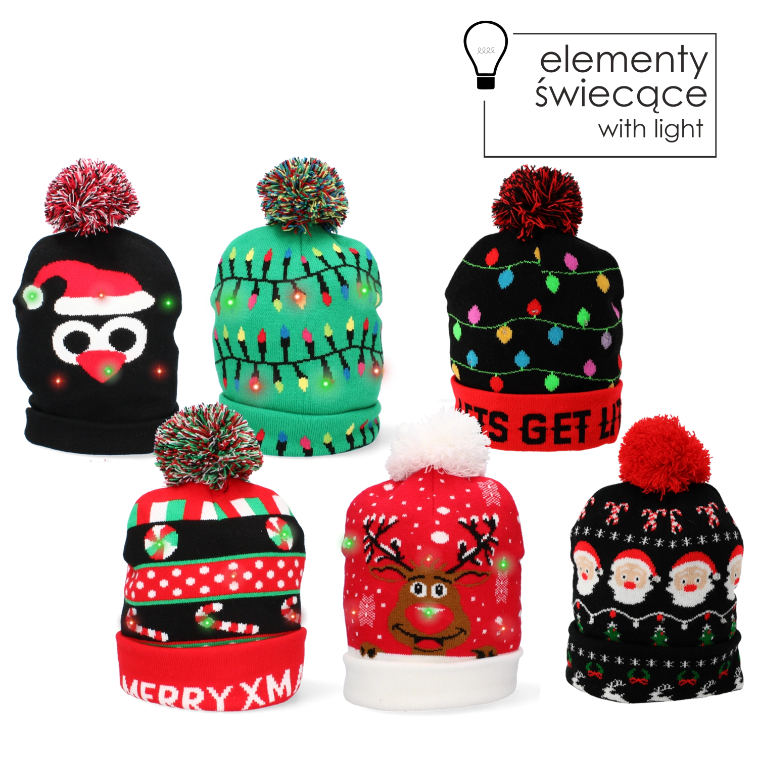 Szukasz oryginalnego dodatku na firmową imprezę, rodzinne zdjęcia lub jarmark świąteczny? Mix wzorów w tym zestawie ucieszy każdego – od czapek z napisami MERRY XMAS, przez motywy reniferów, Mikołaja i świetlnych girland, po modele z podświetleniem LED dla prawdziwego efektu „wow”. Wszystkie czapki są z miękkiej dzianiny, ciepłe i przyjemne w noszeniu.