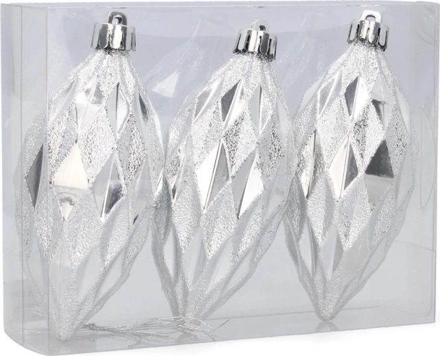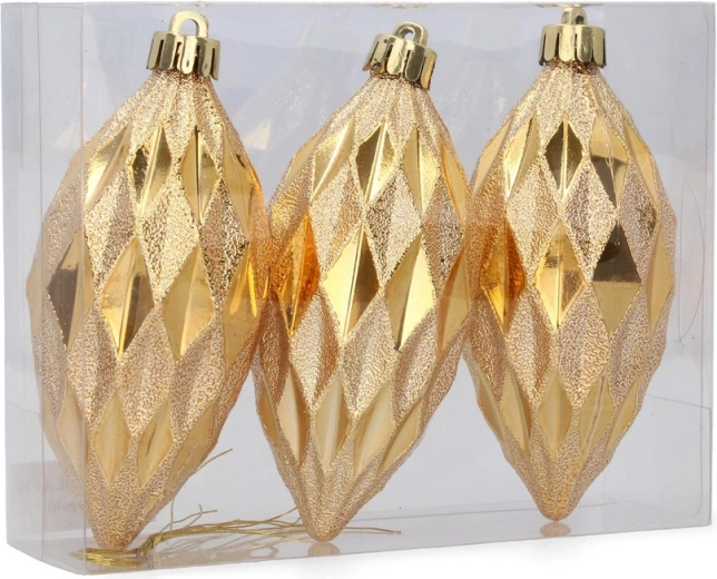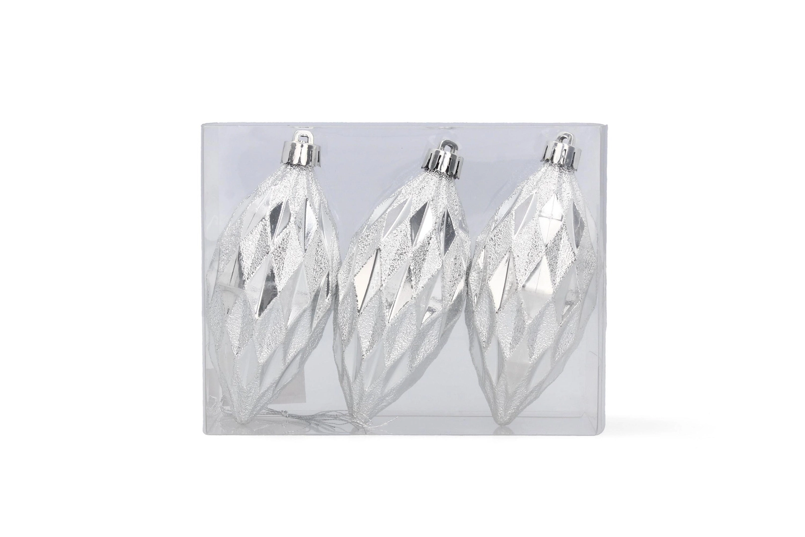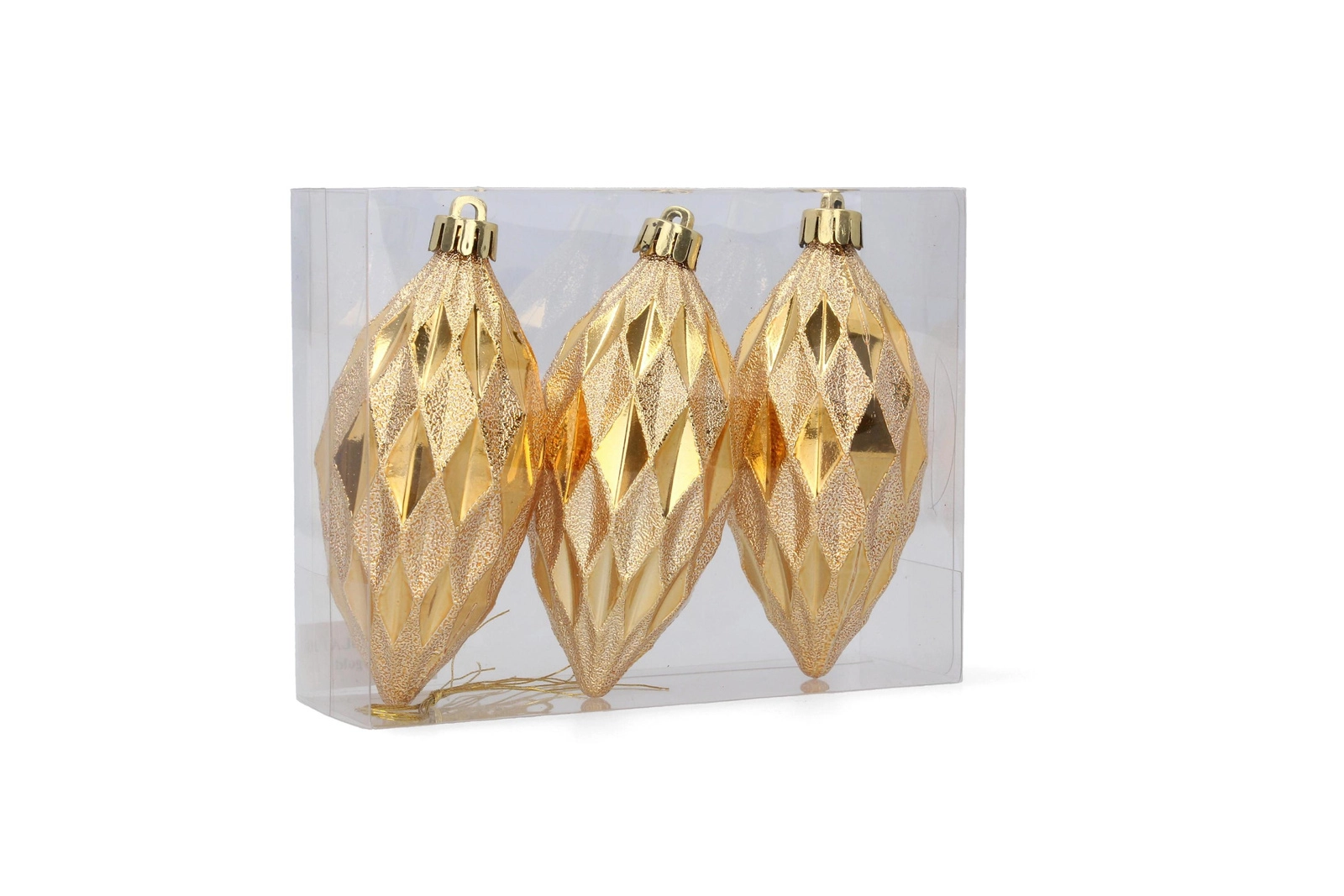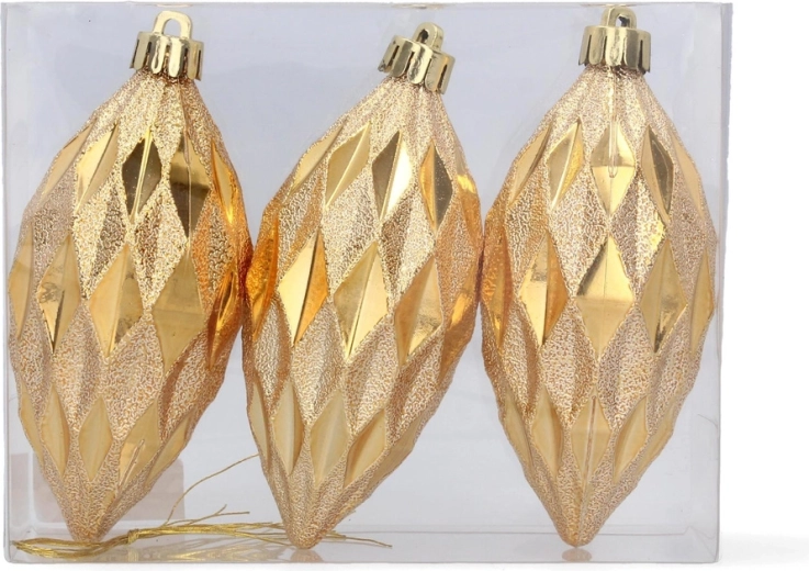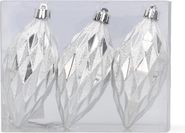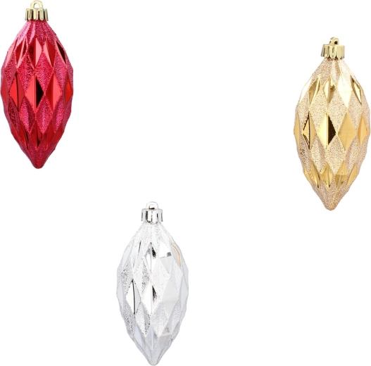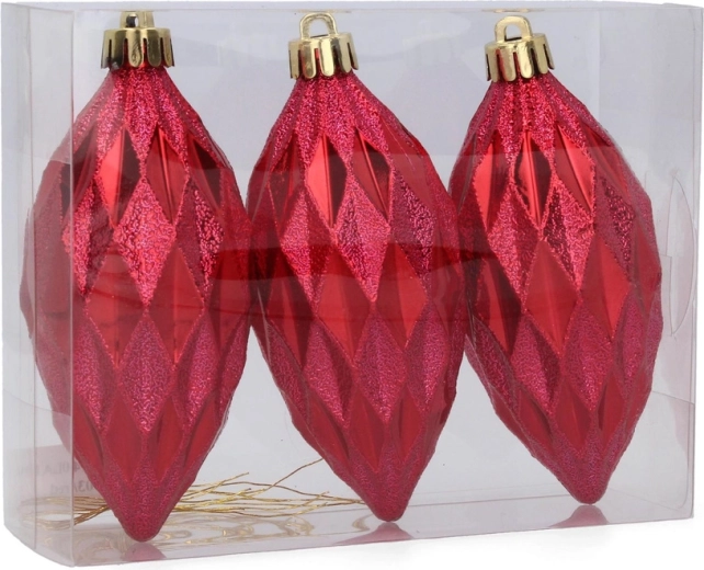 Stwórz w domu atmosferę tradycyjnych Świąt dzięki zestawowi trzech podłużnych ozdób w lubianych kolorach – czerwonym, złotym i srebrnym. Błyszcząca powierzchnia doda dekoracjom wyjątkowego blasku i podkreśli świetlne refleksy na Twojej choince.