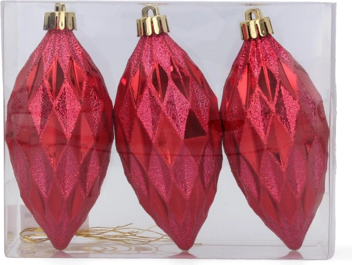 Elegancki zestaw trzech podłużnych ozdób choinkowych o długości 10 cm w kolorach czerwonym, złotym i srebrnym z kolekcji Tradycyjna nada Twojej choince klasyczny świąteczny wygląd. Dzięki błyszczącej powierzchni i nietłukącemu materiałowi są bezpieczne dla domów z dziećmi, a jednocześnie trwałe i odporne.