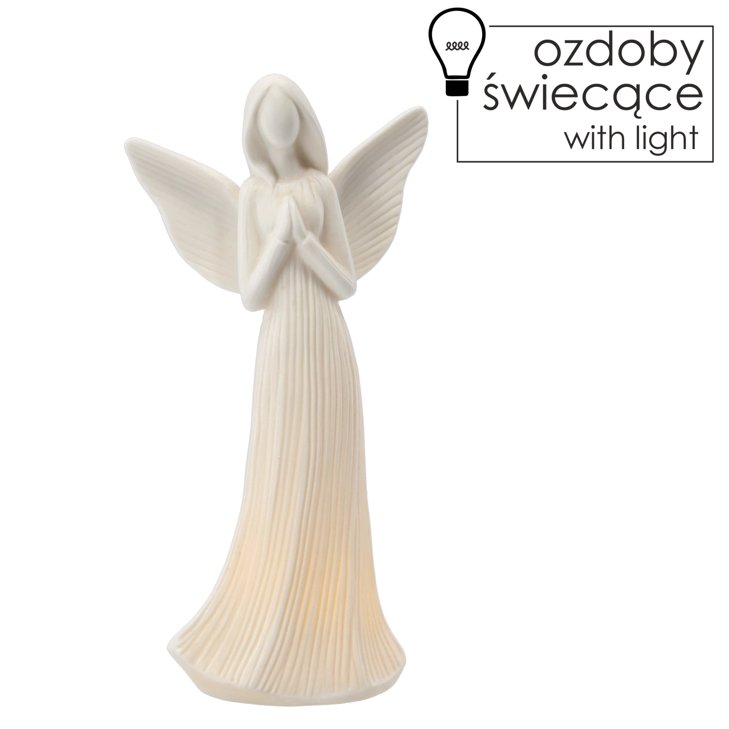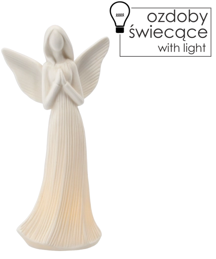 Ta anielska dekoracja z podświetleniem LED wyróżnia się klasycznym, ponadczasowym designem oraz matową powierzchnią, która elegancko prezentuje się w każdym wnętrzu. Dzięki stabilnej podstawie pewnie stoi na płaskich powierzchniach, a jej wysokość 23,6 cm czyni ją idealnym dodatkiem do salonu, sypialni i przedpokoju.