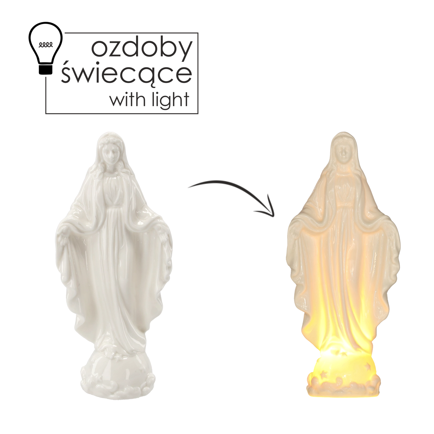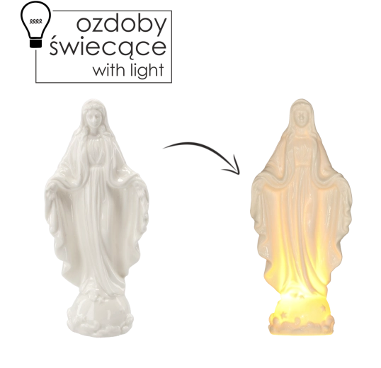 Elegancka figurka Matki Bożej o wysokości 23,5 cm z zintegrowanym oświetleniem LED wprowadza do wnętrza spokojną i sakralną atmosferę. Delikatne światło podkreśla detale figurki, jest idealna na ołtarz, do salonu oraz jako dekoracja świąteczna. Dzięki zasilaniu bateryjnemu możesz łatwo ustawić ją bez kabli.