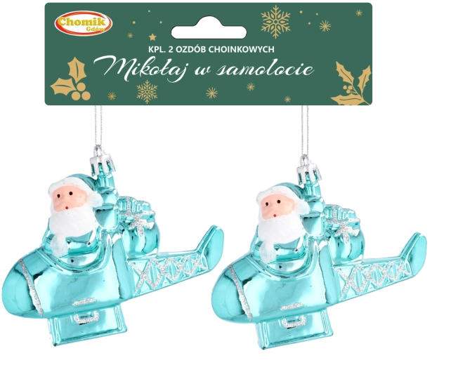 Odkryj figlarne i stylowe dodatki, które natychmiast ożywią Twoją świąteczną aranżację. Zestaw zawiera 2 wiszące ozdoby z motywem Mikołaja pilotującego samolot – wesoły akcent, który ucieszy dzieci i dorosłych. Dzięki wysokiej jakości tworzywu ozdoby są lekkie, wytrzymałe i odpowiednie także na większe choinki.