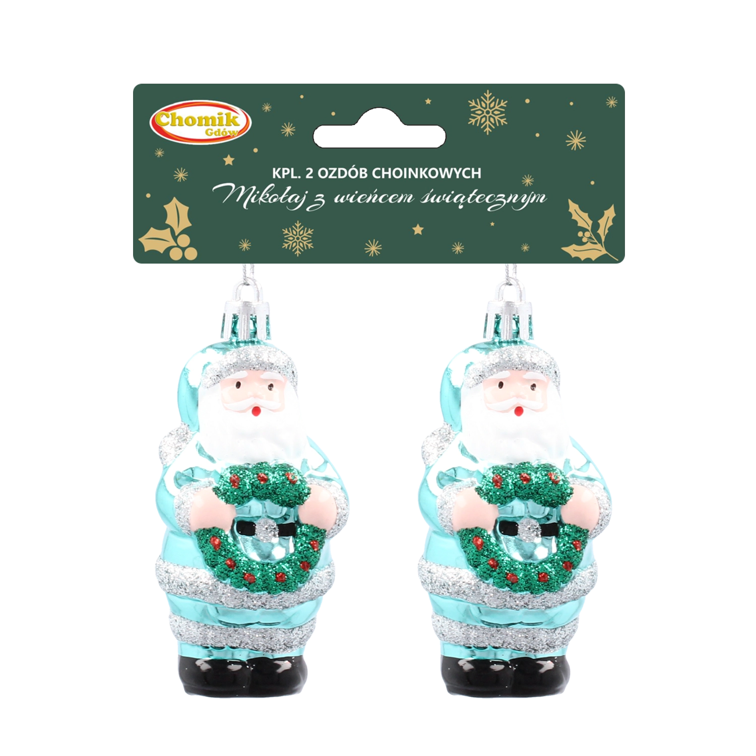 Podkreśl świąteczny nastrój uroczym zestawem dwóch ozdób bożonarodzeniowych w formie Mikołaja z wieńcem. Eleganckie połączenie czerwieni, złota i bieli pięknie współgra z innymi dekoracjami i dodaje wnętrzu ciepła oraz świątecznego uroku.