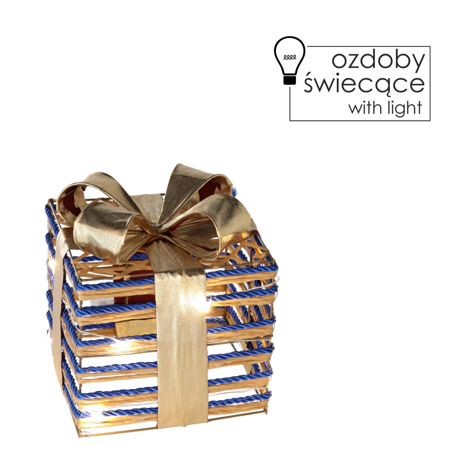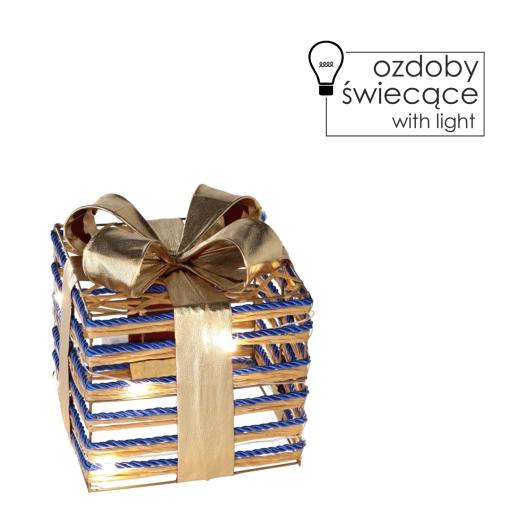 Elegancka świąteczna dekoracja w kształcie prezentu o wielkości 15 cm z ciepłym białym oświetleniem LED i dużą niebieską kokardą rozświetli Twój dom. Lekka konstrukcja z drutu oplecionego złotym sznurkiem tworzy romantyczną atmosferę, a dzięki zasilaniu bateryjnemu 3× AA z łatwością umieścisz ją gdziekolwiek – na parapecie, pod choinką, obok kominka lub jako zewnętrzną ozdobę przy wejściu.