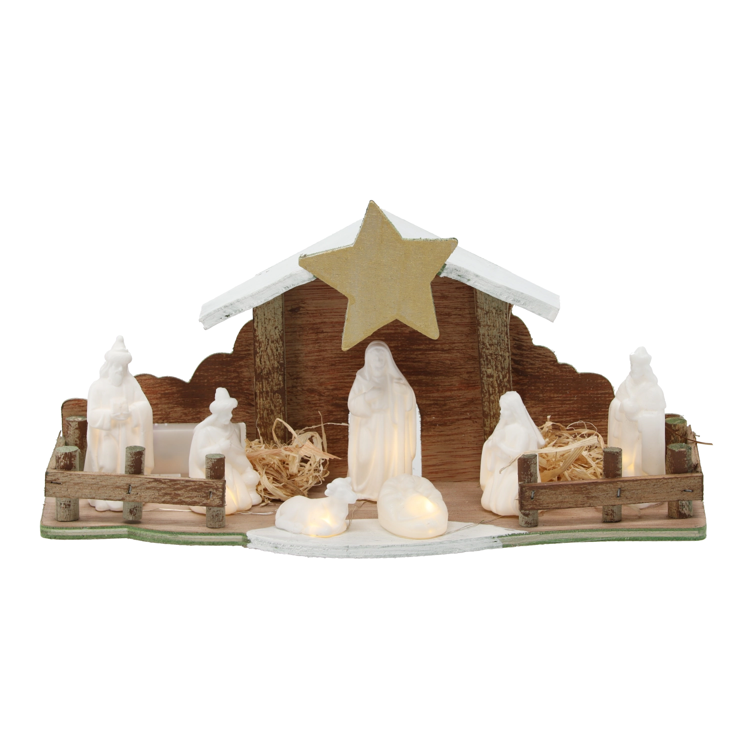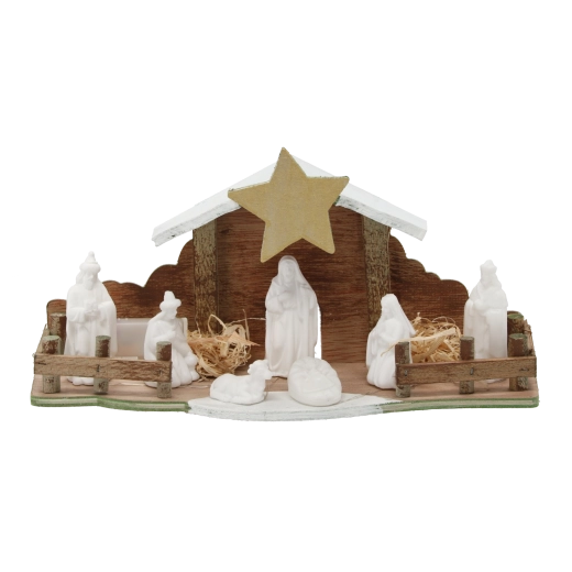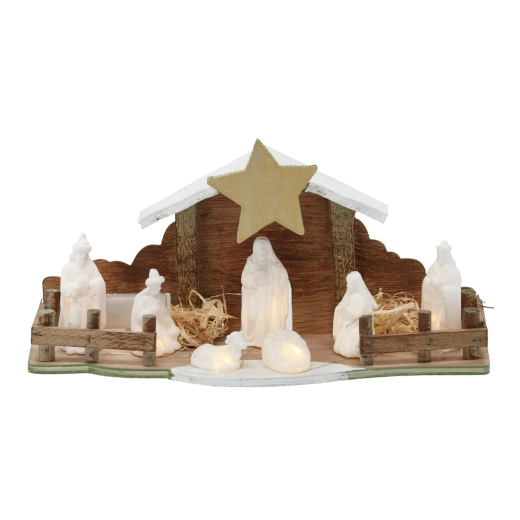 Ta stylowa szopka stołowa z drewnianą stajenką i gwiazdą uzupełniona jest białymi figurkami Świętej Rodziny, pasterzy i zwierząt. Zintegrowane ciepłe LED delikatnie rozświetlają scenę i dodają wnętrzu przyjemnego blasku bez olśnienia. Dzięki rustykalnym elementom z drewna i słomy pasuje do stylu klasycznego, boho i wiejskiego.