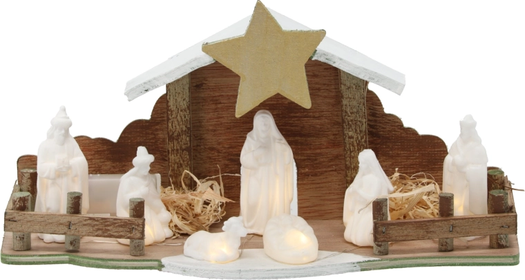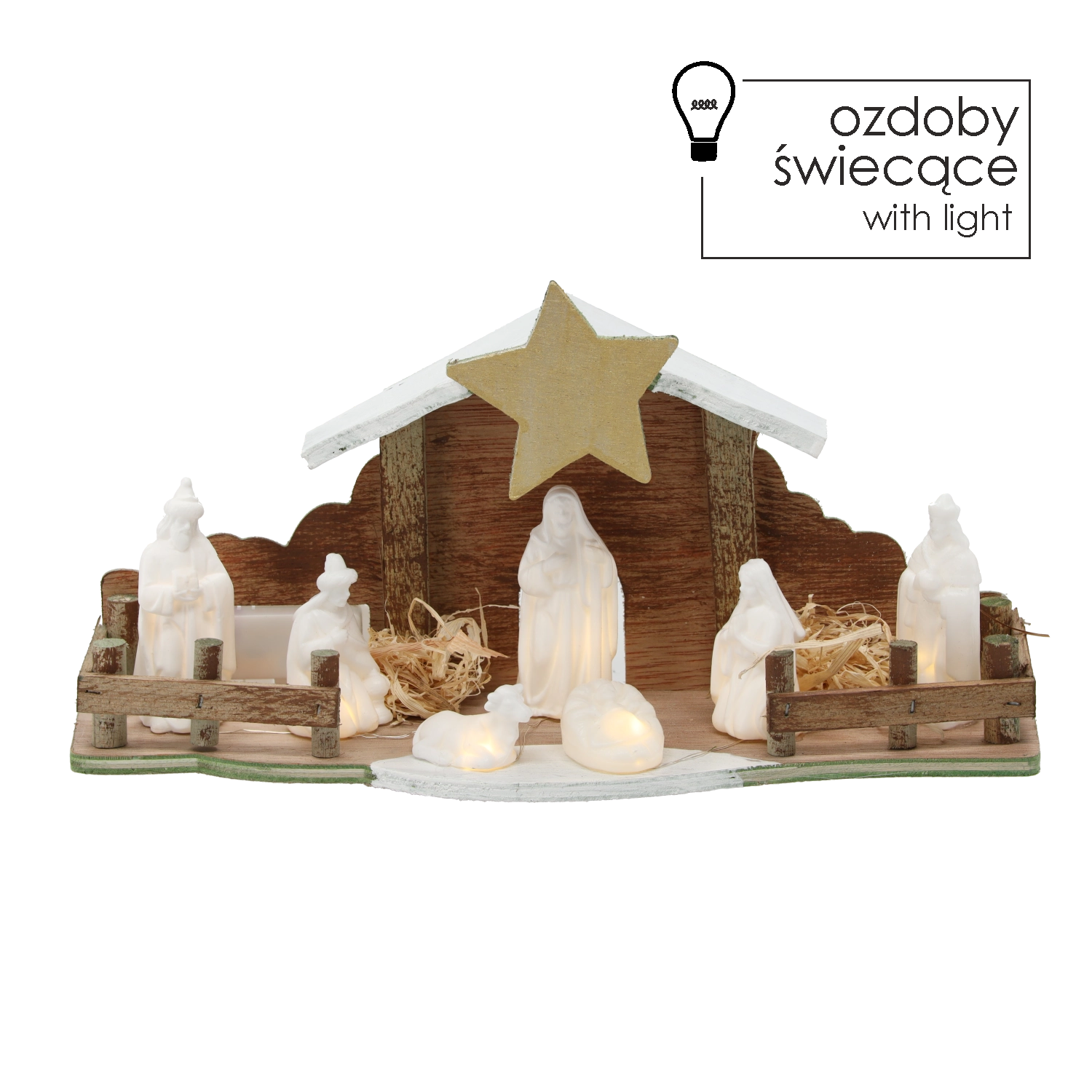 Zintegrowane diody LED subtelnie rozświetlają stajenkę i figurki, podkreślają detale i wprowadzają przyjemne, świąteczne światło o niskim zużyciu energii.
