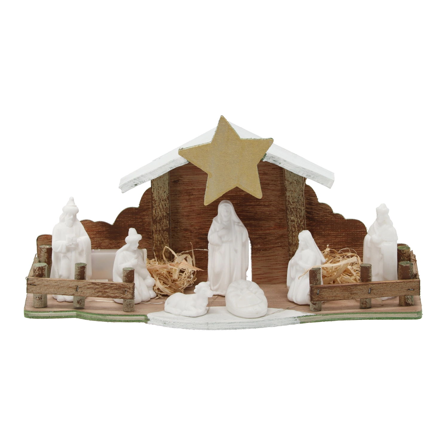 Stajenka z naturalnego drewna z ogrodzeniem, gwiazdą i akcentami ze słomy prezentuje się autentycznie i świetnie komponuje się ze świątecznymi dekoracjami.