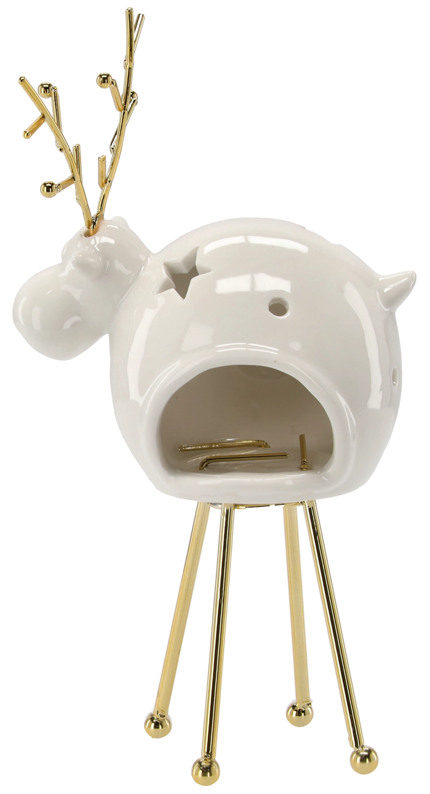 Stylowy świecznik w kształcie renifera łączy tradycyjny świąteczny motyw z praktycznym zastosowaniem. Wysokiej jakości metalowe wykonanie w złotym wykończeniu nadaje dekoracji nowoczesny, a zarazem odświętny charakter, który z łatwością dopełni Twój sezonowy wystrój.