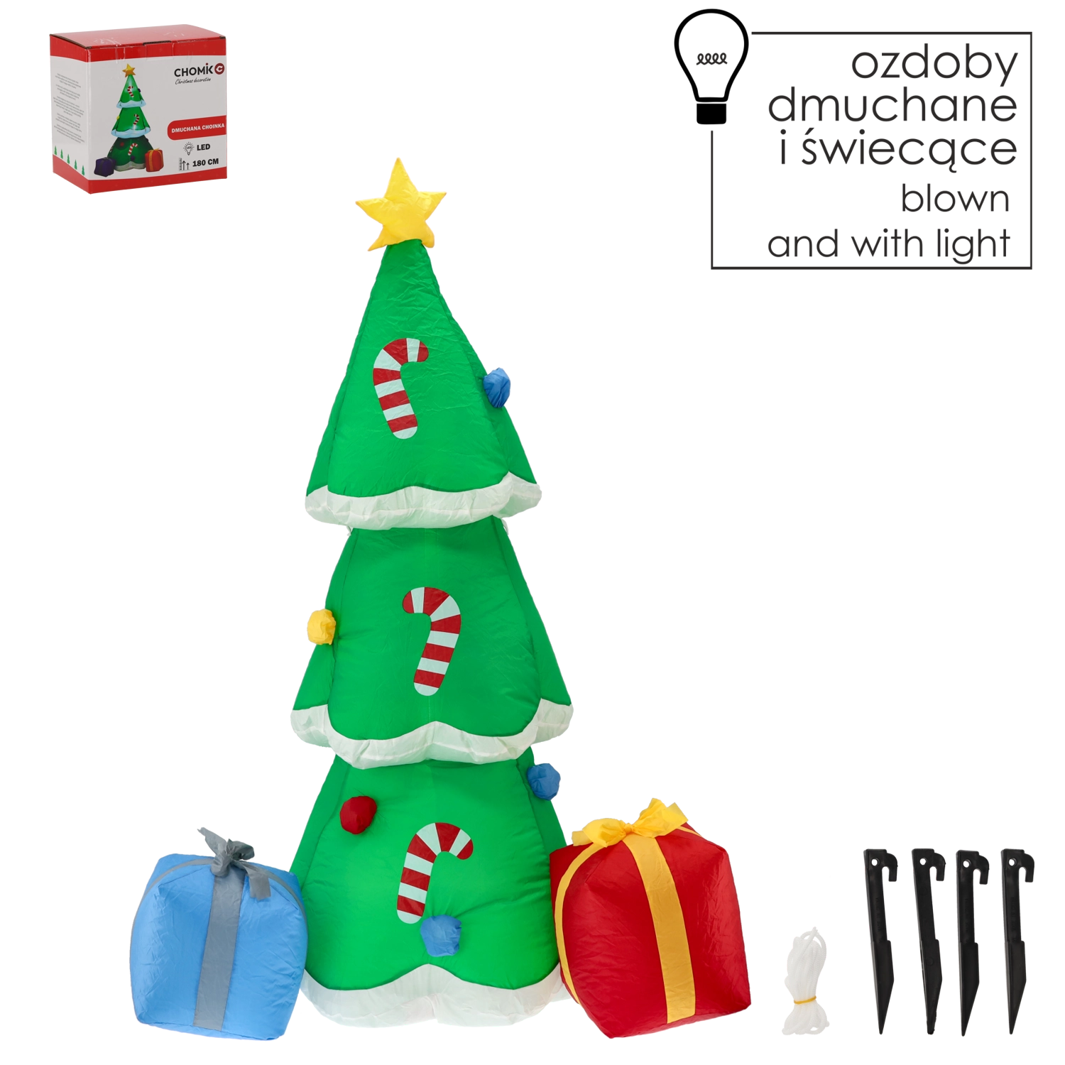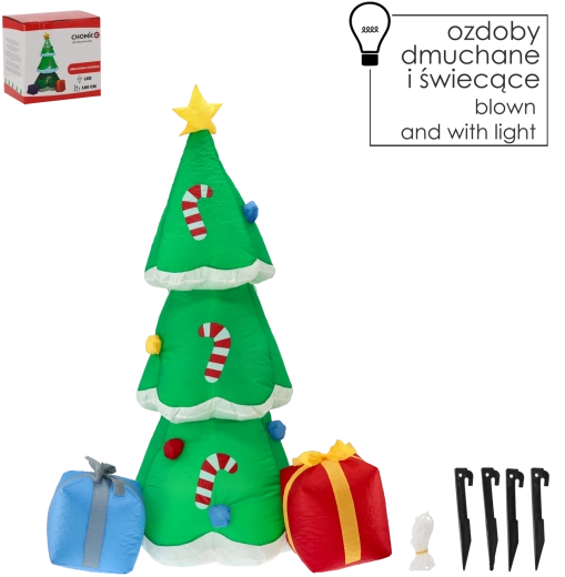 Nadmuchiwana choinka świąteczna z oświetleniem LED o wysokości 180 cm zamieni ogród i wnętrze w magiczną, świąteczną scenerię. Dzięki zintegrowanemu wentylatorowi sama się nadmuchuje w ciągu kilku minut, odporność IP44 poradzi sobie z warunkami zewnętrznymi, a białe diody LED zapewnią piękny efekt po zmroku. Łatwa instalacja i bezpieczne zasilanie niskonapięciowe z certyfikatami CE, ROHS, EMC i LVD.