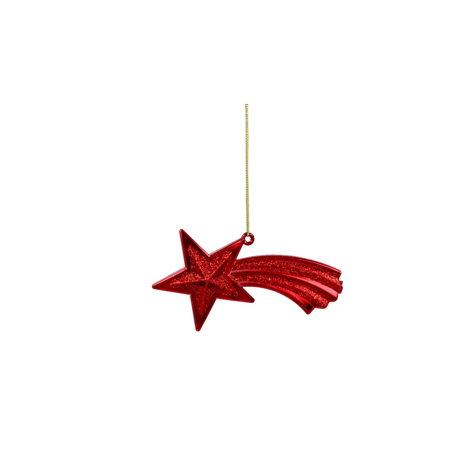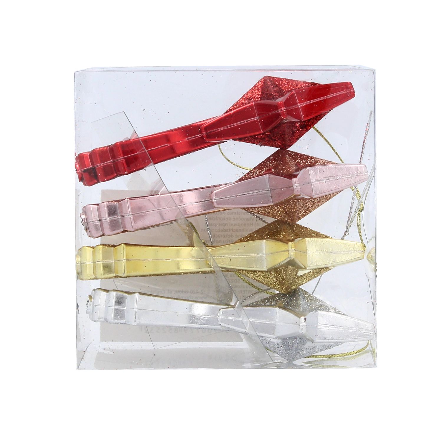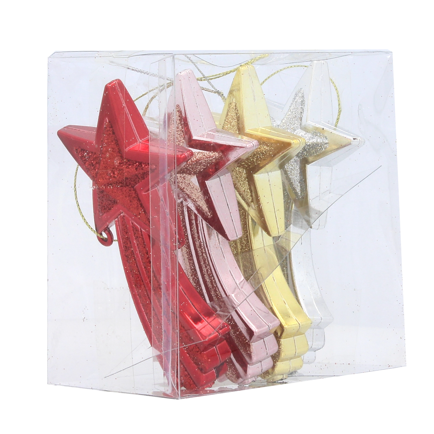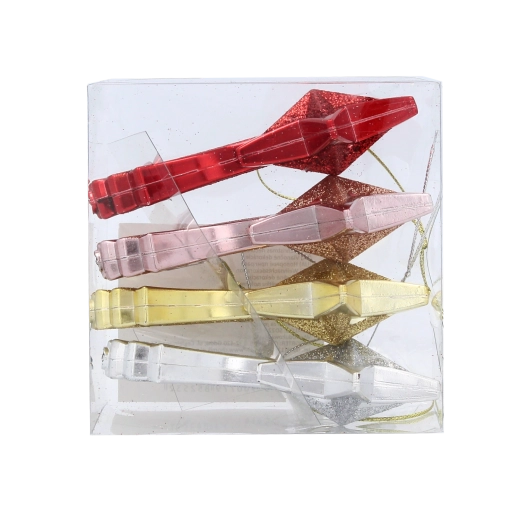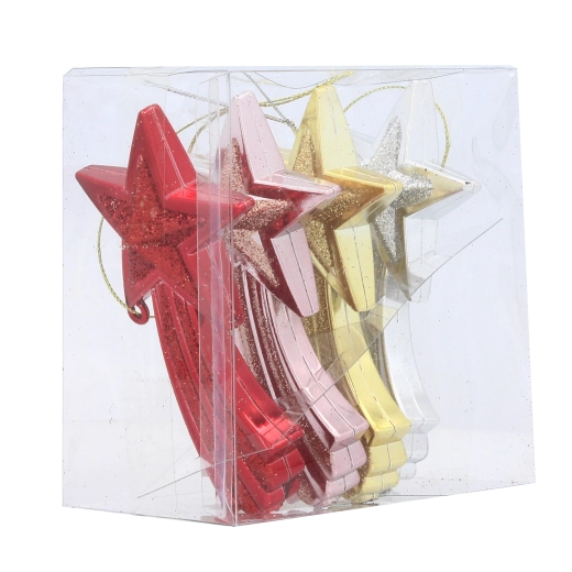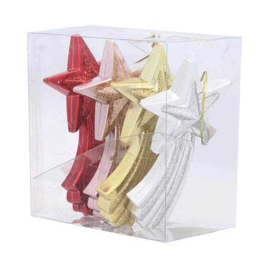 Dodaj swojej choince i całemu domowi świątecznego blasku dzięki zestawowi czterech ozdób w kształcie spadającej gwiazdy o wielkości 11 cm. Ozdoby z wytrzymałego plastiku są lekkie, bezpieczne i mają praktyczny sznureczek do zawieszenia. Cztery eleganckie kolory – czerwony, złoty, srebrny i różowy – łatwo dopasujesz do swojej dekoracji, tworząc harmonijną świąteczną atmosferę.