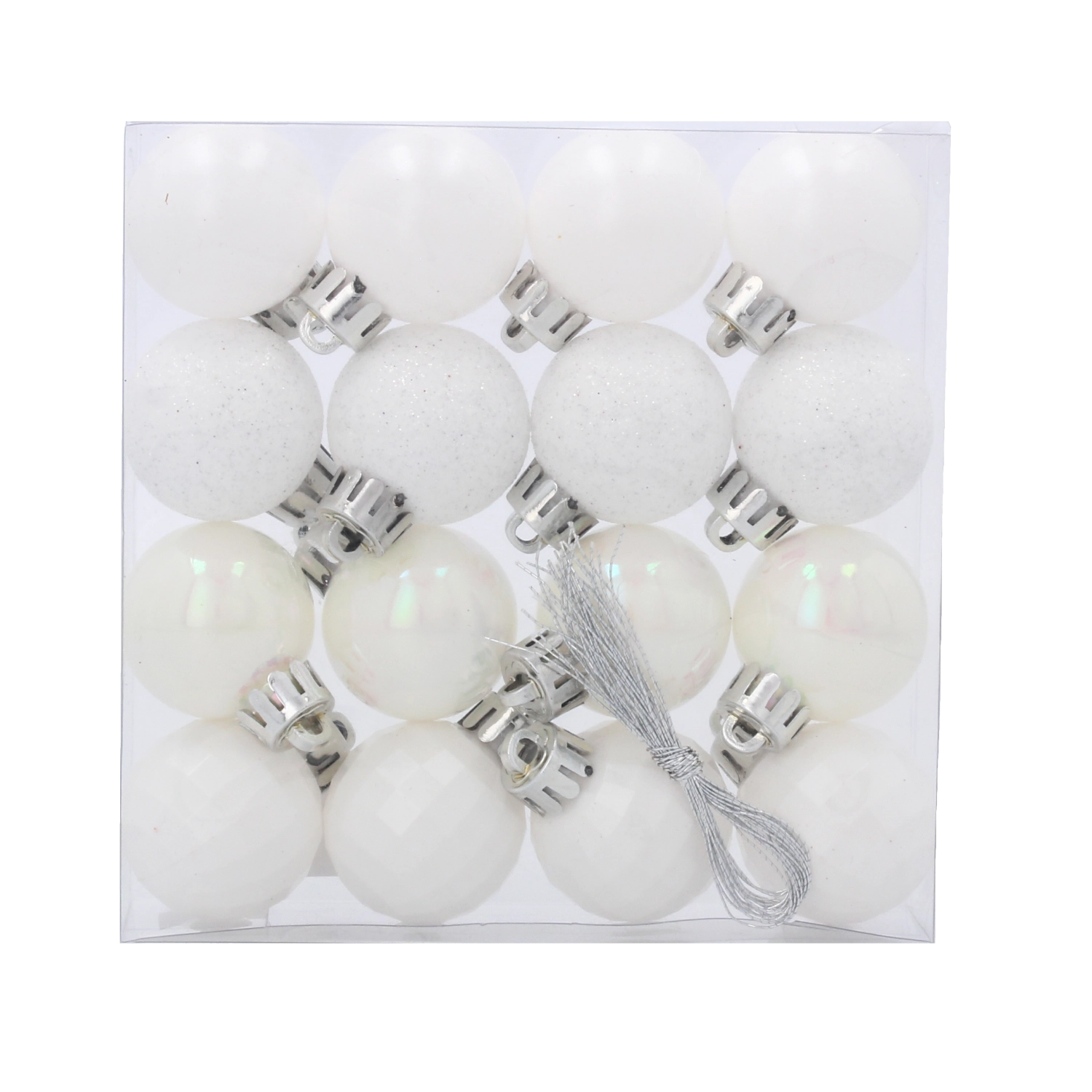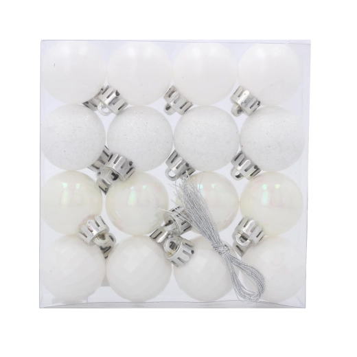 Dodaj swojej choince ponadczasowego uroku dzięki zestawowi 16 białych ozdób o średnicy 3 cm. Połączenie matowych, błyszczących, brokatowych oraz disco efektów tworzy harmonijną całość i elegancki wygląd. Ozdoby są nietłukące, wykonane z wytrzymałego plastiku i wyposażone w sznureczki do łatwego zawieszenia, dzięki czemu idealnie sprawdzą się w domach z dziećmi i zwierzętami.