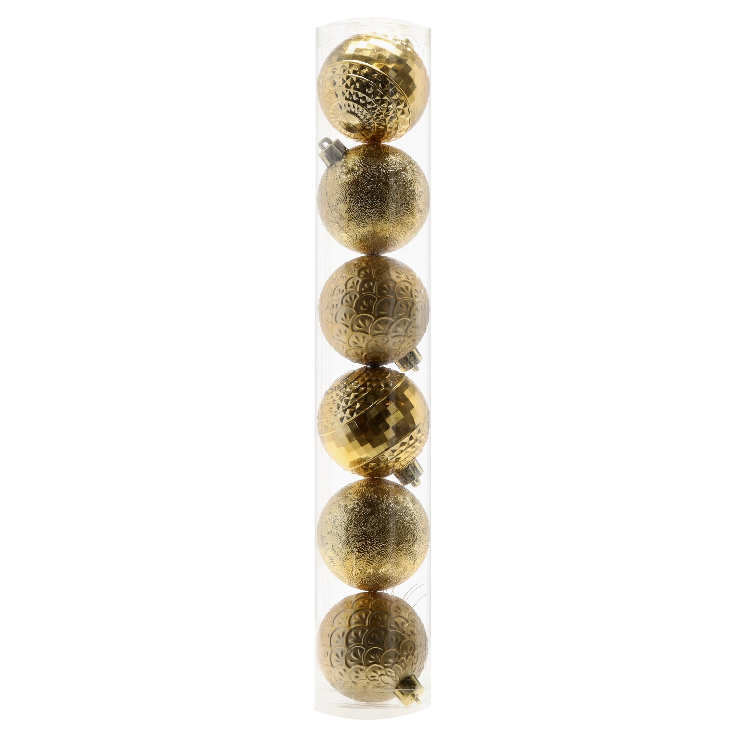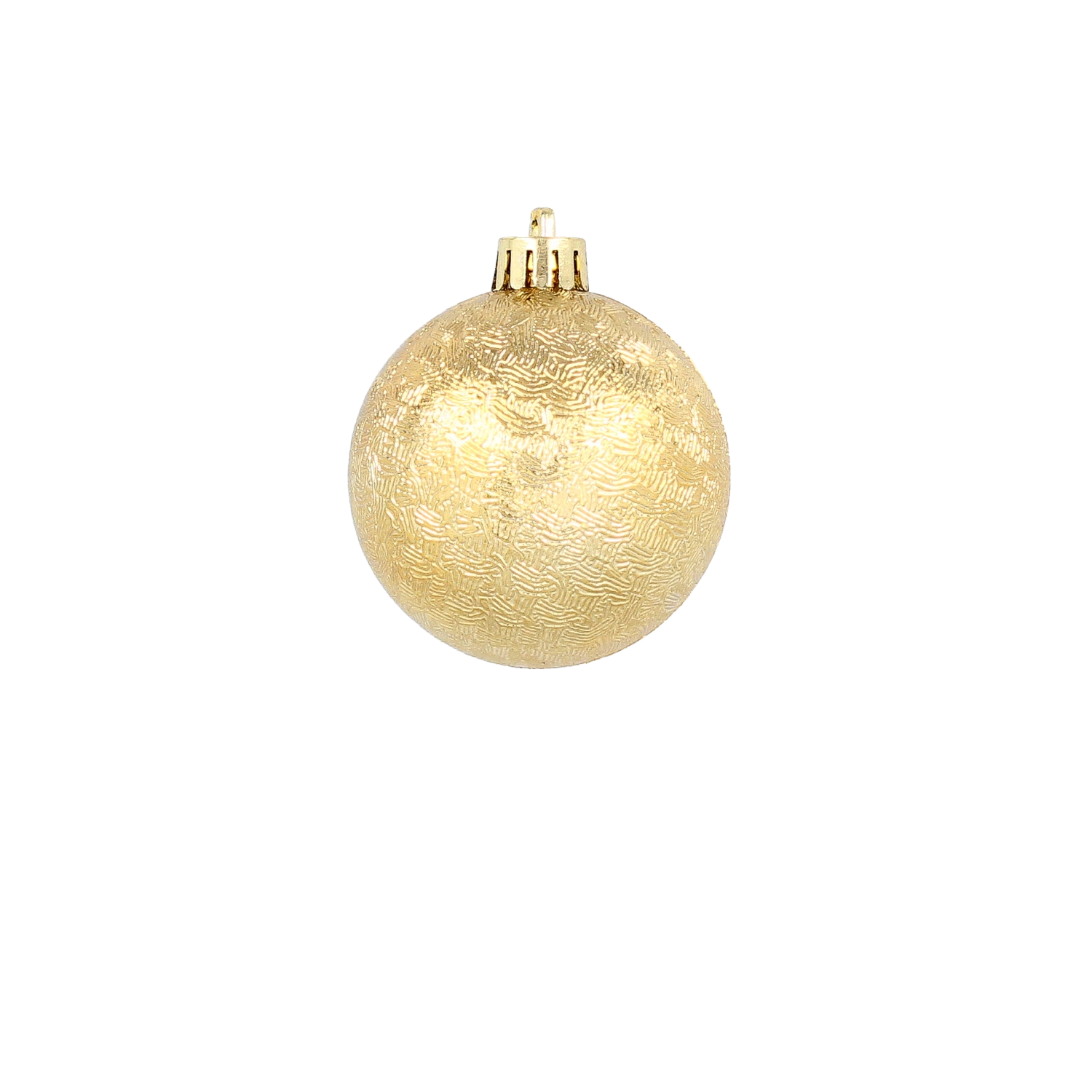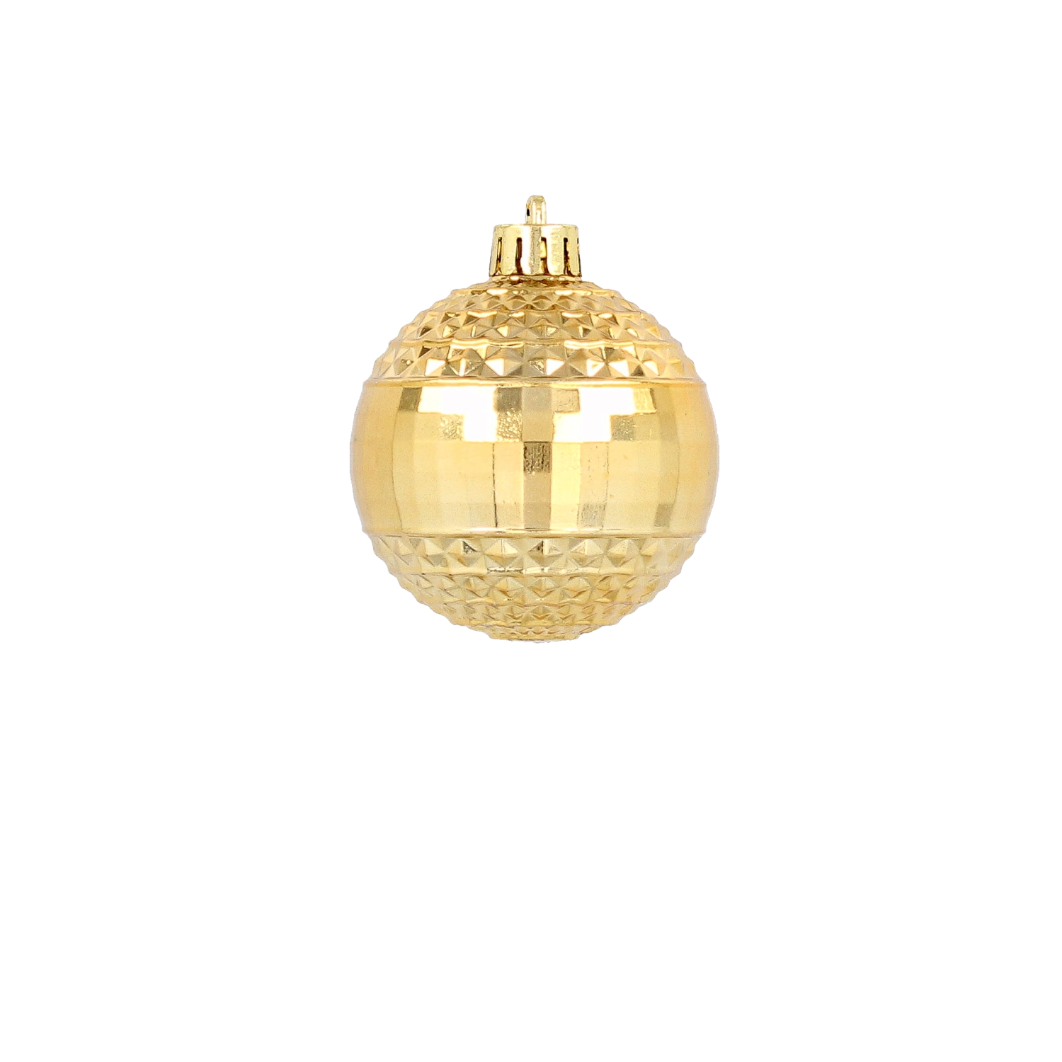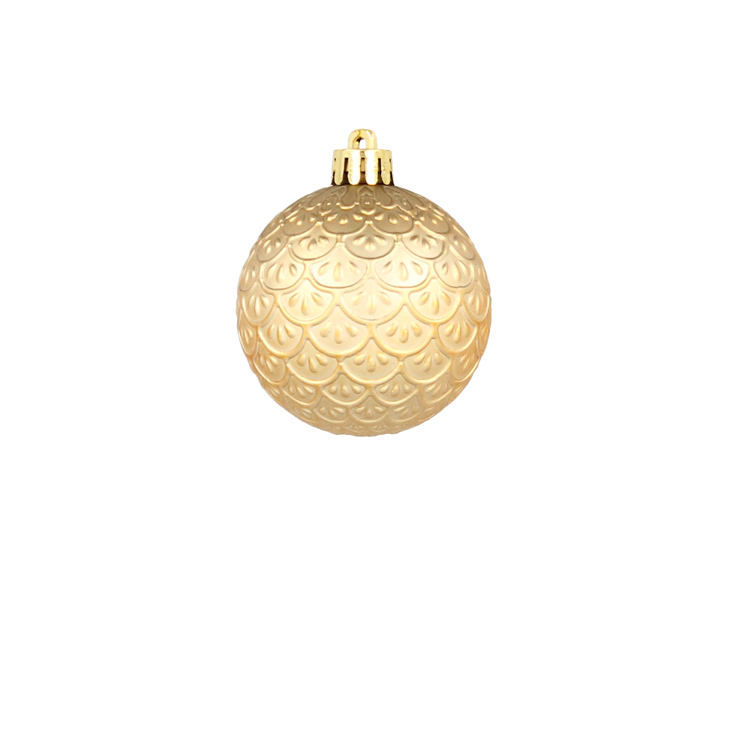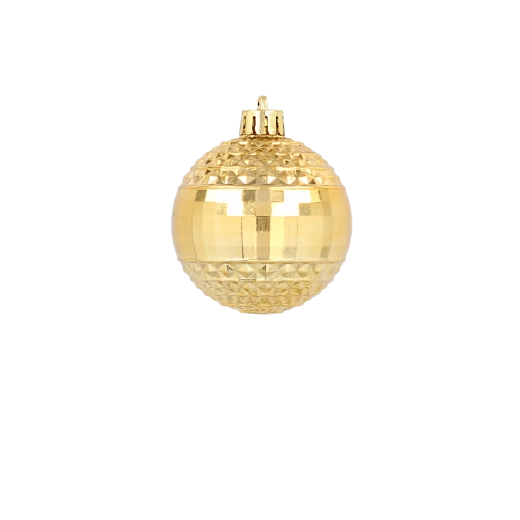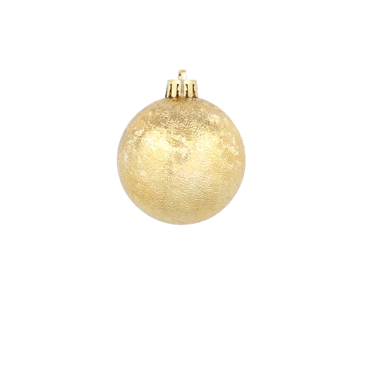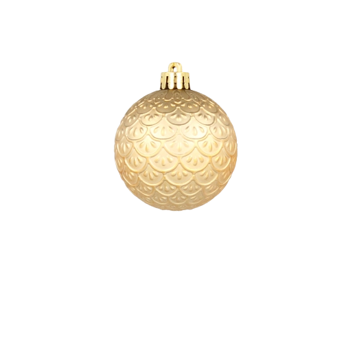 Złote ozdoby z mieszanką powierzchni reliefowych, brokatowych i fasetowanych nadają choince ciepły blask i świąteczną elegancję. Lekkie, nietłukące tworzywo jest bezpieczne i łatwe w zawieszaniu.