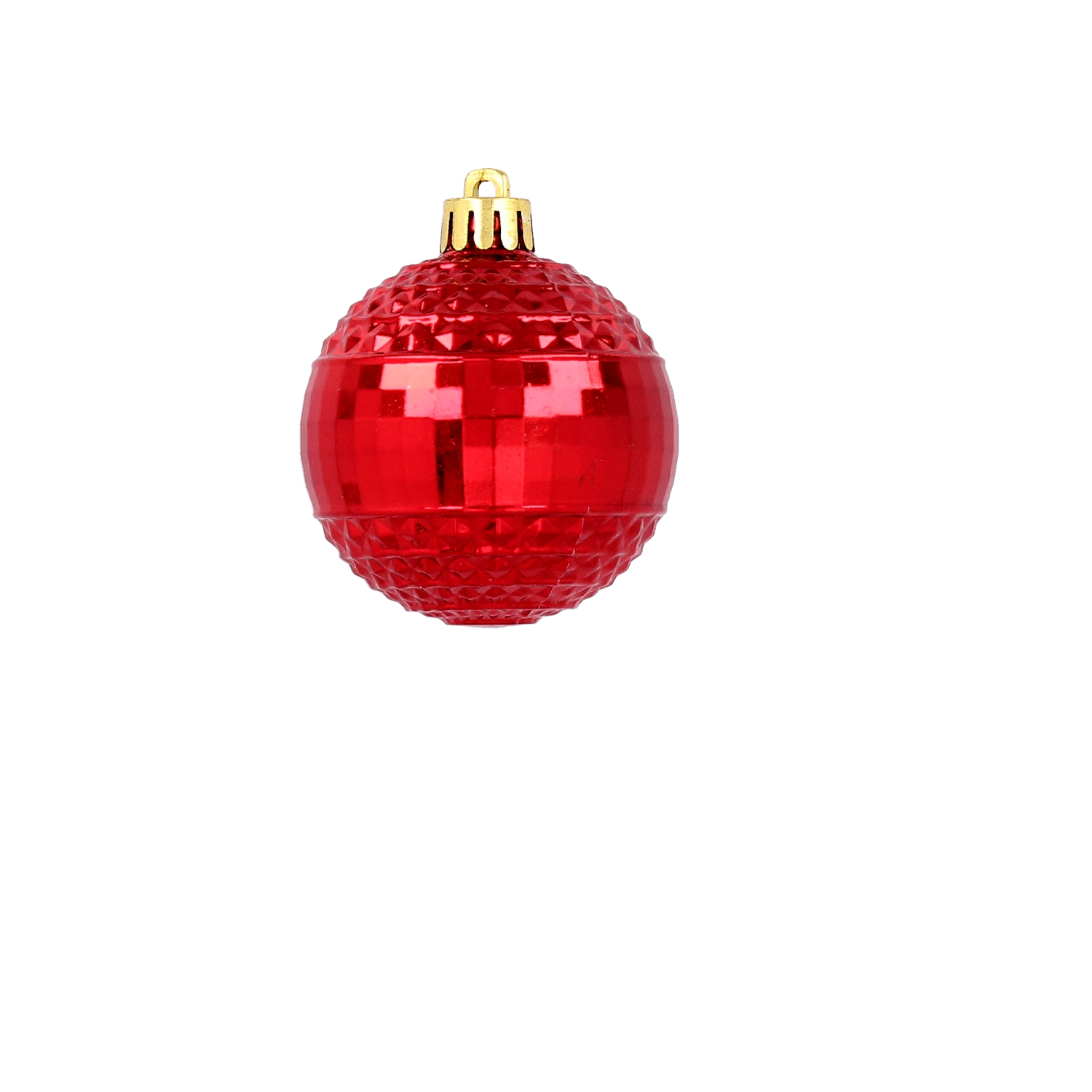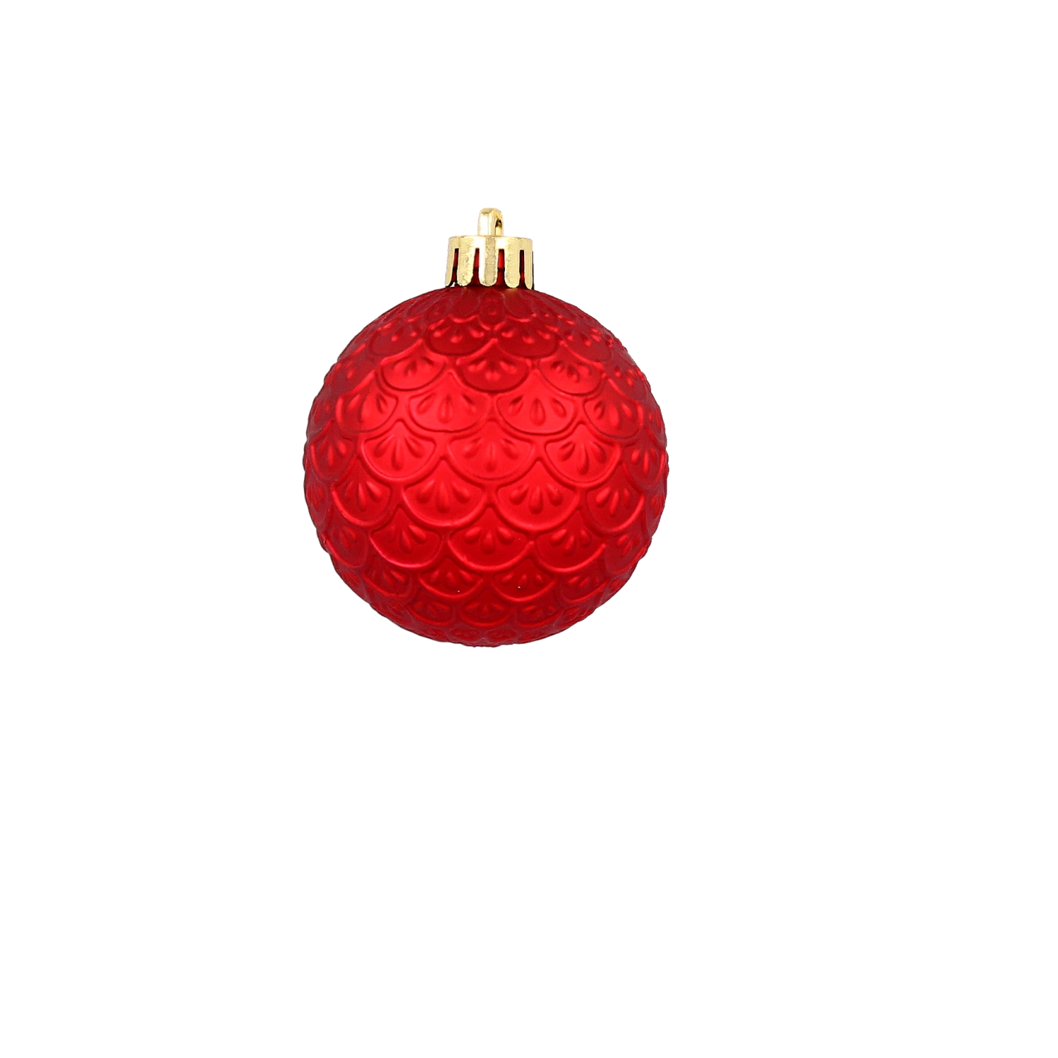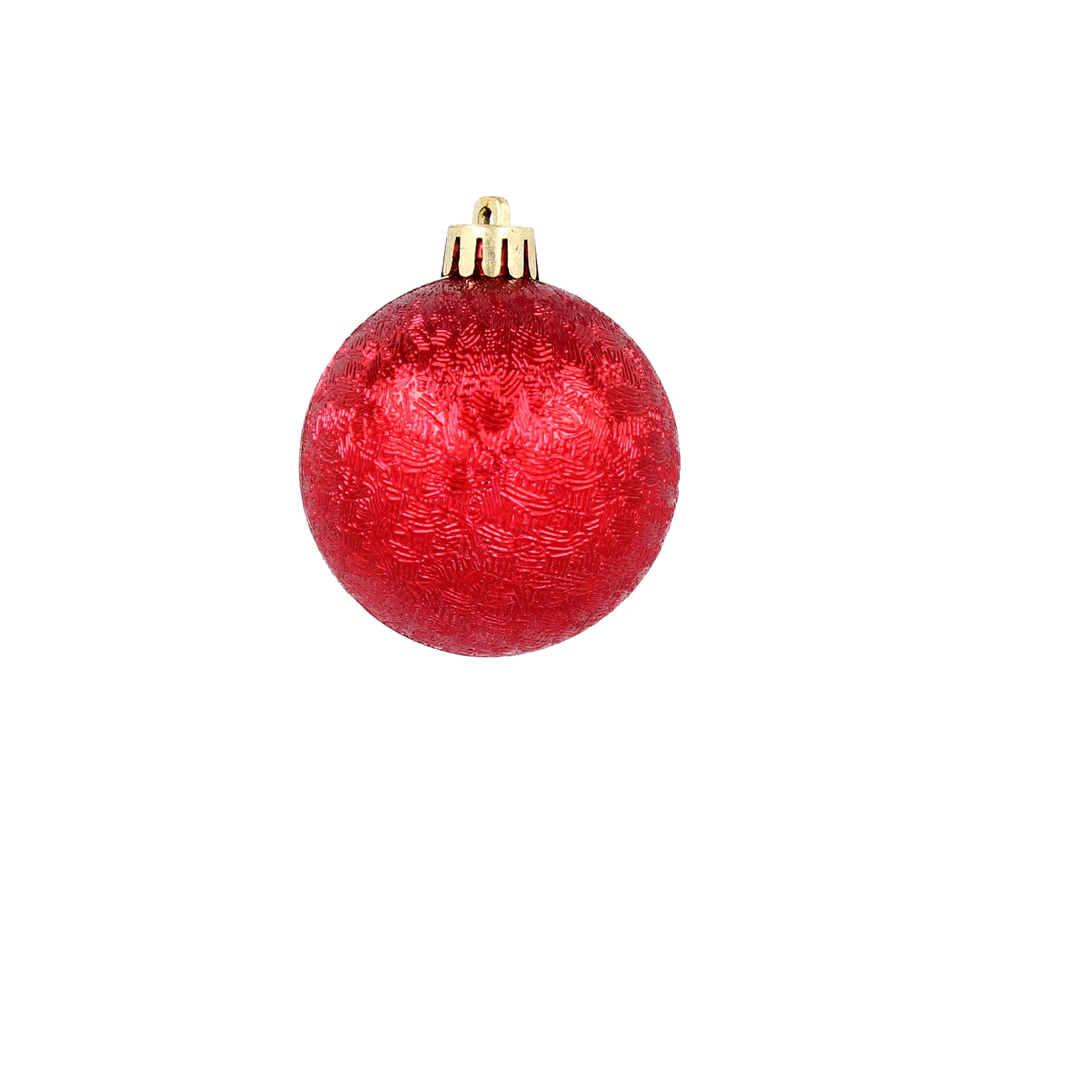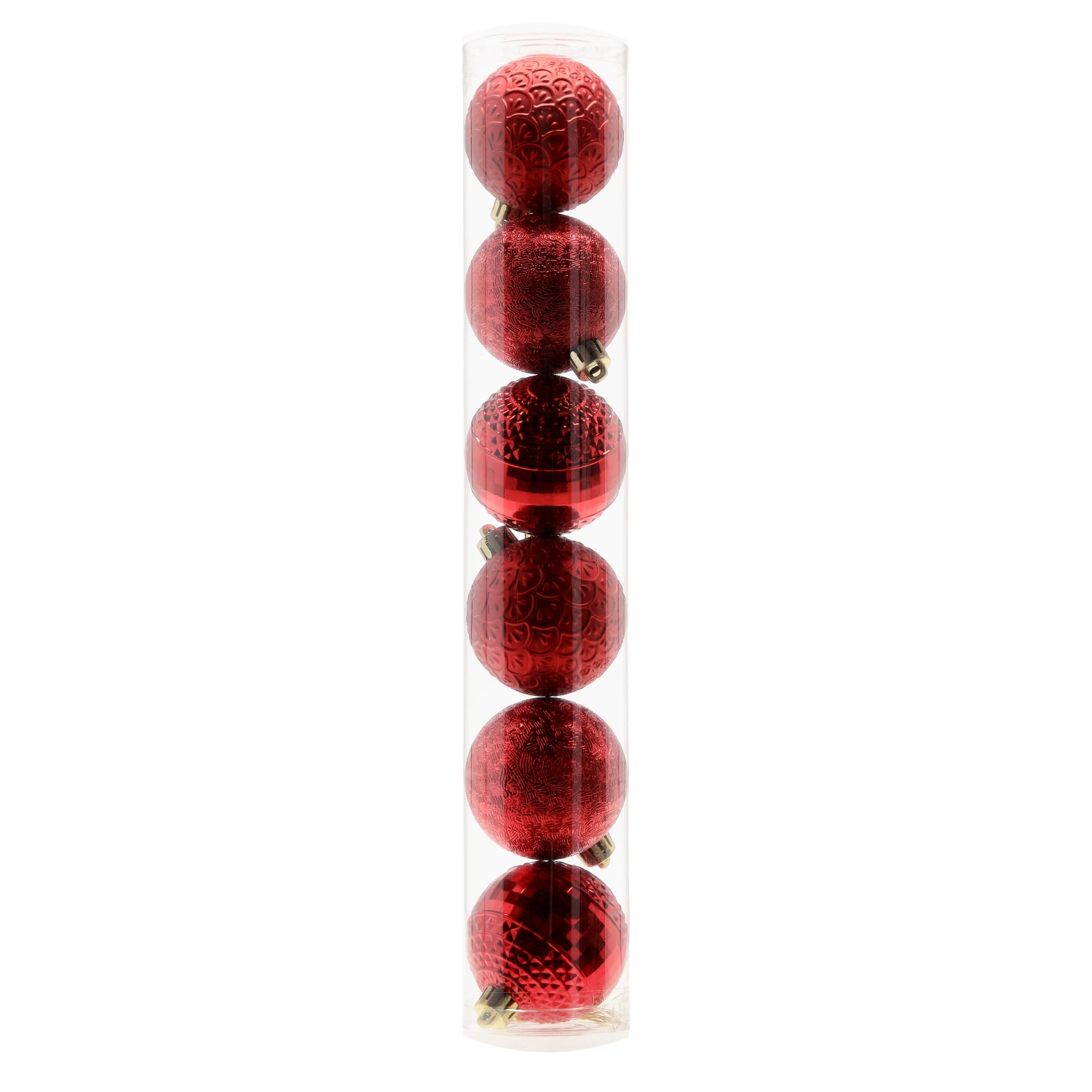 Nasycone czerwone kule z połyskującymi i strukturalnymi wzorami podkreślą klasyczną świąteczną atmosferę. Dzięki złotym czapeczkom zawieszek powiesisz je w kilka chwil.