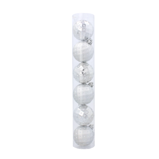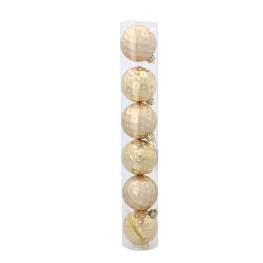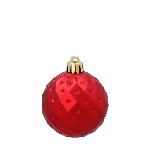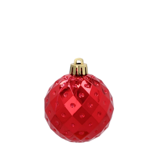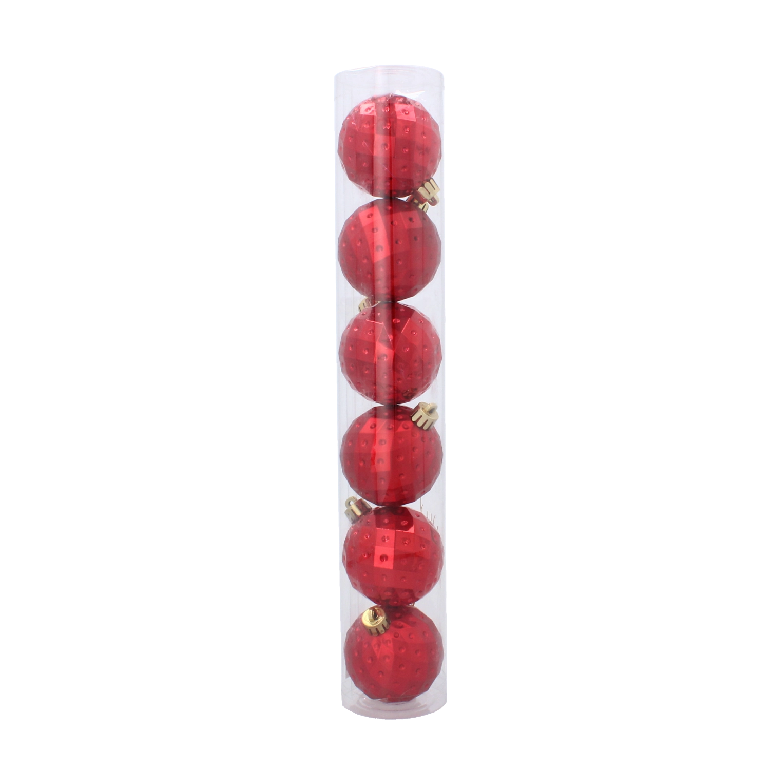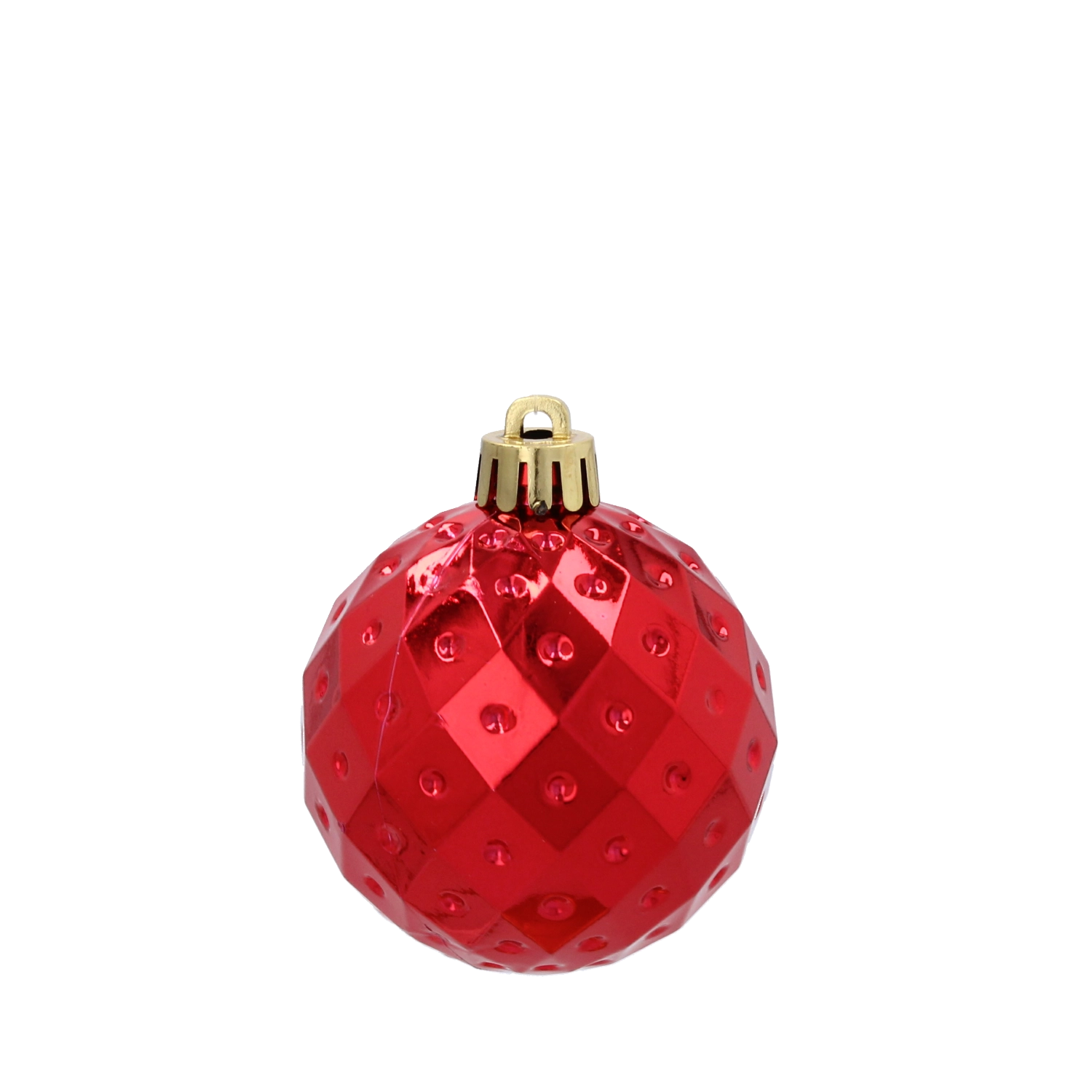 Elegancki zestaw sześciu bombek choinkowych o średnicy 6 cm w połączeniu kolorów czerwonego, złotego i srebrnego rozświetli każdą choinkę. Ozdoby wykonane są z nietłukącego plastiku dla bezpiecznego użytkowania, mają nowoczesny geometryczny relief i są dostarczane w praktycznej, przezroczystej tubie ze sznureczkami do łatwego zawieszania.