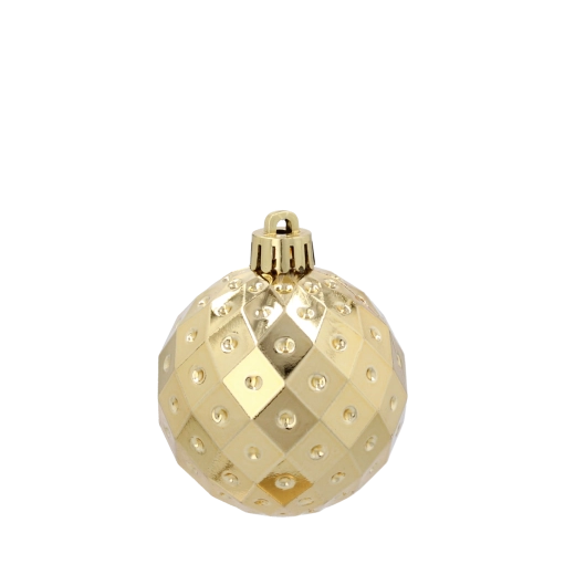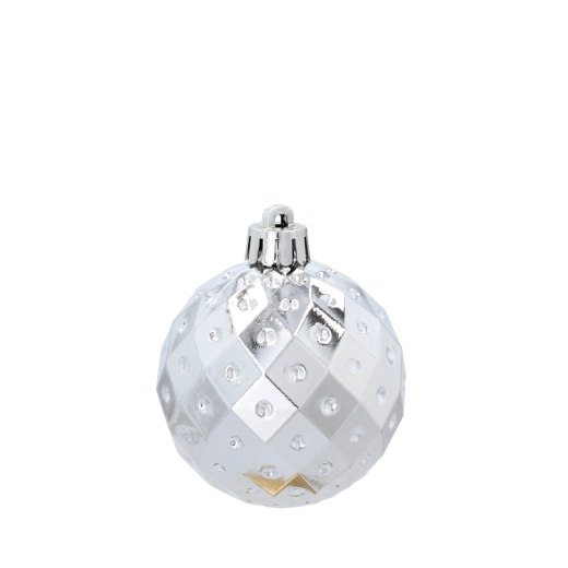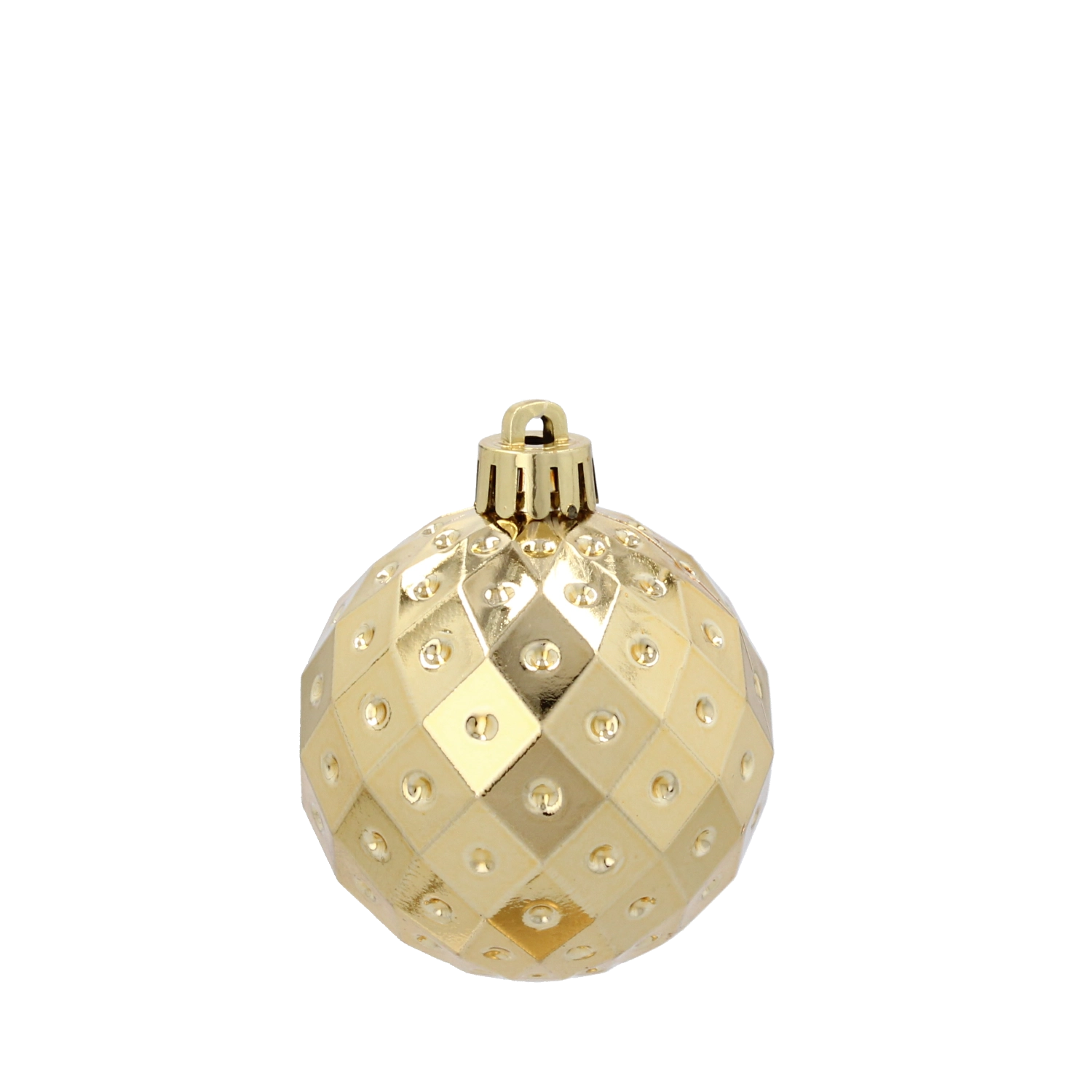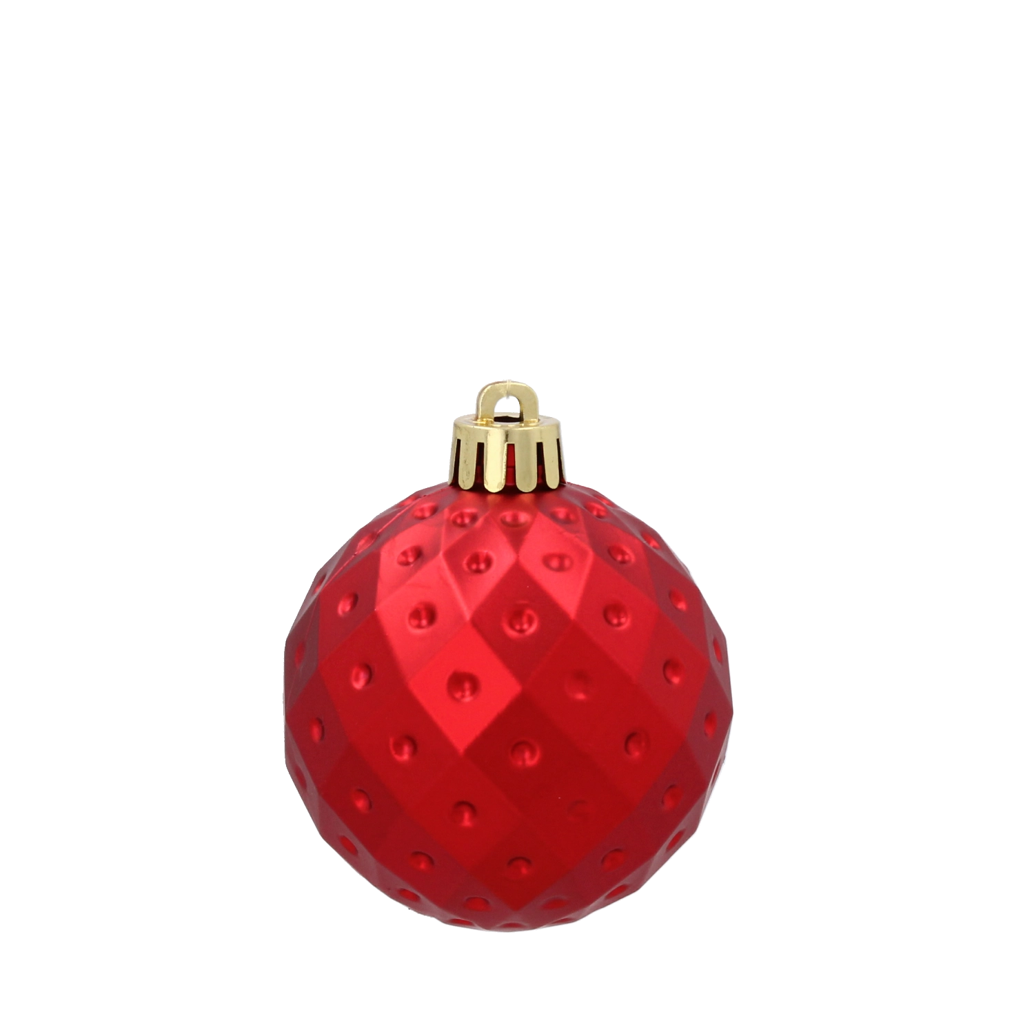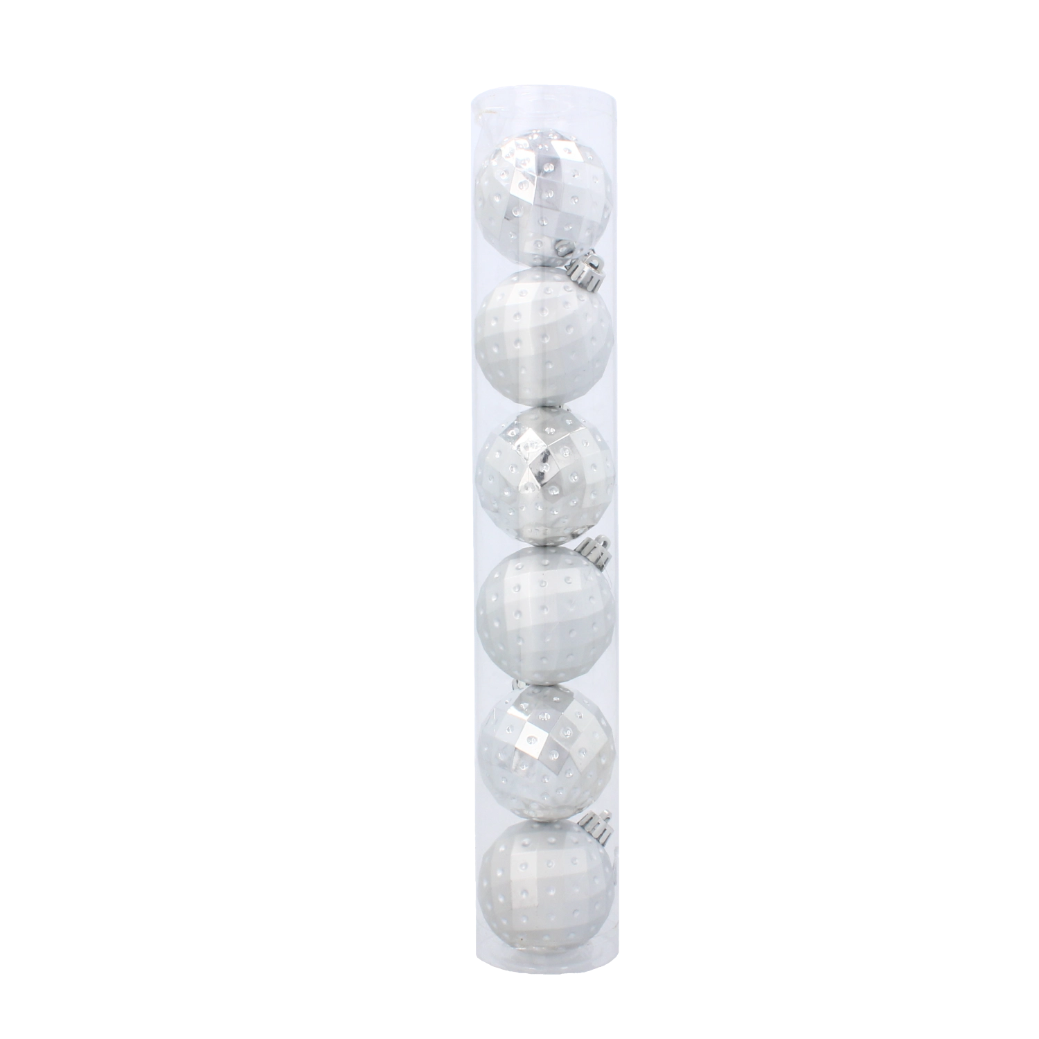 Elegancki zestaw sześciu bombek choinkowych o średnicy 6 cm w połączeniu kolorów czerwonego, złotego i srebrnego rozświetli każdą choinkę. Ozdoby wykonane są z nietłukącego plastiku dla bezpiecznego użytkowania, mają nowoczesny geometryczny relief i są dostarczane w praktycznej, przezroczystej tubie ze sznureczkami do łatwego zawieszania.