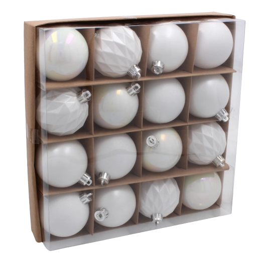 Stwórz elegancki, świąteczny nastrój z zestawem 16 białych bombek o średnicy 6 cm. Wytrzymały plastik imitujący szkło gwarantuje lekkość i bezpieczeństwo, dlatego idealnie sprawdzi się w domach z dziećmi i zwierzętami. Połączenie połysku, matu i perły nadaje choince i girlandom wyrafinowany wygląd i łatwo dopasowuje się do każdej dekoracji.