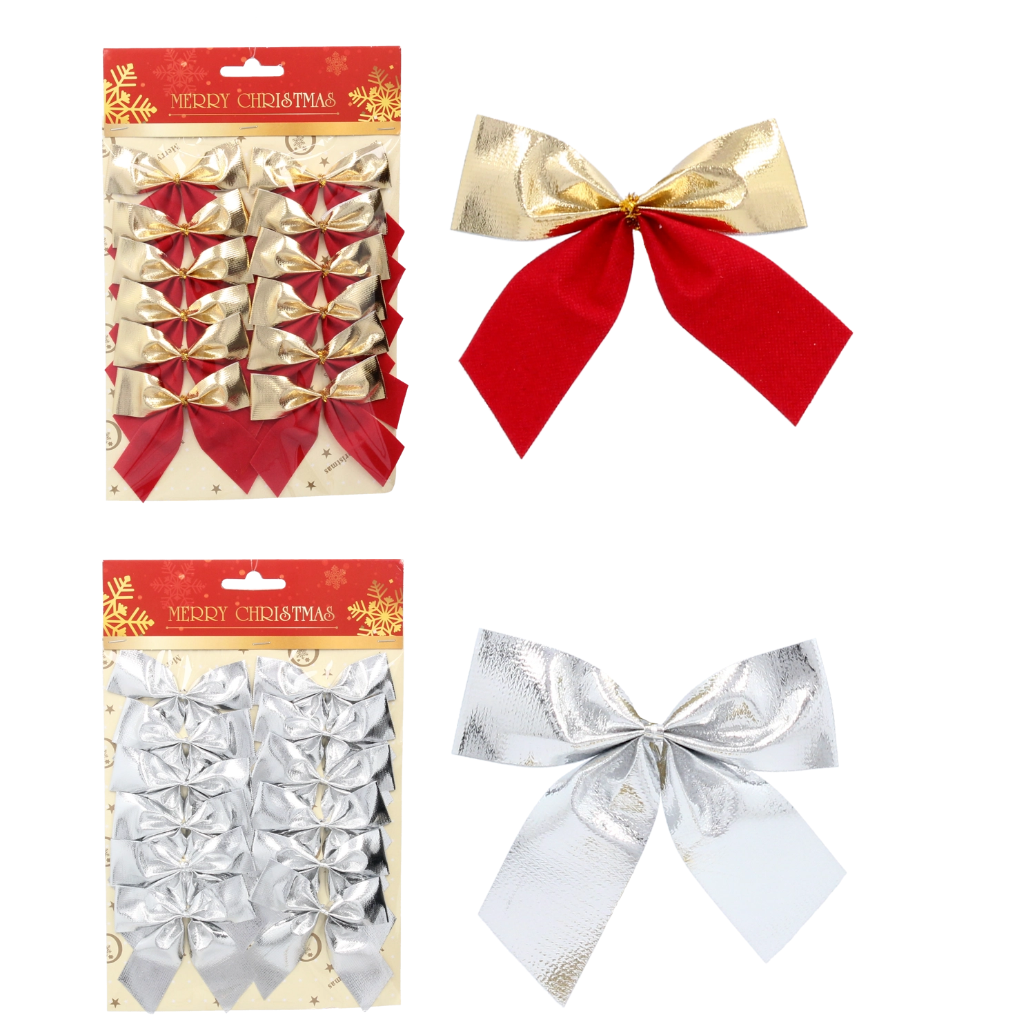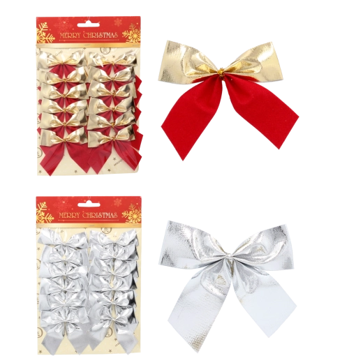 Stwórz w domu prawdziwą świąteczną atmosferę dzięki eleganckim kokardkom w połączeniu srebrnego, czerwonego i złotego. Opakowanie zawiera 12 sztuk z praktycznym drucikiem do łatwego mocowania na choince, wieńcu lub prezentach. Wysoka jakość wykonania zapewnia wielokrotne użycie przez kilka sezonów.