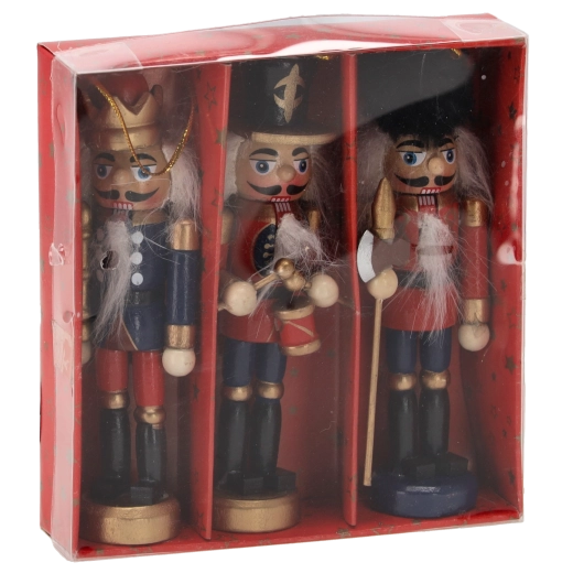 Ten zestaw trzech drewnianych ozdób w kształcie żołnierzyków doda Twoim dekoracjom eleganckiego i ponadczasowego charakteru. Wysokość 13 cm gwarantuje, że figurki świetnie się prezentują na choince czy w wiszących kompozycjach, a nasycone kolory wniosą do wnętrza żywość i świąteczny urok.