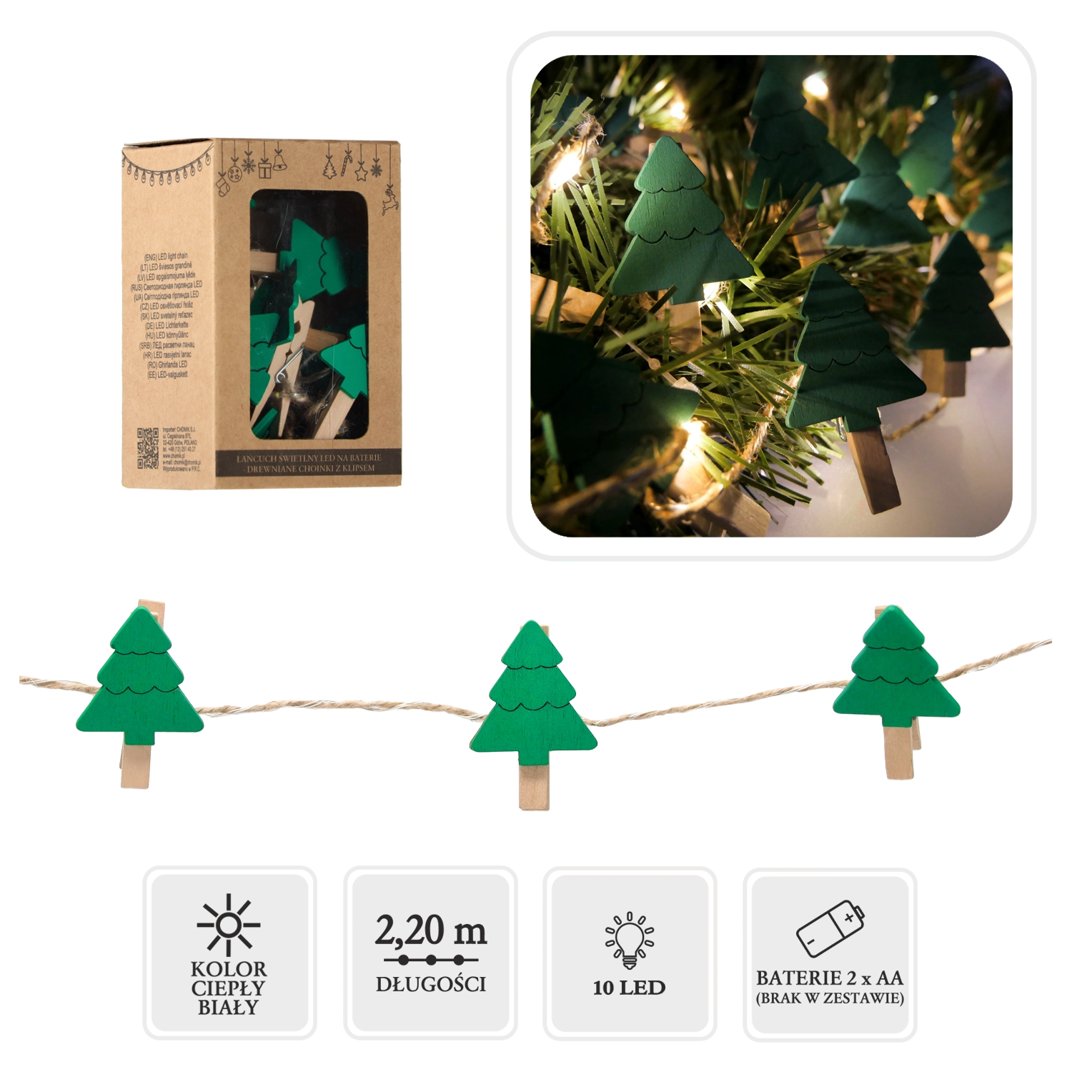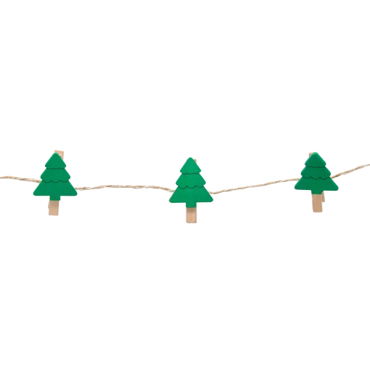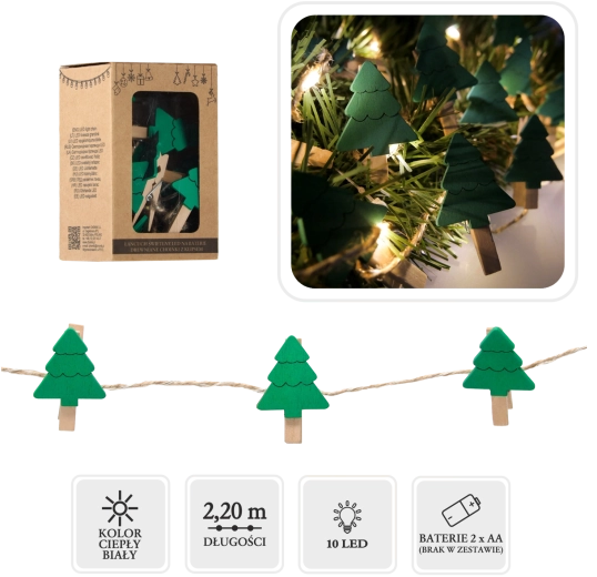 Ten dekoracyjny łańcuch LED łączy światło i funkcjonalność. Dzięki drewnianym klipsom w kształcie choinek łatwo wyeksponujesz zdjęcia, pocztówki, winietki czy drobne ozdoby. Ciepłe białe diody LED tworzą przytulne światło, które podkreśli magię Świąt w salonie, pokoju dziecięcym oraz na odświętnie nakrytym stole.