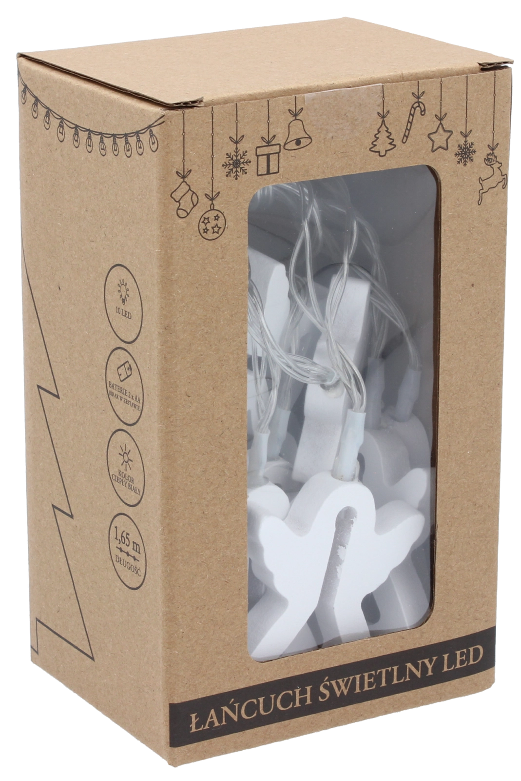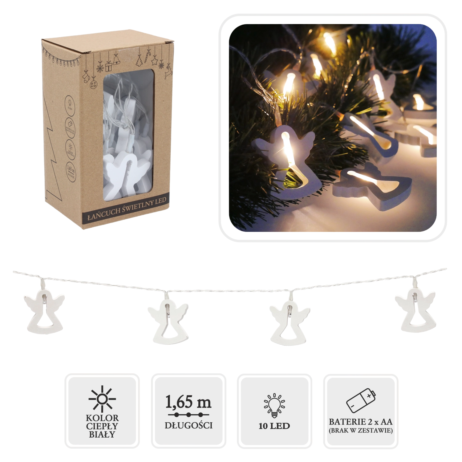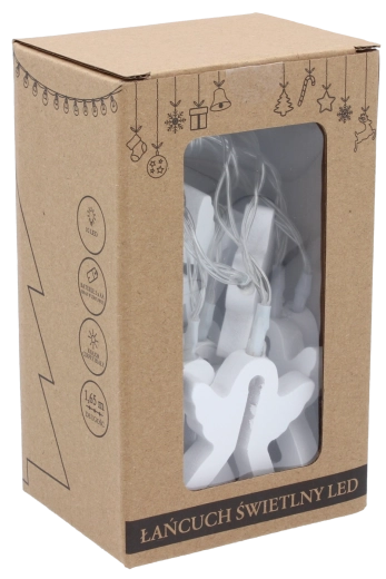 Elegancki łańcuch LED z drewnianymi aniołkami stworzy przytulny i świąteczny nastrój w każdym wnętrzu. Dzięki ciepłemu białemu światłu podkreślona zostaje naturalna struktura drewna, a dekoracja prezentuje się przyjemnie i harmonijnie. Zasilanie 2× bateriami AA pozwala umieścić łańcuch gdziekolwiek bez troski o kable.