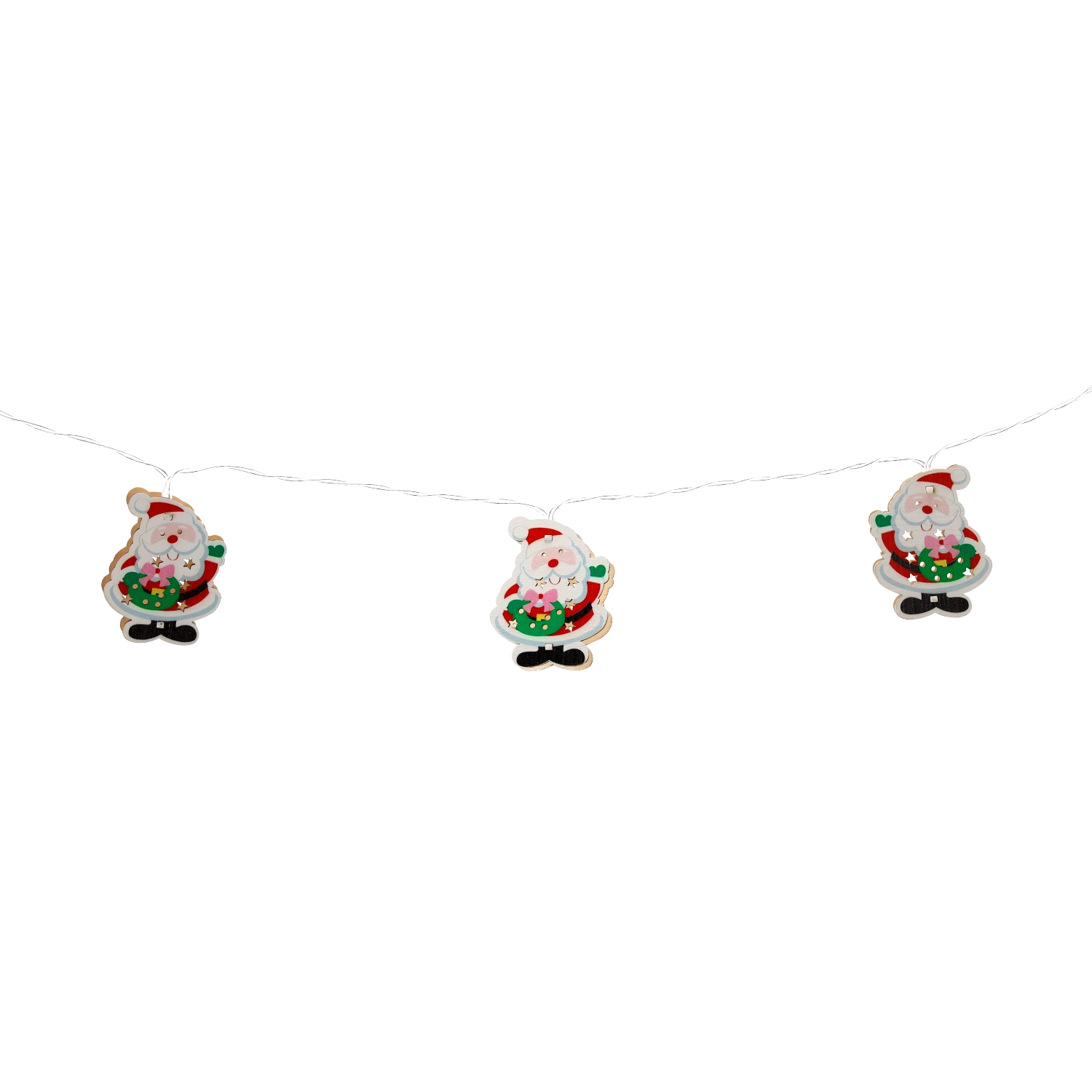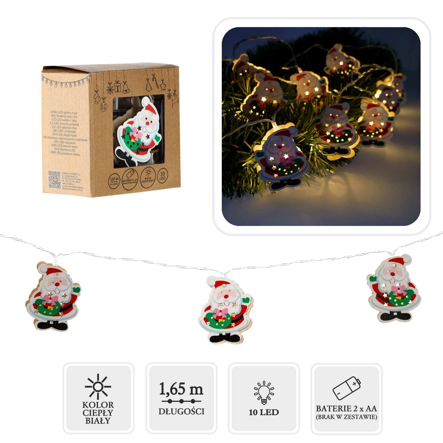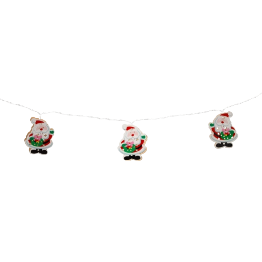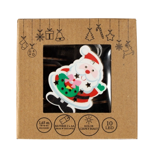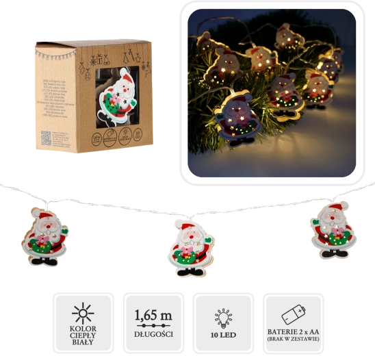 Stylowy drewniany łańcuch świetlny z Mikołajem doskonale sprawdzi się w świątecznej aranżacji wnętrz. Dzięki ciepłemu białemu światłu działa przyjemnie i kojąco, a lekka konstrukcja i cienki przewód ułatwiają aranżację na choince, wieńcu, balustradzie czy półce.