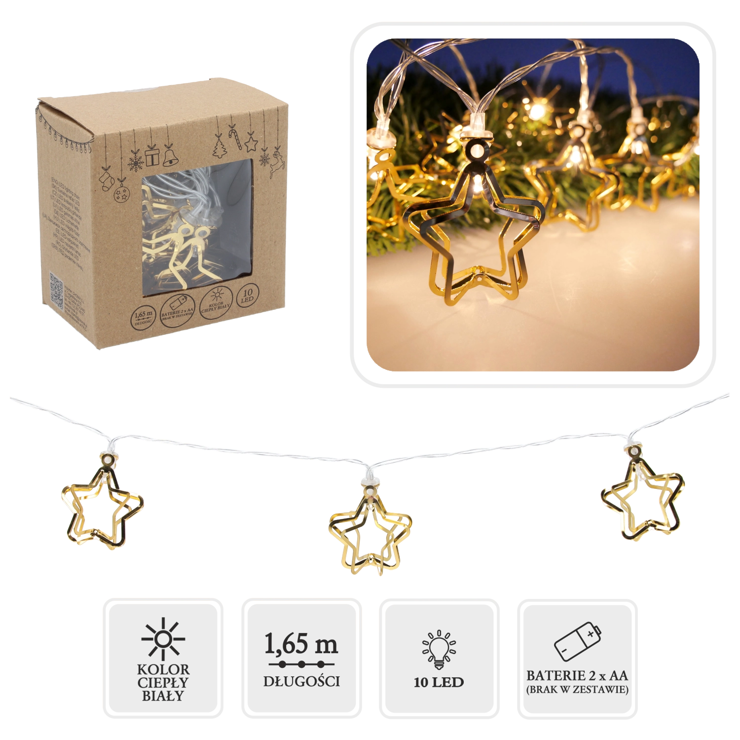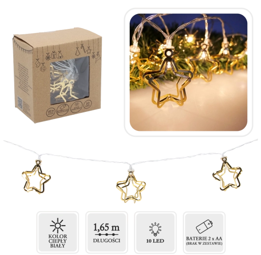 Wprowadź do swojego domu magię Świąt dzięki stylowemu łańcuchowi LED z złotymi metalowymi gwiazdami 3D. Ciepłe białe światło tworzy przytulną atmosferę, a dzięki zasilaniu bateryjnemu (2× AA) umieścisz go wszędzie bez kabli – na stole, komodzie, kominku czy wieńcu.