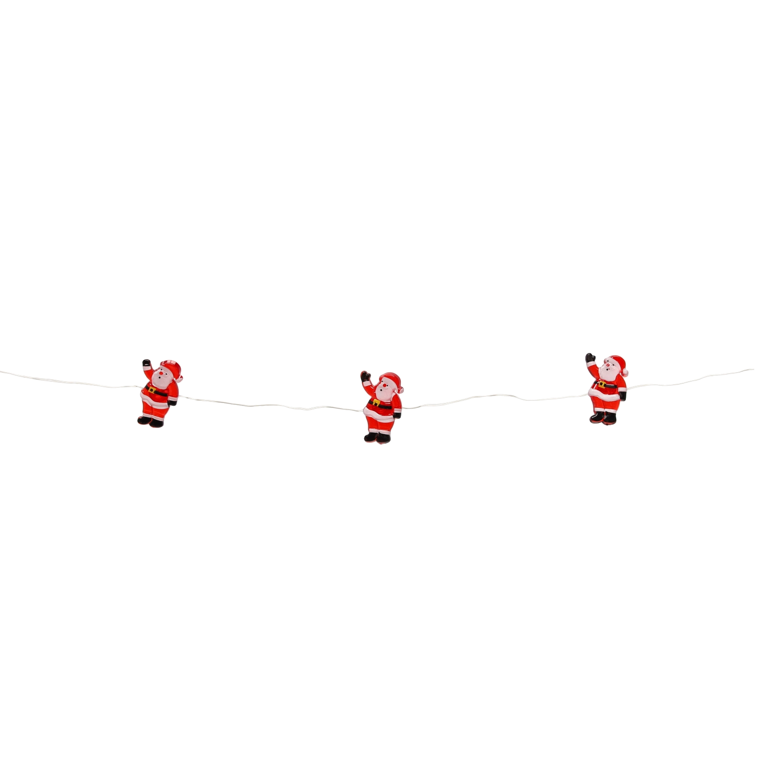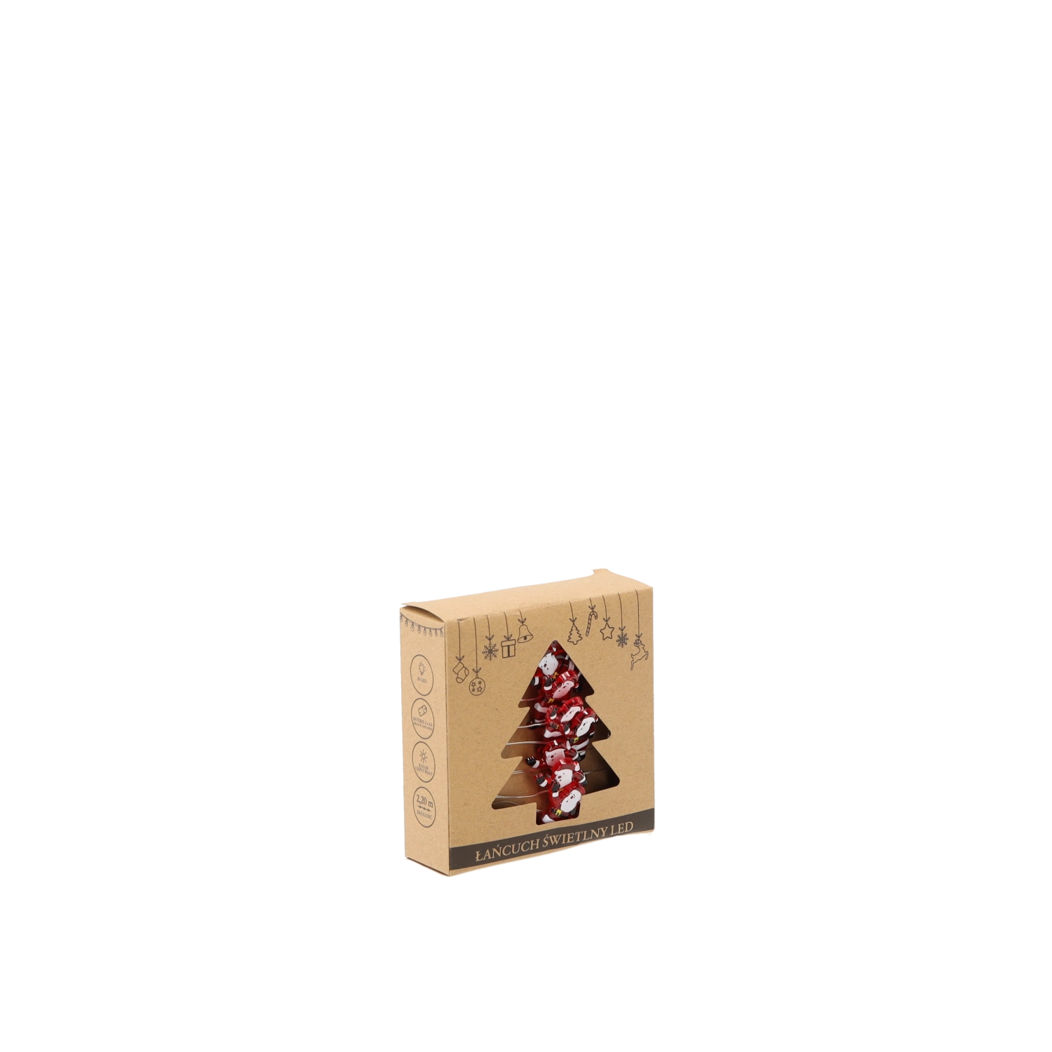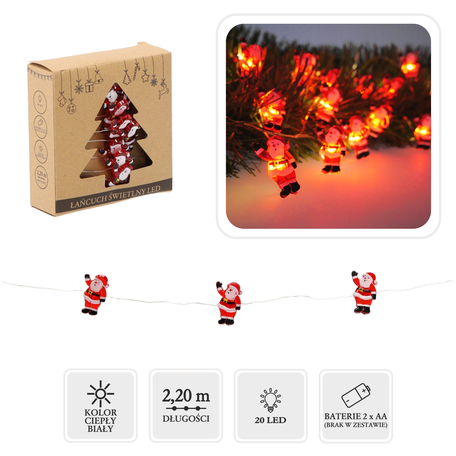 Świąteczny łańcuch świetlny z MIKOŁAJEM to radosna dekoracja, która natychmiast wprowadza do wnętrza przytulny, ciepły klimat. Każdą diodę LED zdobi uroczy motyw Świętego Mikołaja, który pięknie prezentuje się na gałązkach choinki, na kominku oraz w pokoju dziecięcym.